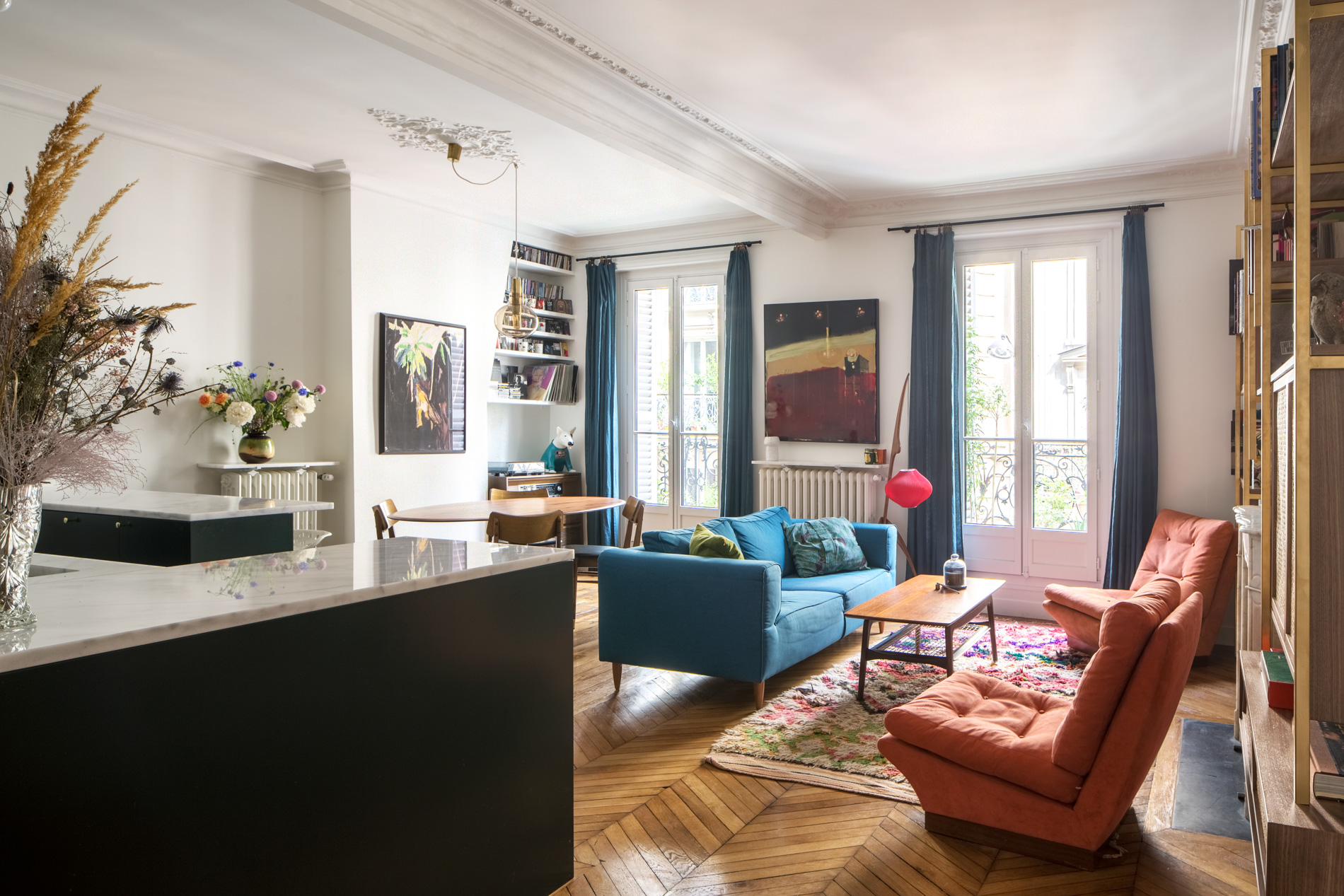 Notre intervention a débuté par un travail minutieux de dépose, révélant les trésors dissimulés : un classique parquet à chevrons d’origine, des moulures oubliées et des cheminées cachées. Ces éléments sont devenus les points d’ancrage de notre projet.