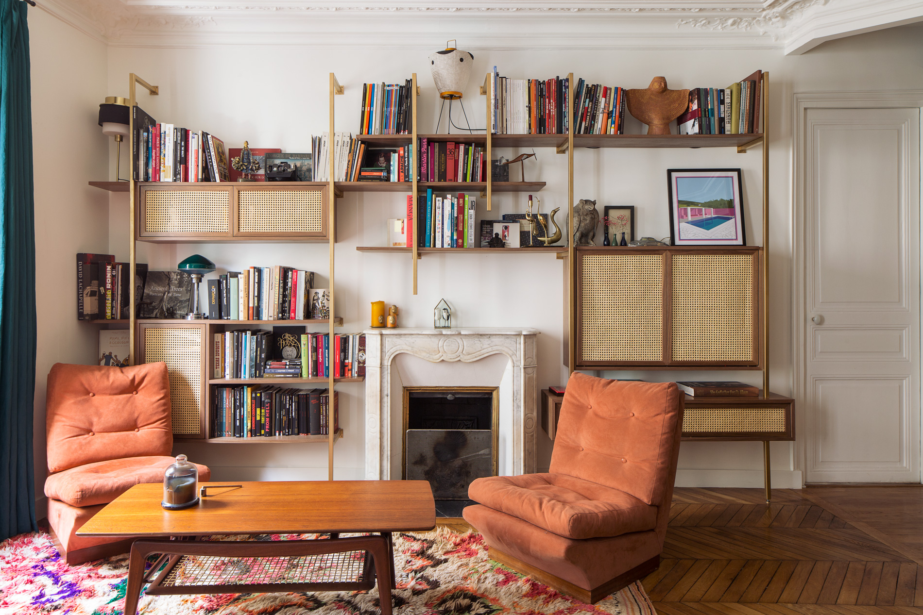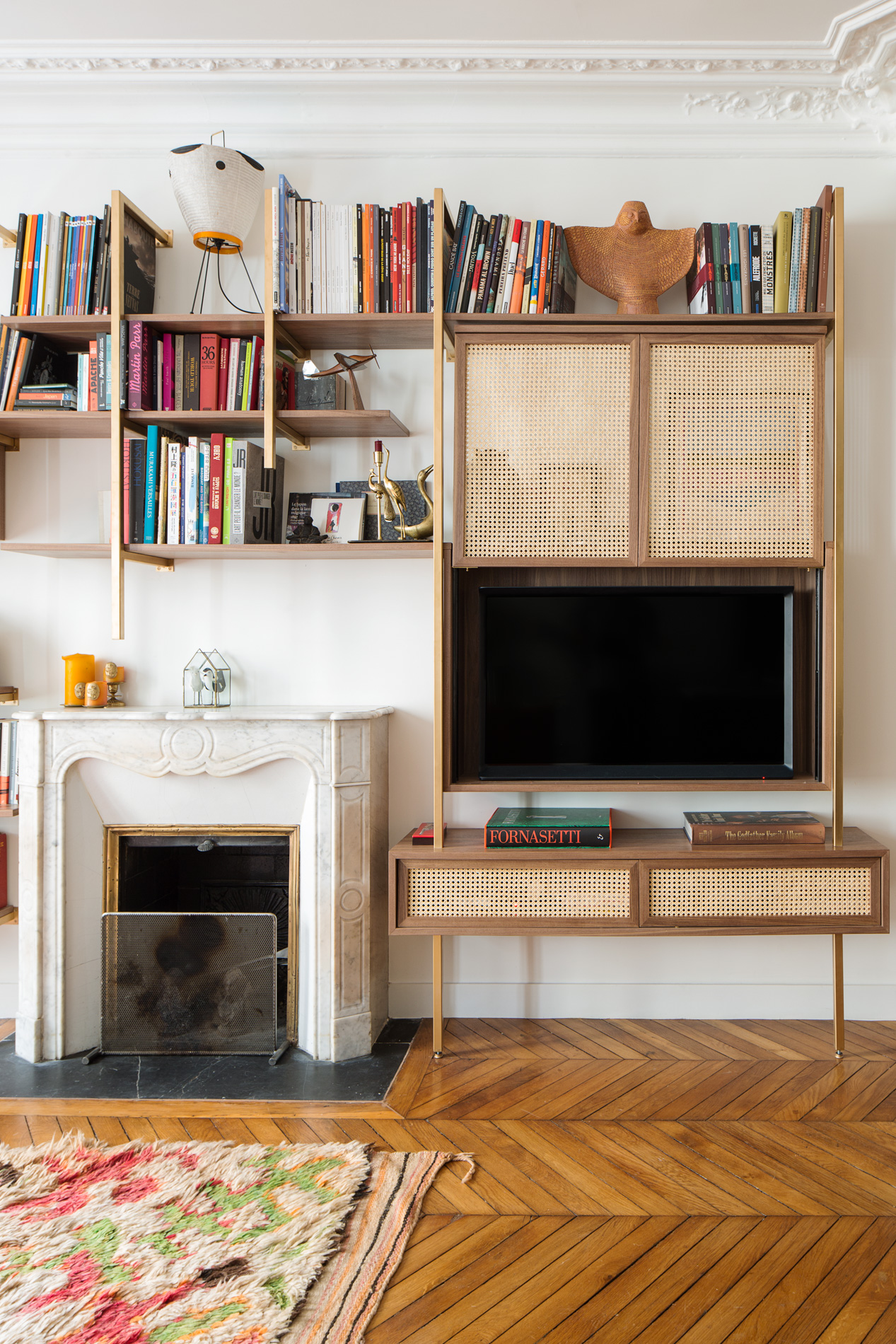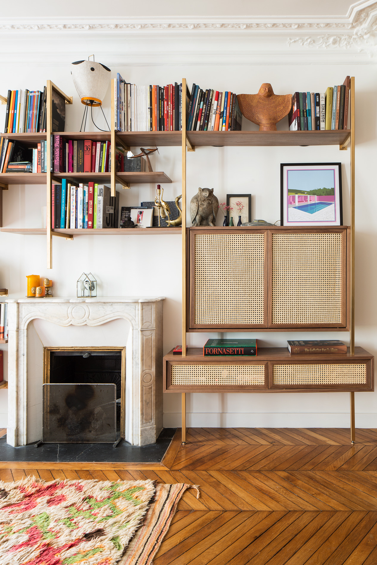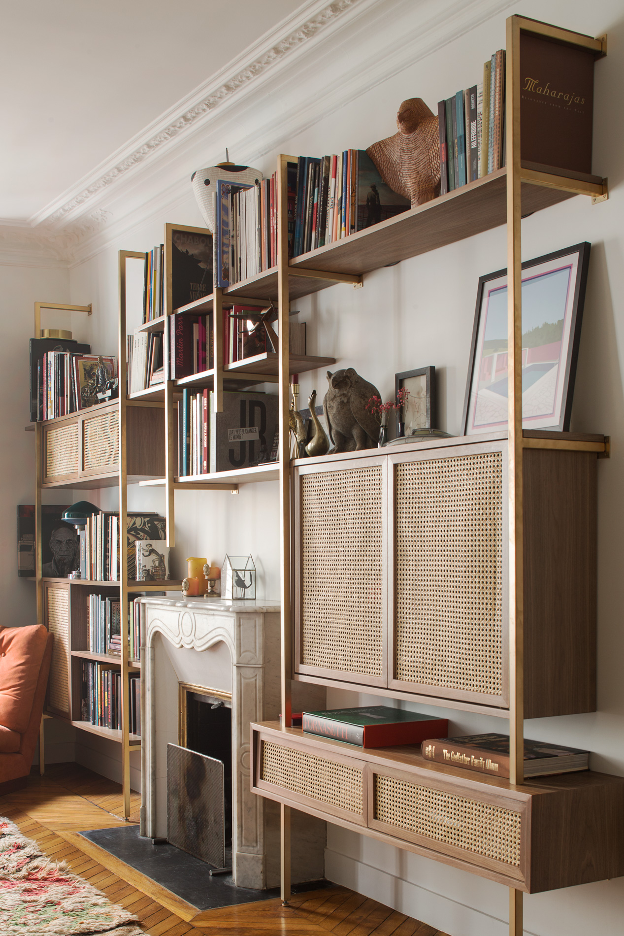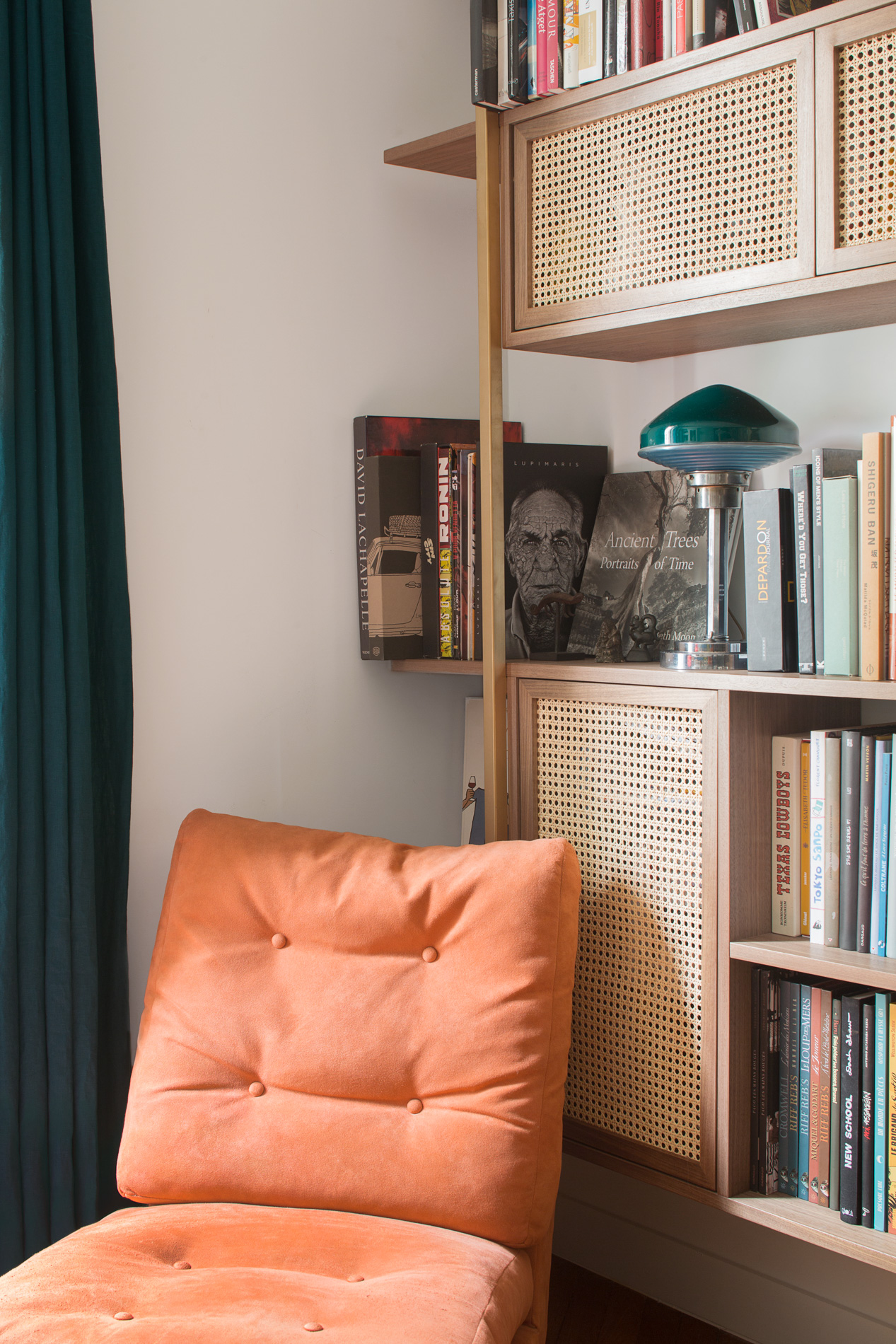Pour rendre ce lieu unique, nous avons dessiné une bibliothèque sur mesure en laiton et noyer autour d’une cheminée dont nous avons inversé l’utilisation pour qu’elle ouvre sur le salon et non plus sur la chambre attenante. Cette pièce de mobilier, aussi légère que raffinée, met en valeur la collection de livres tout en dissimulant discrètement la télévision, créant ainsi un équilibre parfait entre esthétique et fonctionnalité.
