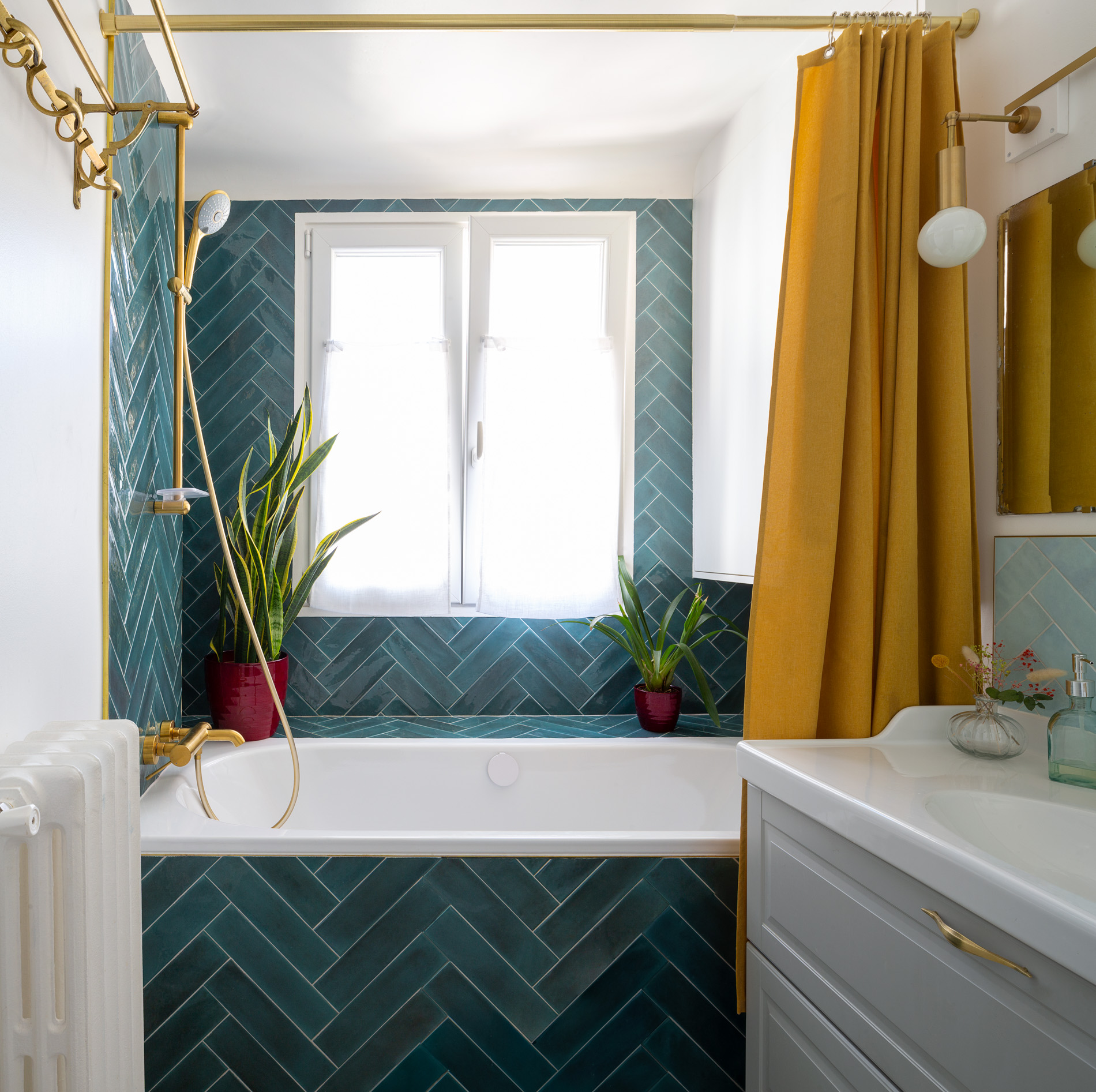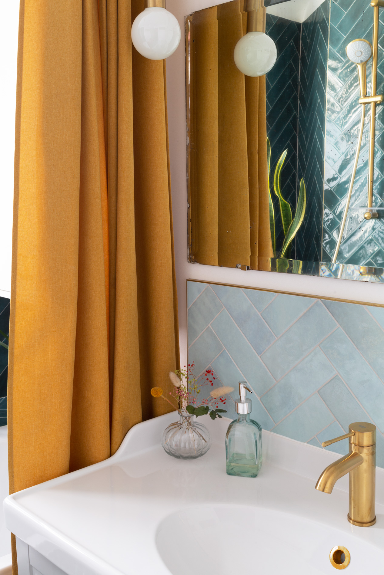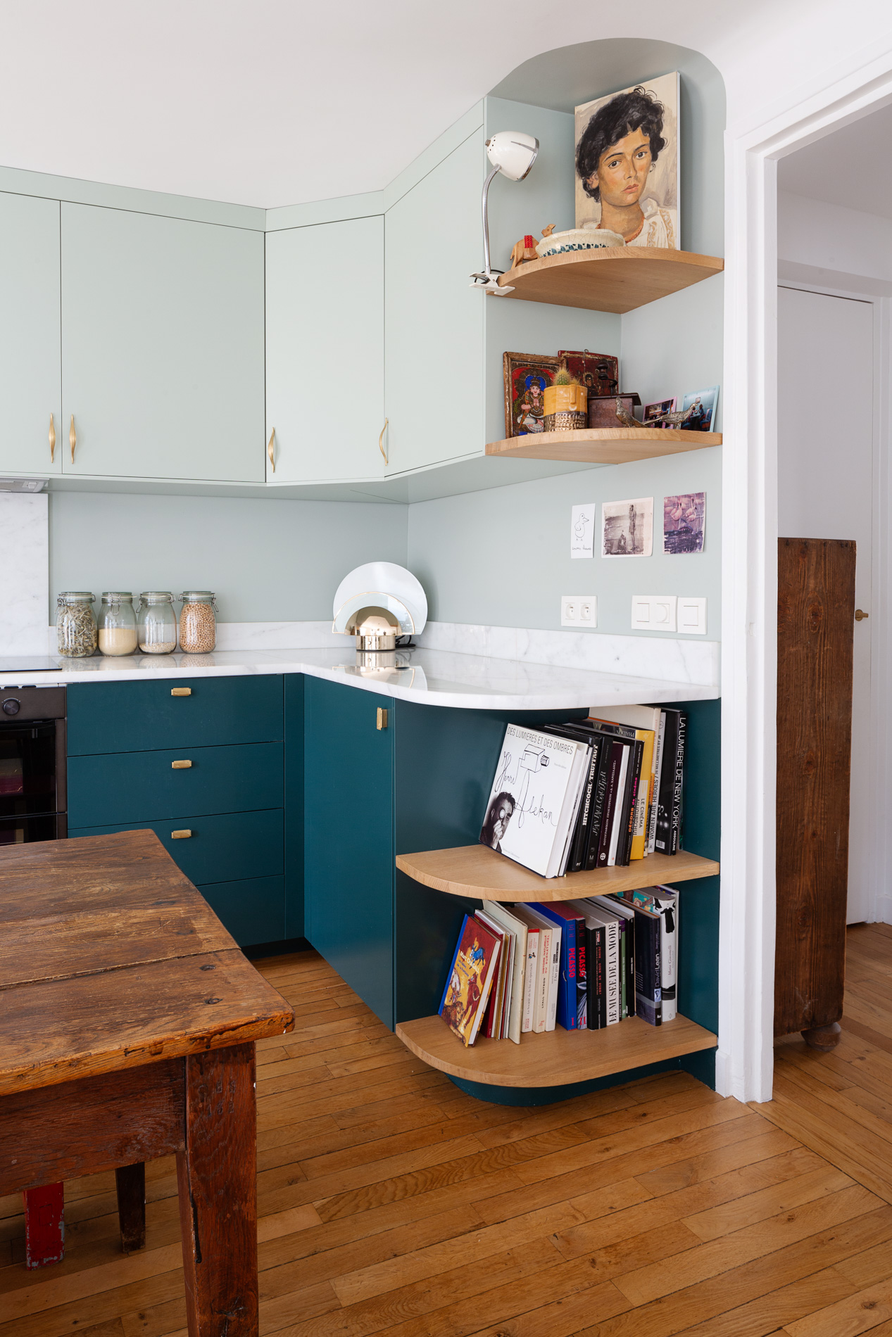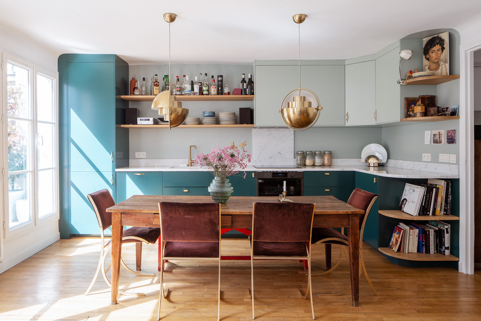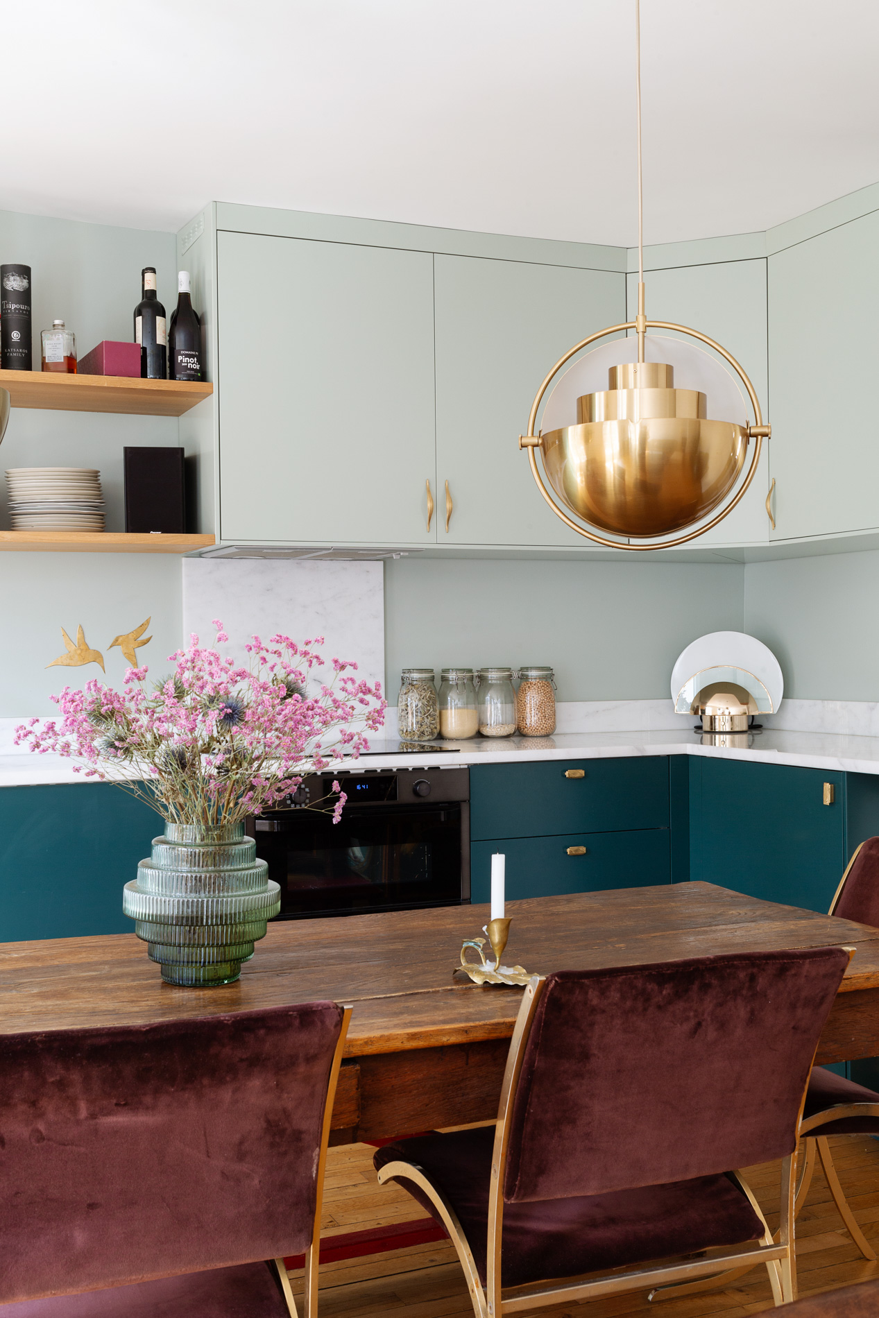 En harmonie avec les aspirations de la propriétaire, passionnée de décoration et d’objets vintage, nous avons revisité les codes de l’Art Déco pour créer une ambiance unique en jouant notamment de palettes de couleurs propres à cette époque. Les matières et objets soigneusement sélectionnés se répondent dans une composition éclectique maîtrisée, respectant l’esprit architectural des années 20 tout en l’inscrivant dans la modernité.