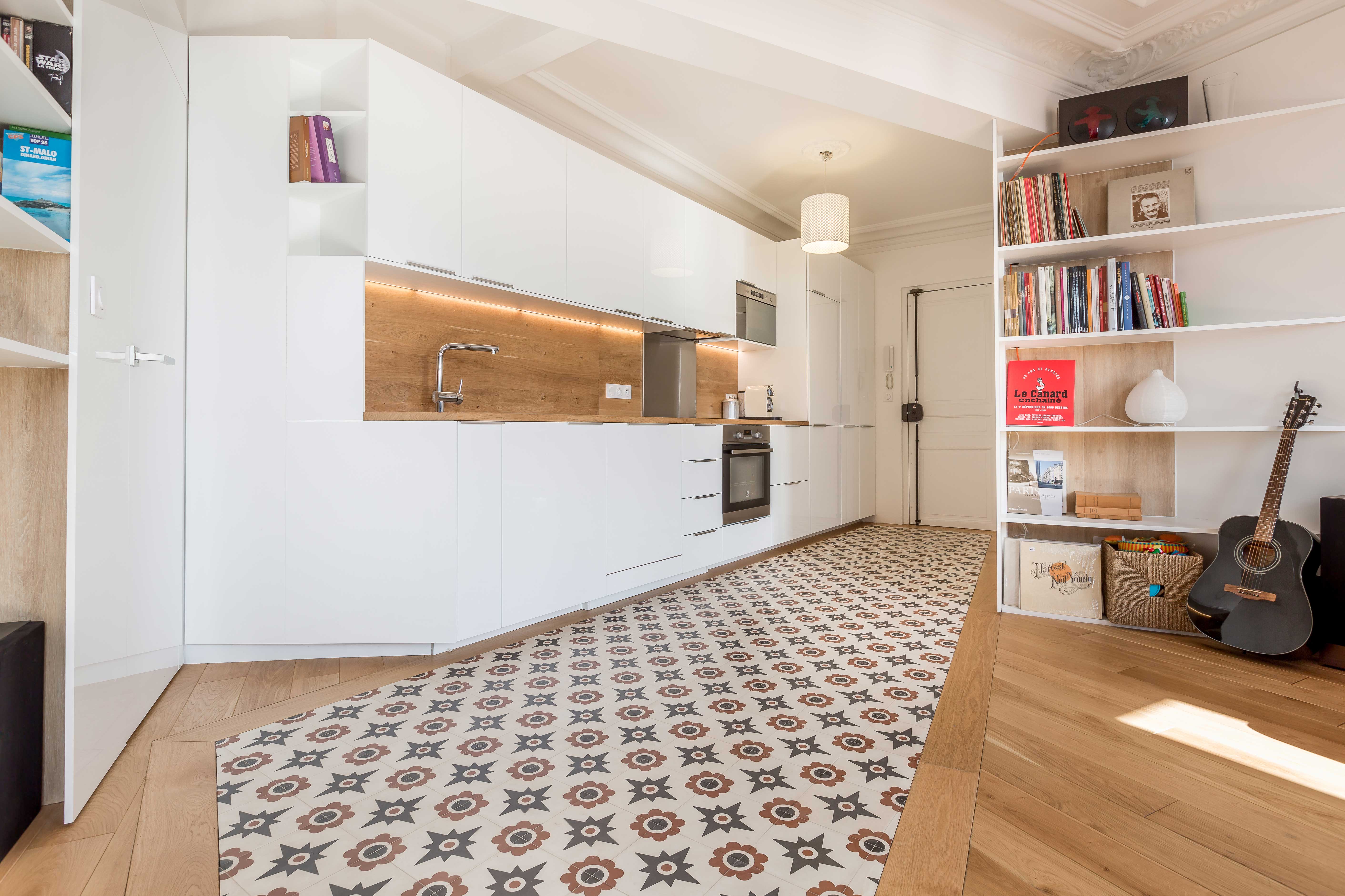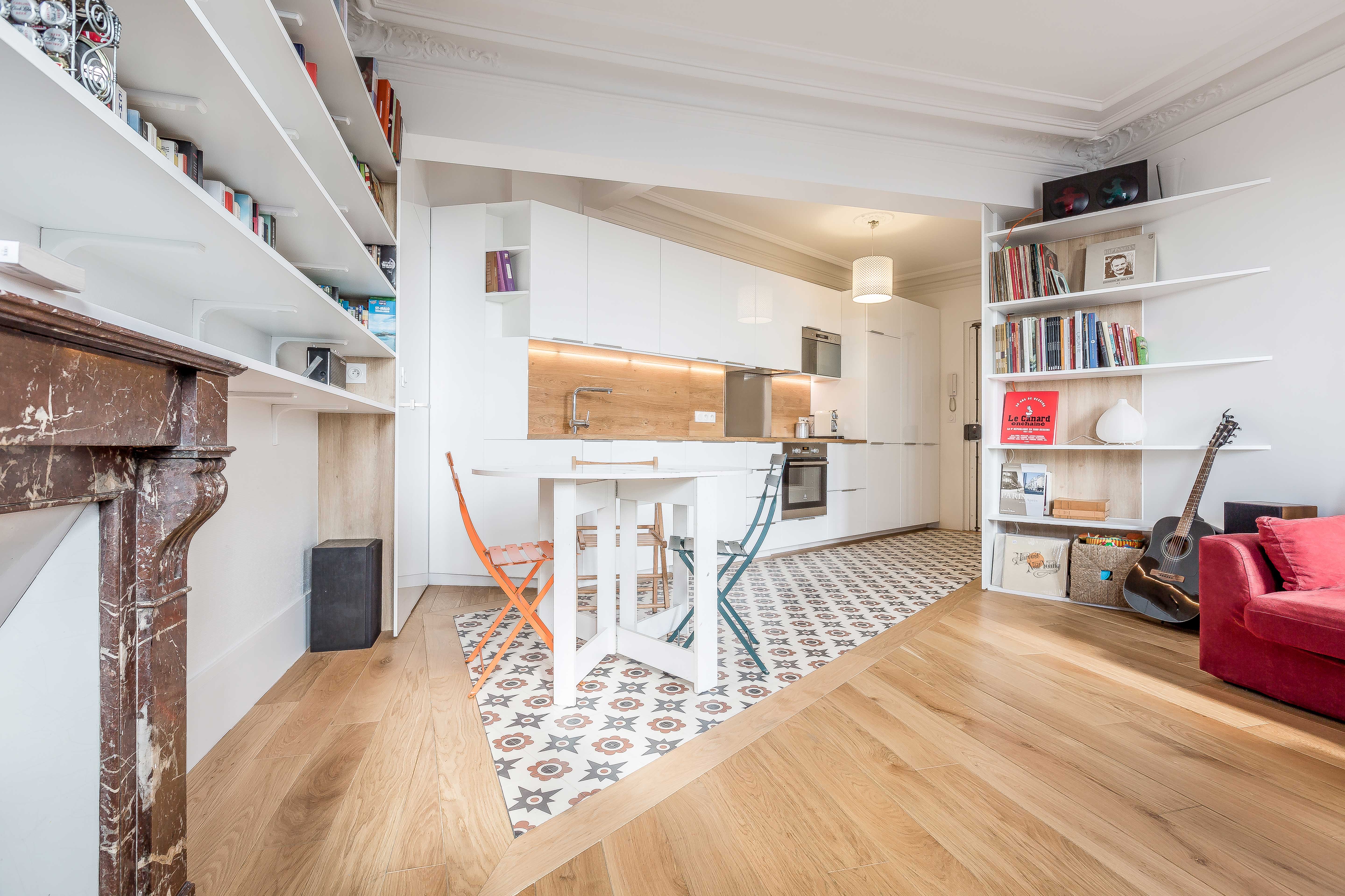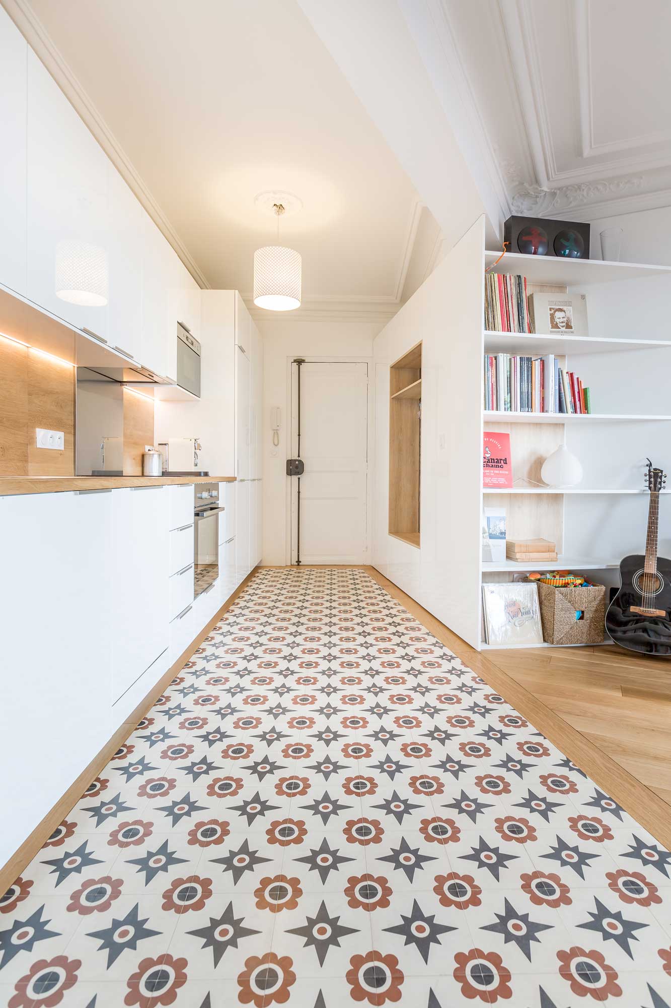 Les choix matériels renforcent cette conversation architecturale : le mariage du bois et de la laque blanche dans les menuiseries sur mesure, incluant une porte dissimulée desservant les chambres et la salle de bain, apporte élégance et discrétion. Dans l’entrée, un tapis de carreaux de ciment délimite subtilement l’espace cuisine-salle à manger du séjour, tandis que la salle de bain fonctionnelle s’agrandit visuellement grâce à un carrelage au motif graphique dynamique.