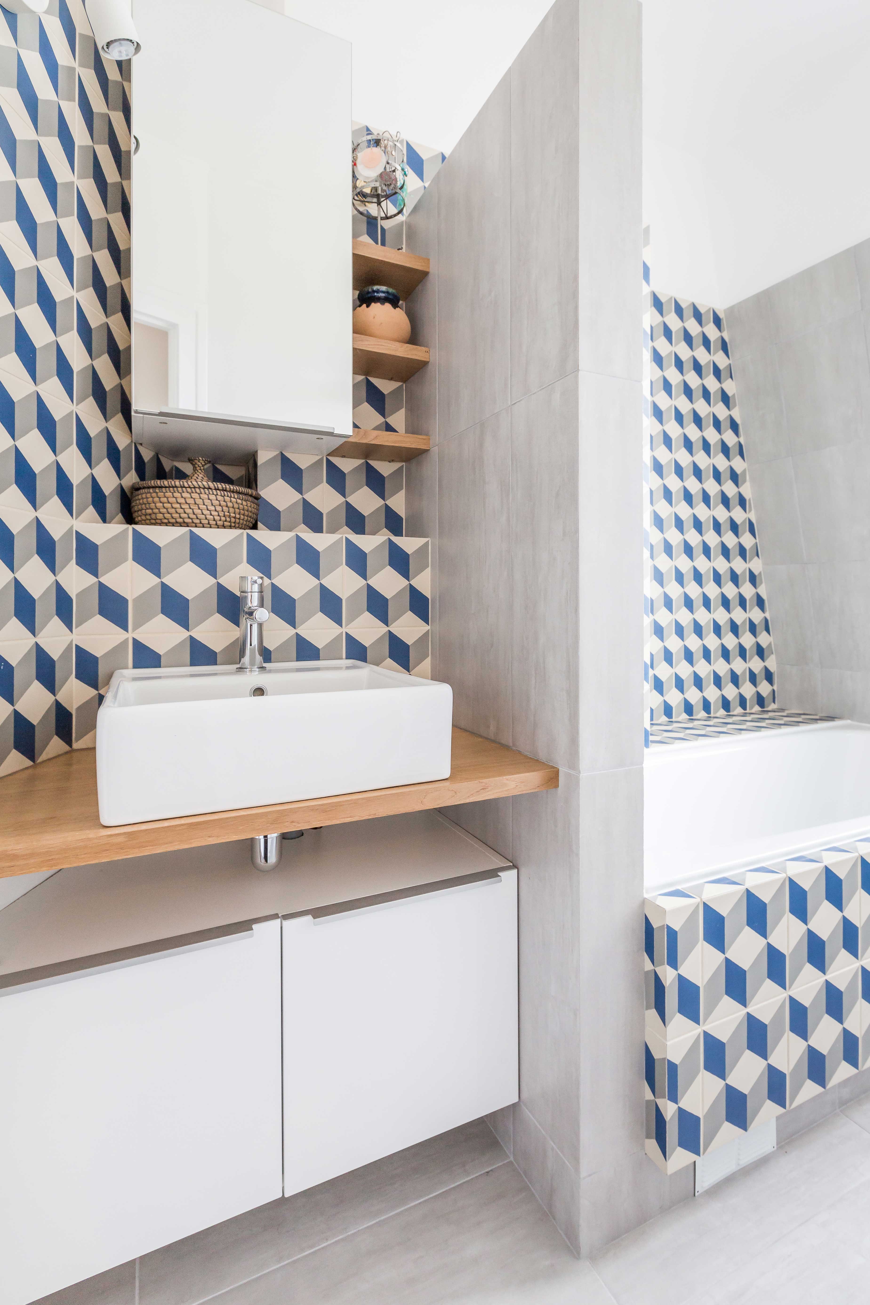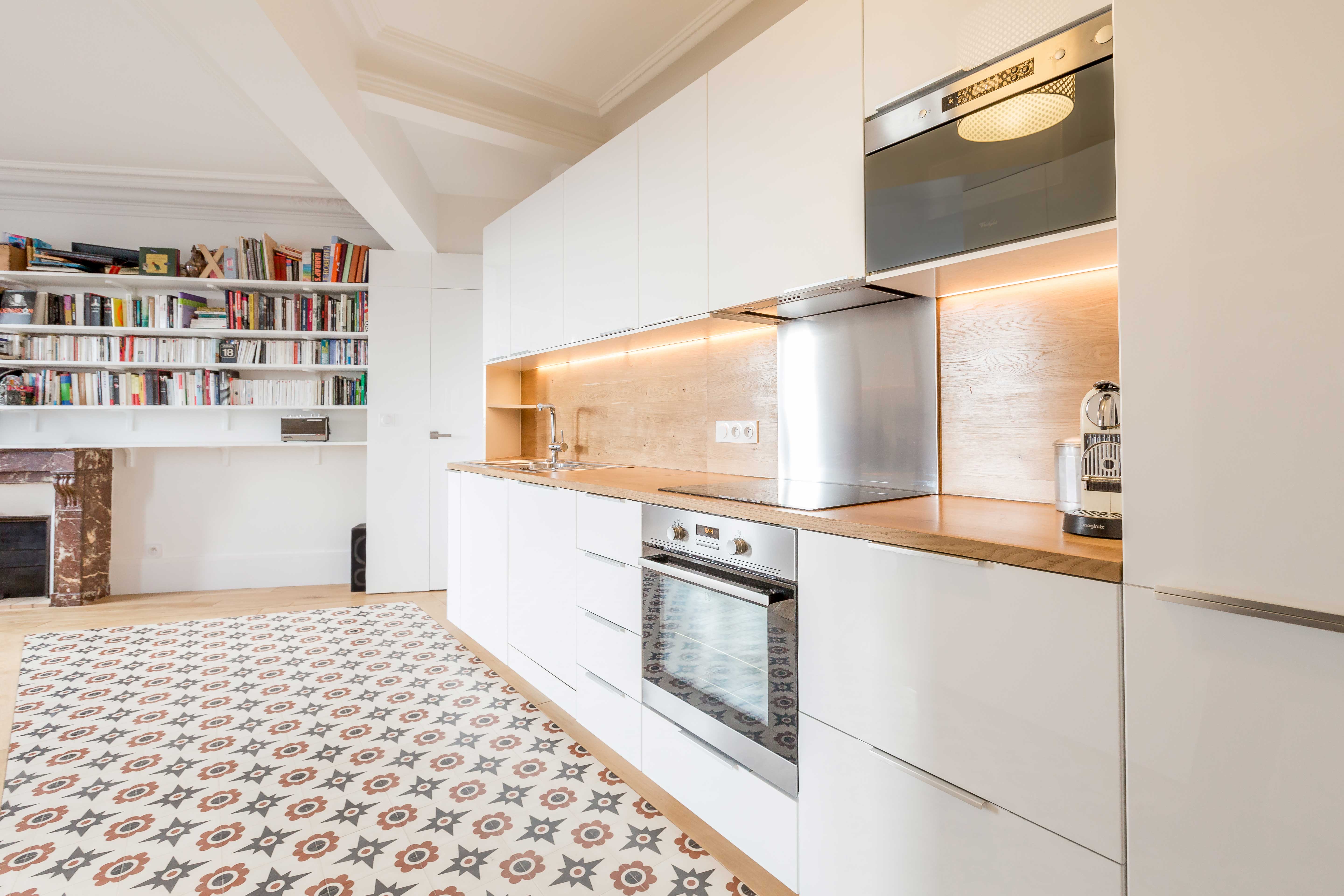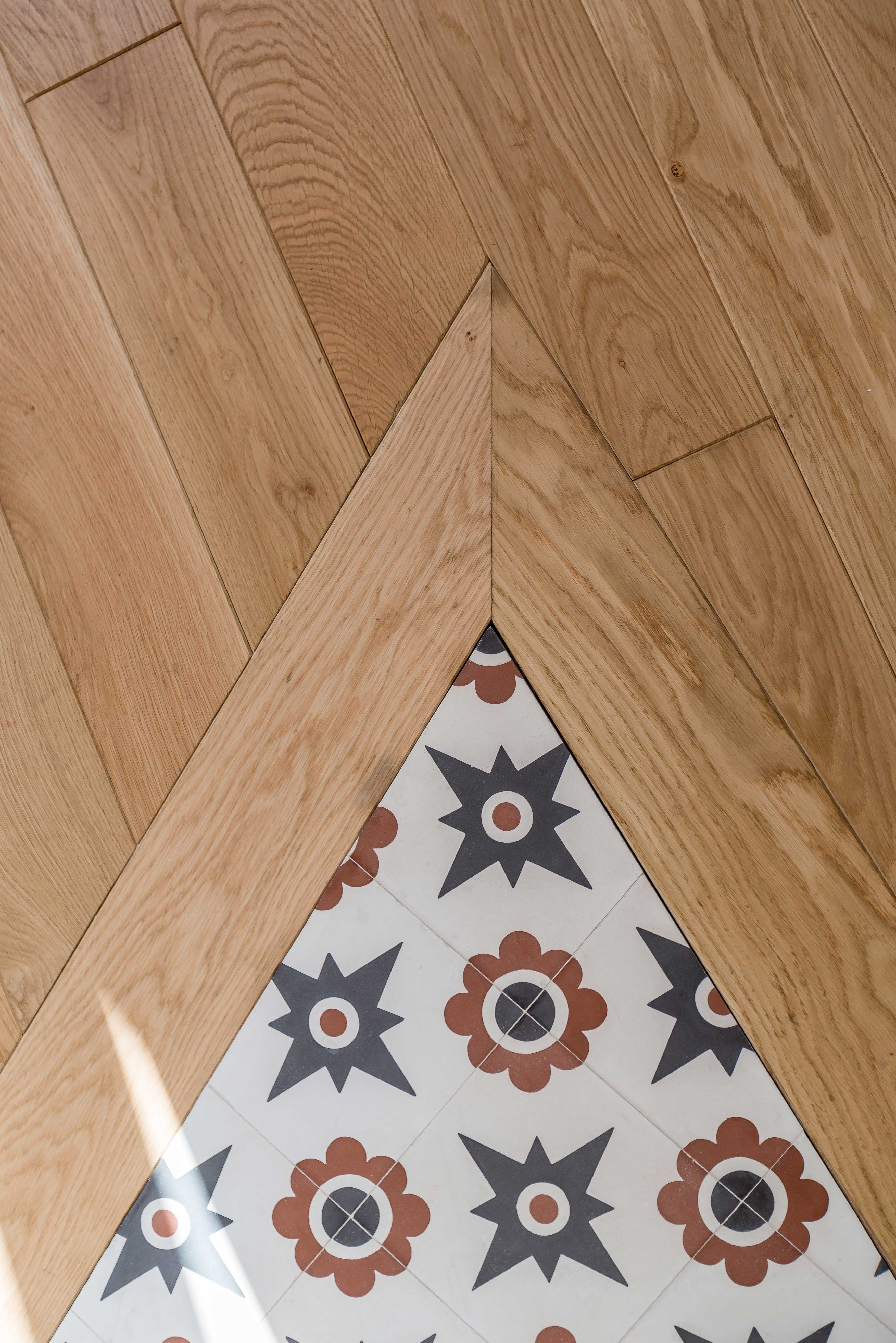 Les choix matériels renforcent cette conversation architecturale : le mariage du bois et de la laque blanche dans les menuiseries sur mesure, incluant une porte dissimulée desservant les chambres et la salle de bain, apporte élégance et discrétion. Dans l’entrée, un tapis de carreaux de ciment délimite subtilement l’espace cuisine-salle à manger du séjour, tandis que la salle de bain fonctionnelle s’agrandit visuellement grâce à un carrelage au motif graphique dynamique.