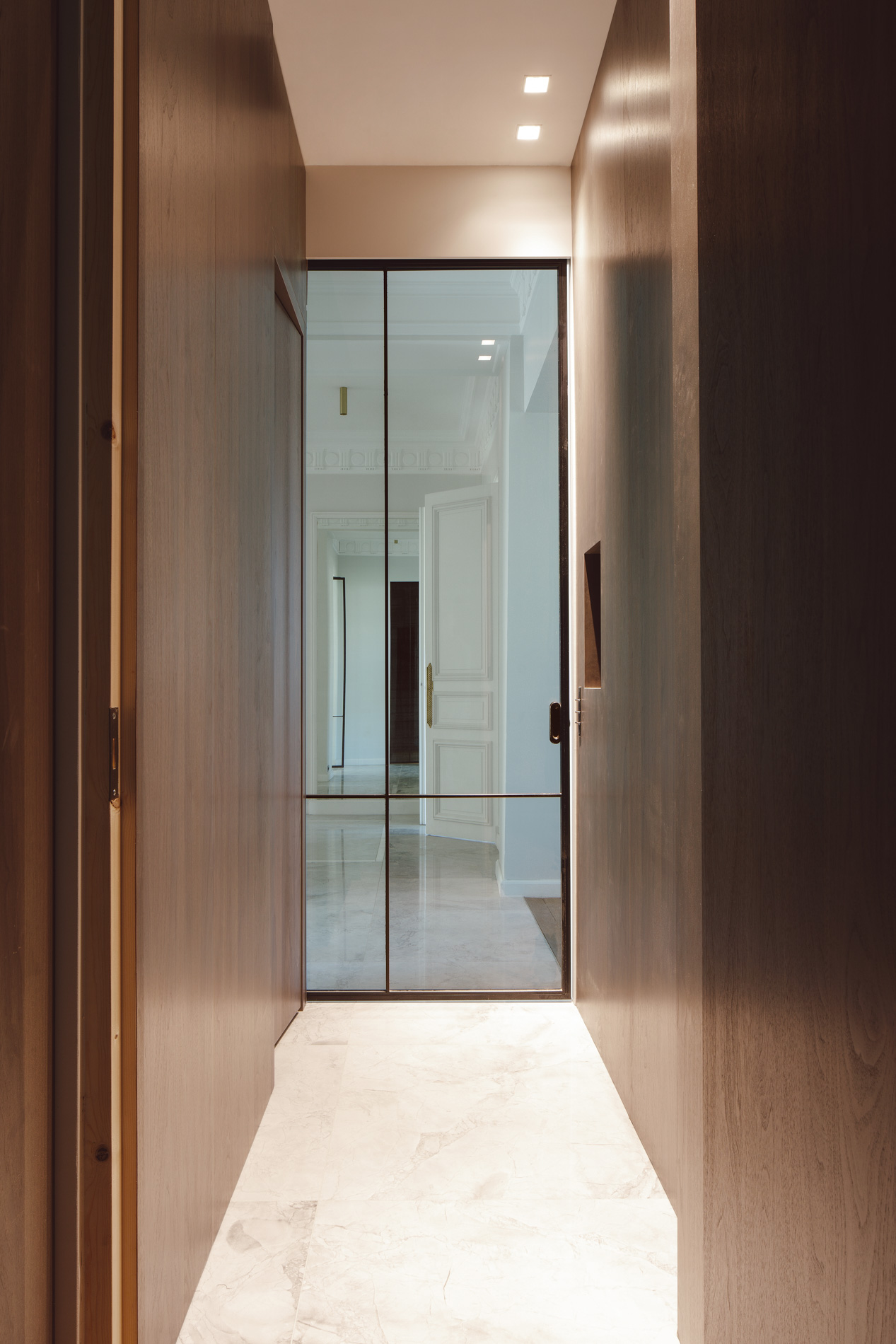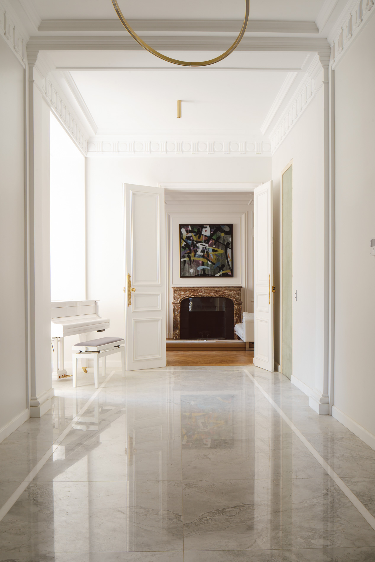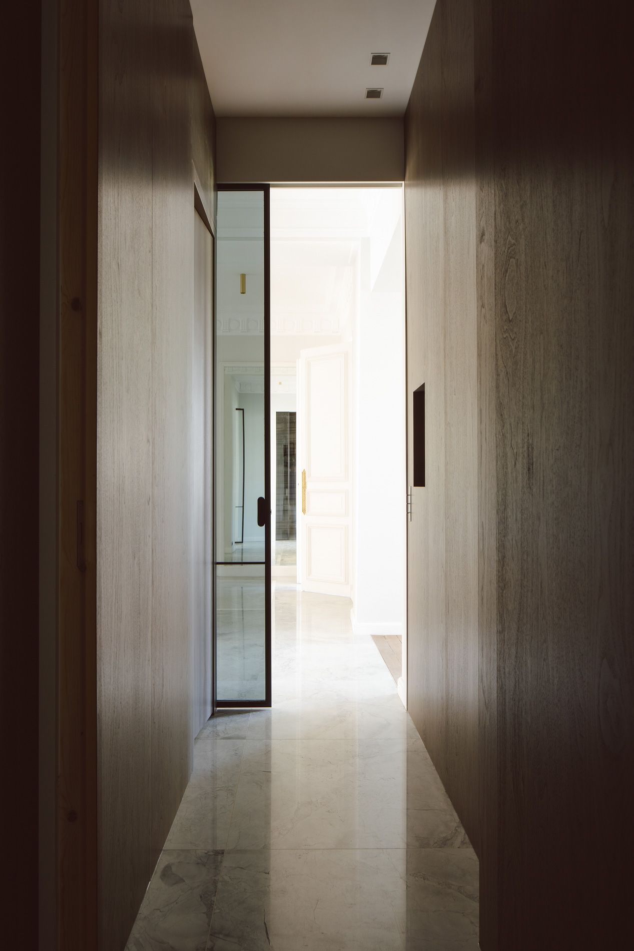 L’intervention s’est articulée autour d’un dialogue subtil entre patrimoine et modernité. Les espaces de réception, maintenus dans leur position d’origine, ont fait l’objet d’une restauration méticuleuse : corniches ouvragées, cimaises élégantes, frontons majestueux et doubles portes panneautées retrouvent leur splendeur d’antan. Cette restauration minutieuse préserve l’âme de l’appartement tout en lui insufflant une nouvelle jeunesse.