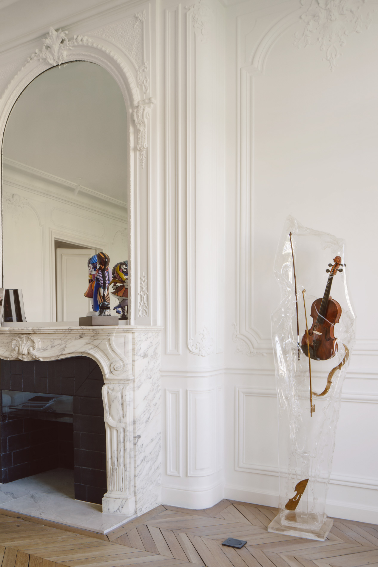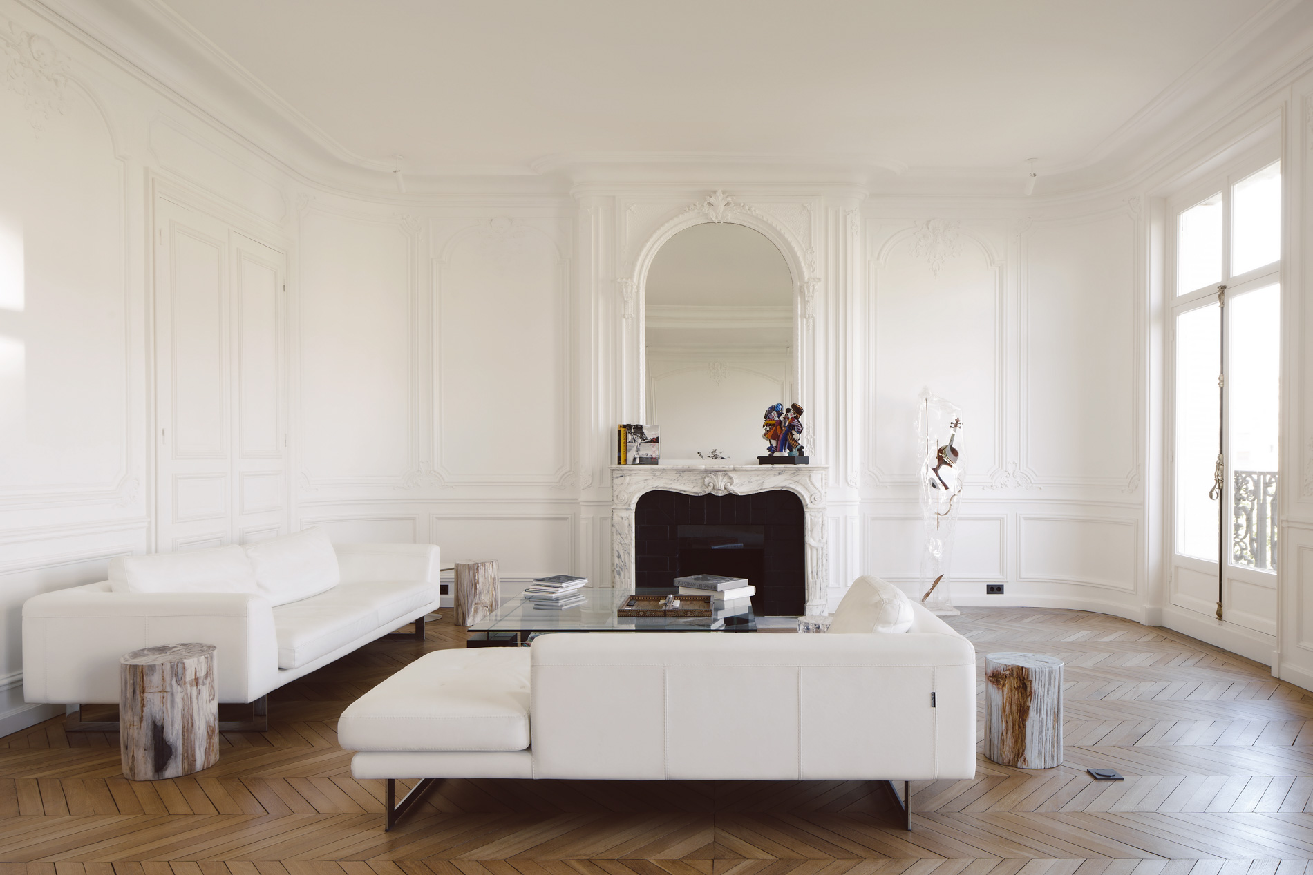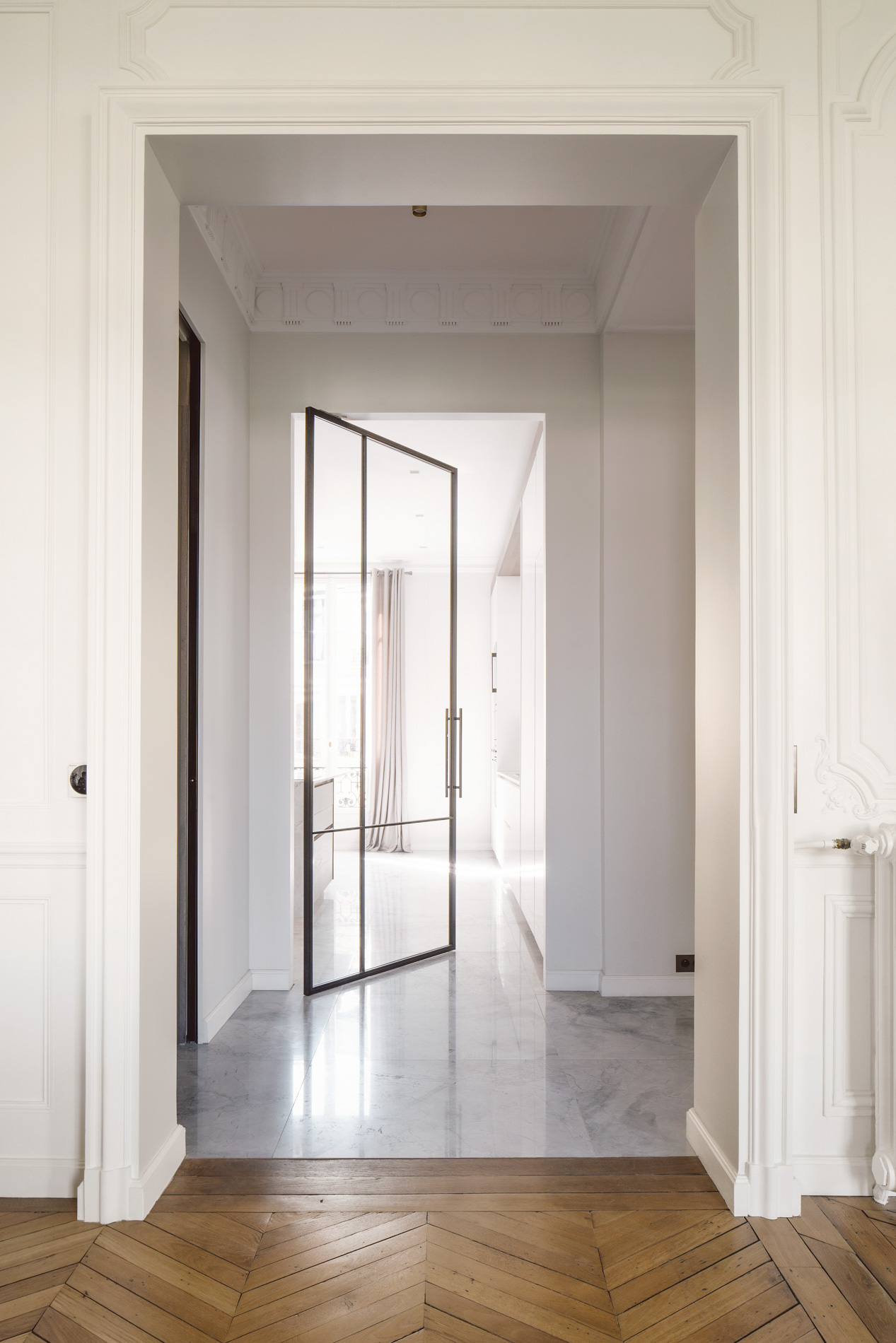 L’intervention s’est articulée autour d’un dialogue subtil entre patrimoine et modernité. Les espaces de réception, maintenus dans leur position d’origine, ont fait l’objet d’une restauration méticuleuse : corniches ouvragées, cimaises élégantes, frontons majestueux et doubles portes panneautées retrouvent leur splendeur d’antan. Cette restauration minutieuse préserve l’âme de l’appartement tout en lui insufflant une nouvelle jeunesse.