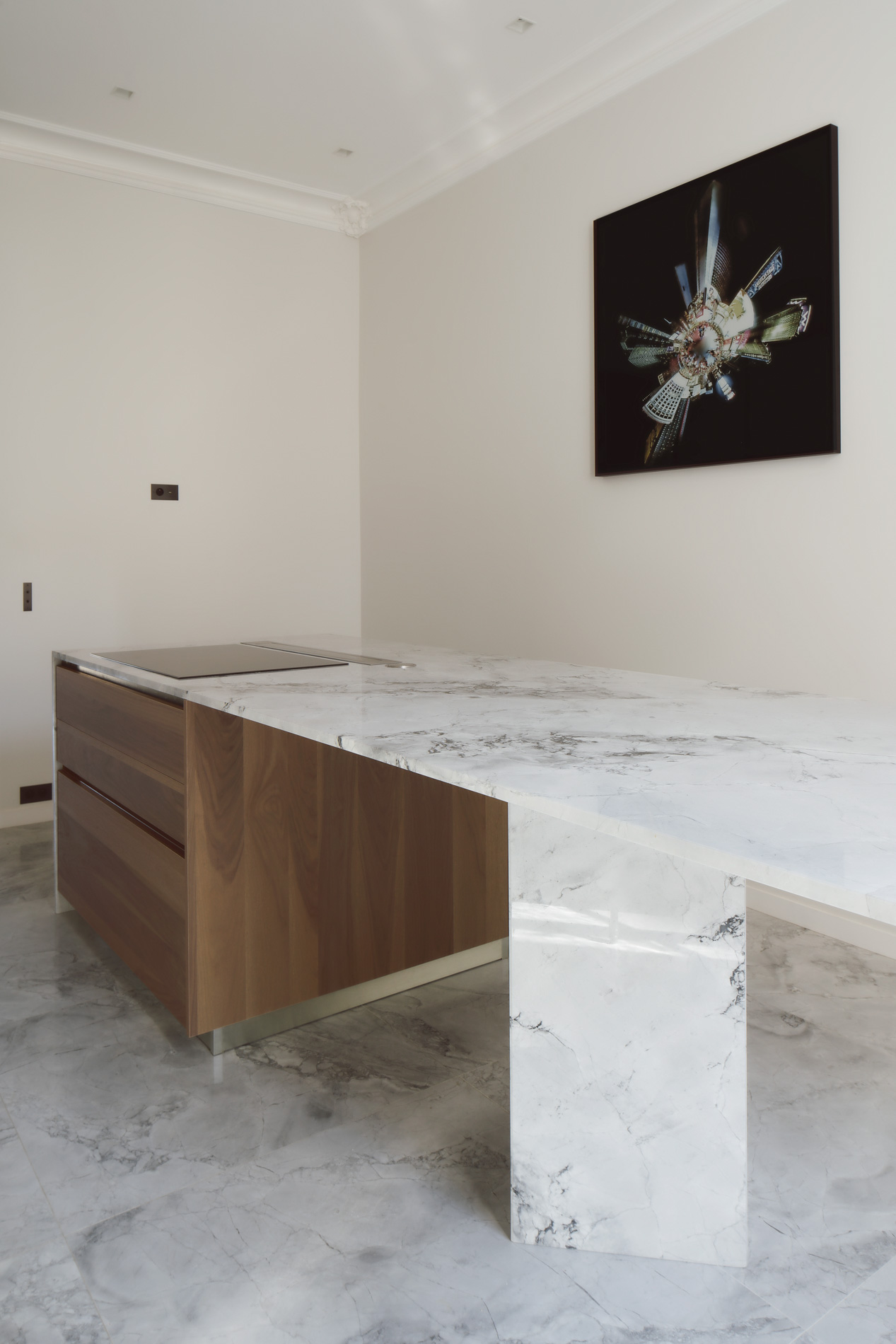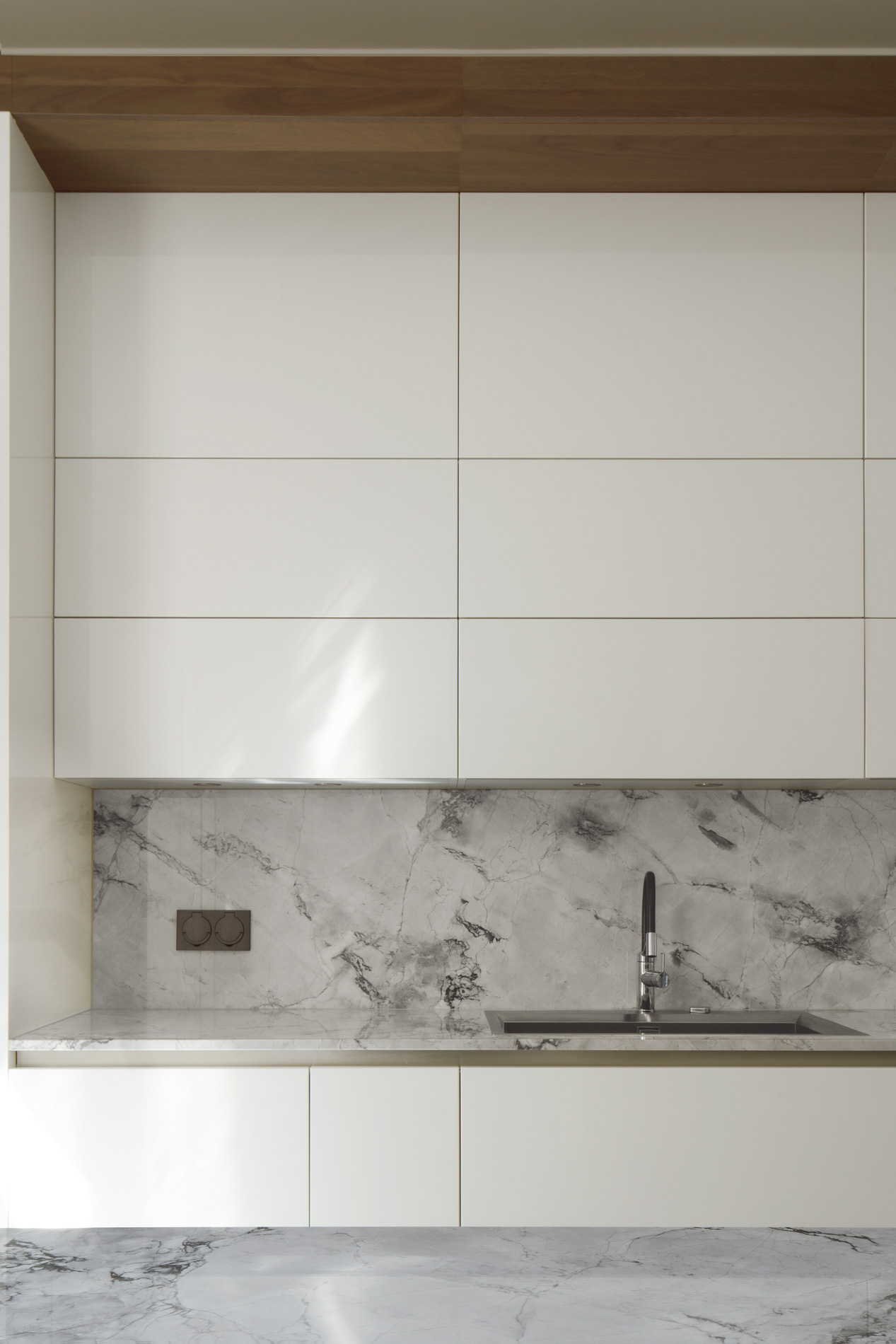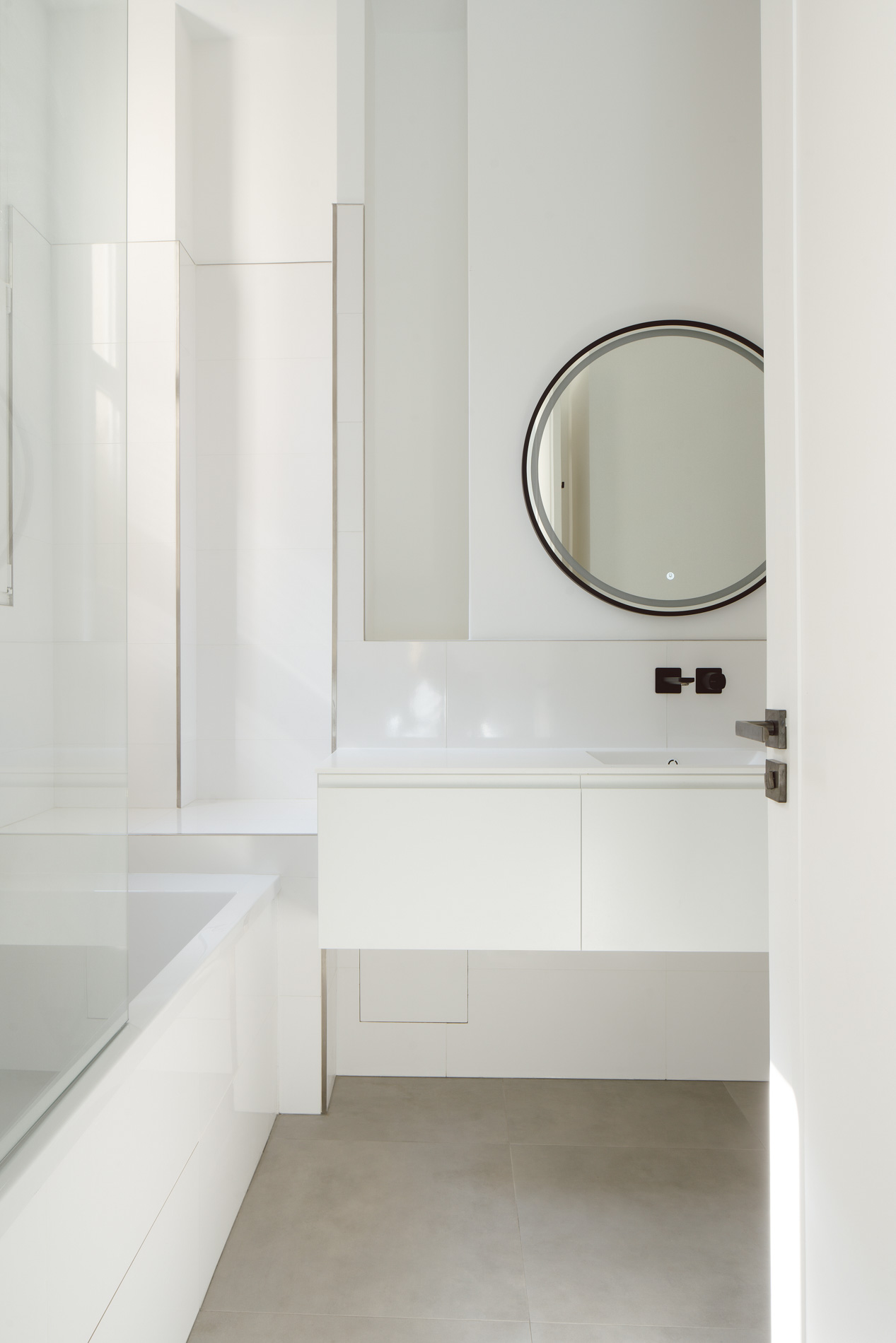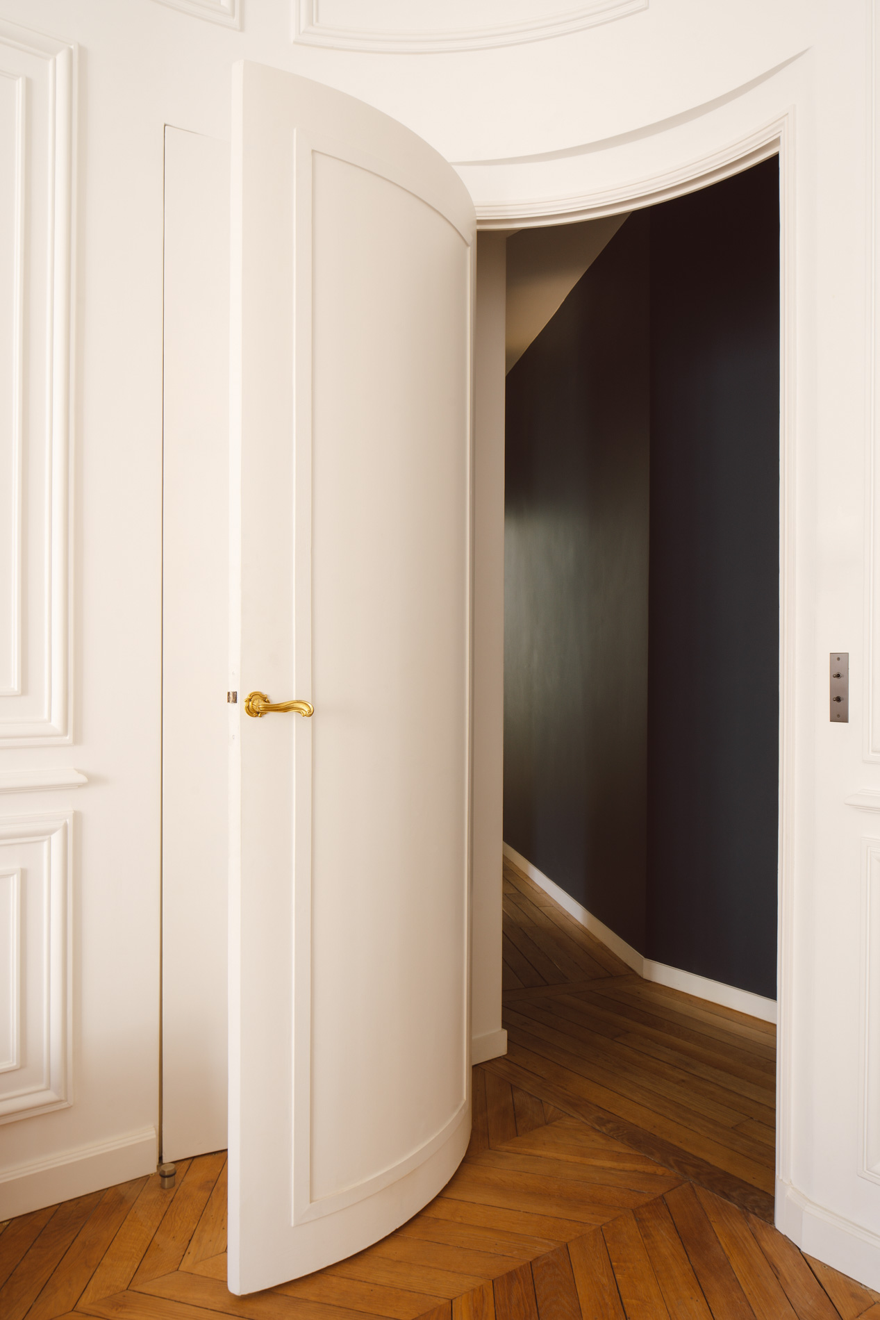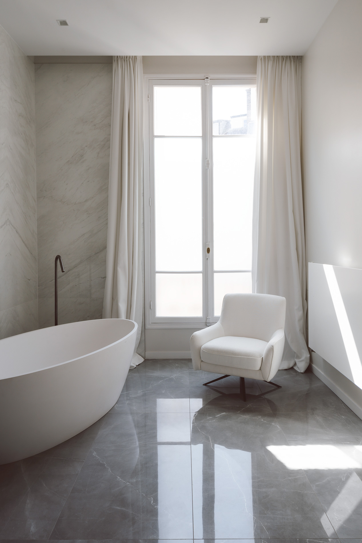 En contraste assumé, les espaces privés ont été entièrement repensés dans un esprit contemporain épuré. Chambres, salle de bain, dressing et cuisine adoptent un langage architectural minimaliste qui met en valeur, par opposition, la richesse ornementale des pièces de réception.