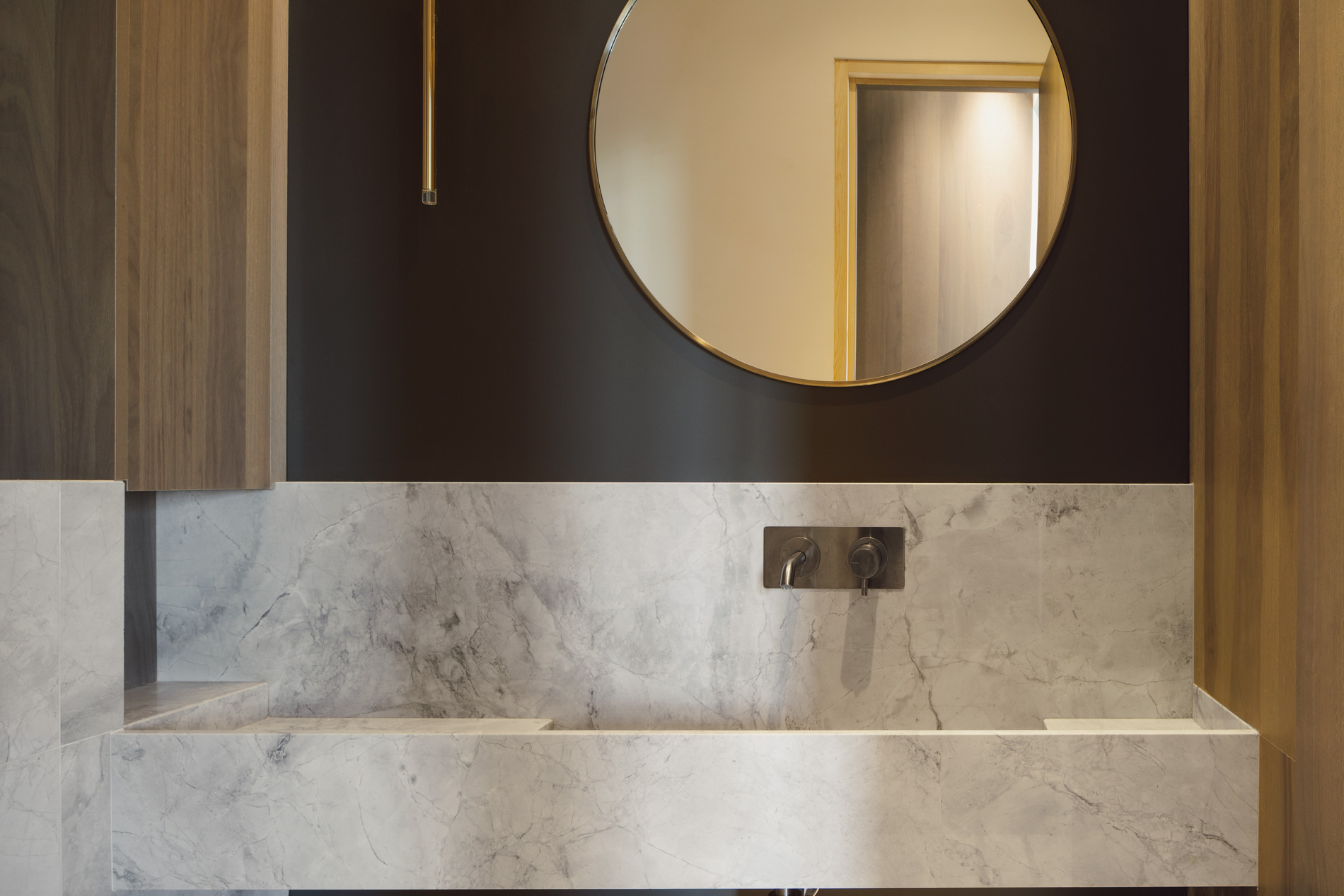 La palette matérielle, volontairement restreinte, se concentre sur l’essentiel : le bois et la pierre se répondent dans une harmonie de camaïeux soigneusement orchestrée. Cette sobriété des matériaux crée une unité visuelle apaisante tout en soulignant les détails architecturaux d’origine.
