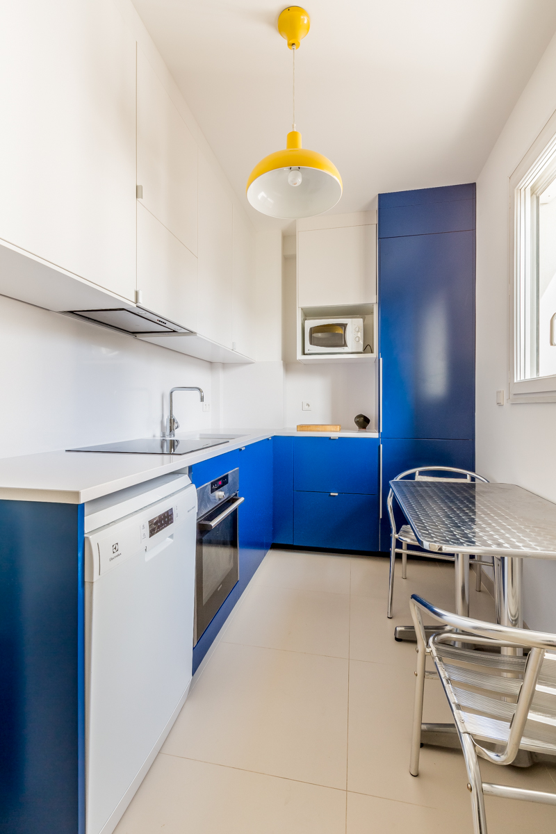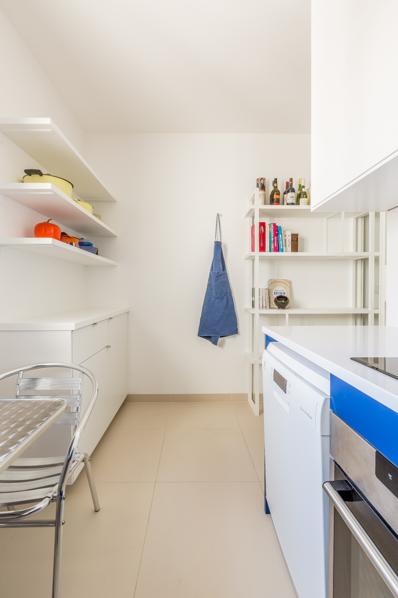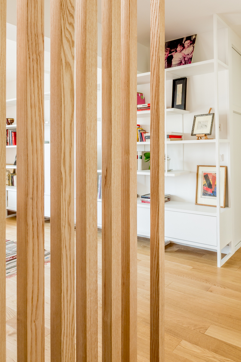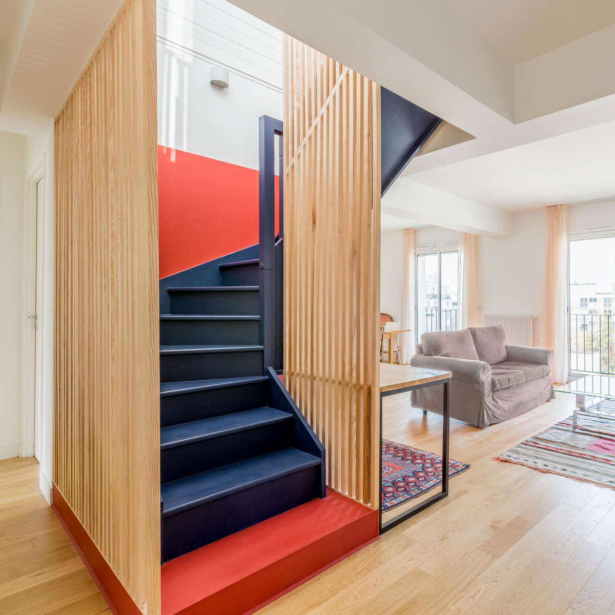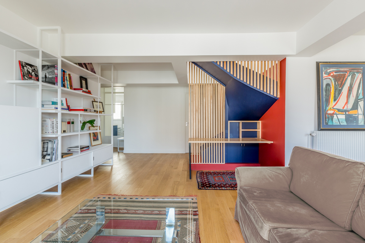 Au cœur du projet, l’escalier menant au toit-terrasse devient une véritable sculpture habitée. Réinventé avec des claustras en hêtre, il joue un double rôle : élément architectural marquant par son design entre transparence et couleurs contrastées, et espace fonctionnel abritant astucieusement un bureau. Cette pièce maîtresse structure l’espace, devenant le pivot autour duquel s’organise la circulation et la vie de l’appartement.