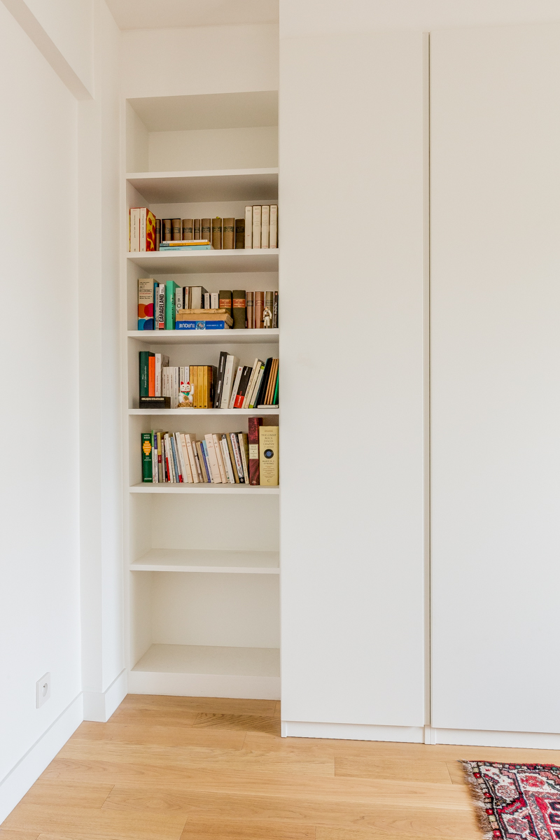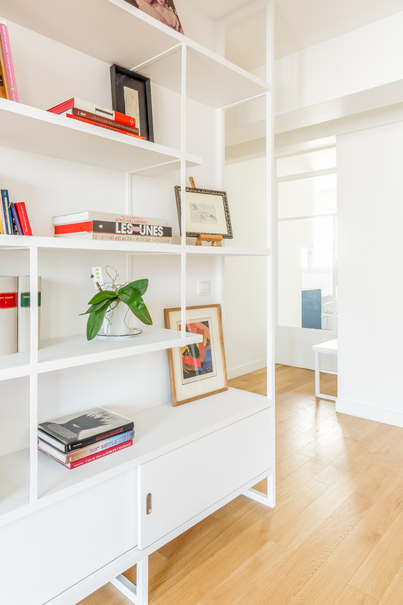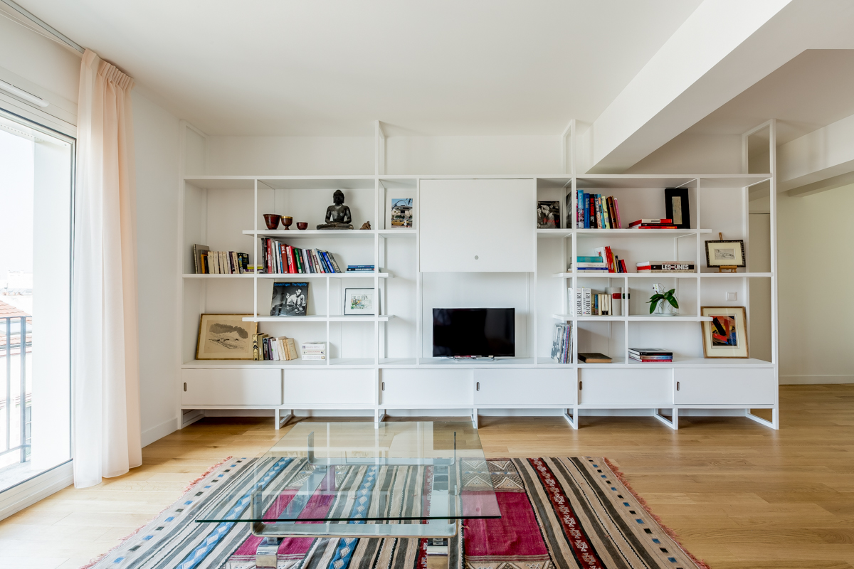 Le mobilier sur mesure, conçu comme une collection cohérente en bois et acier dans une harmonie de blancs, ponctue l’espace tel un fil conducteur. Ces éléments, à la fois esthétiques et fonctionnels, intègrent habilement rangements, bibliothèque et assises, répondant ainsi au désir des propriétaires d’un intérieur à la fois épuré et pratique.