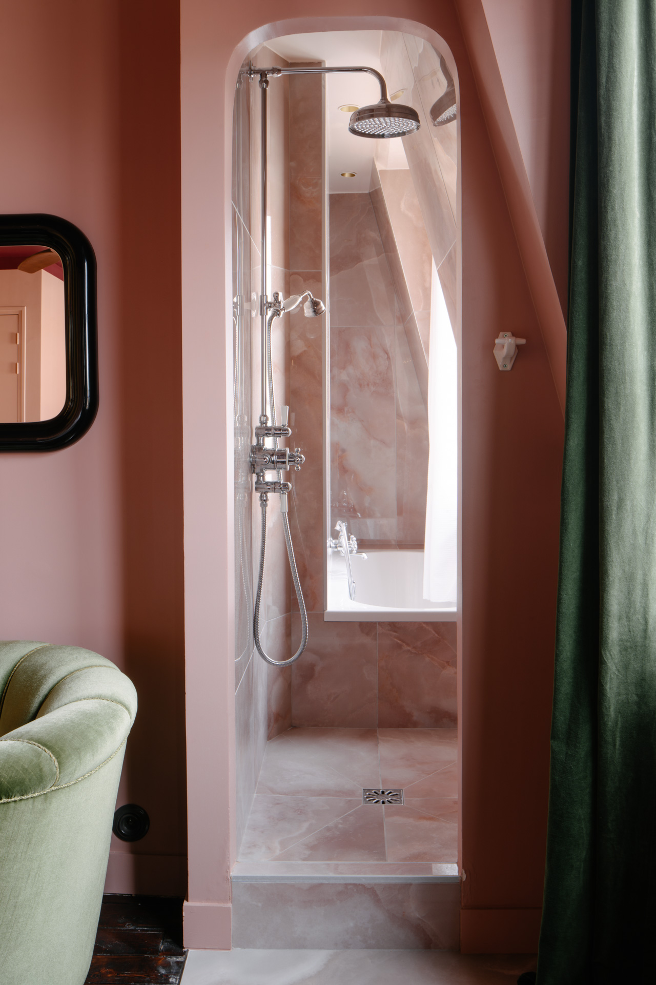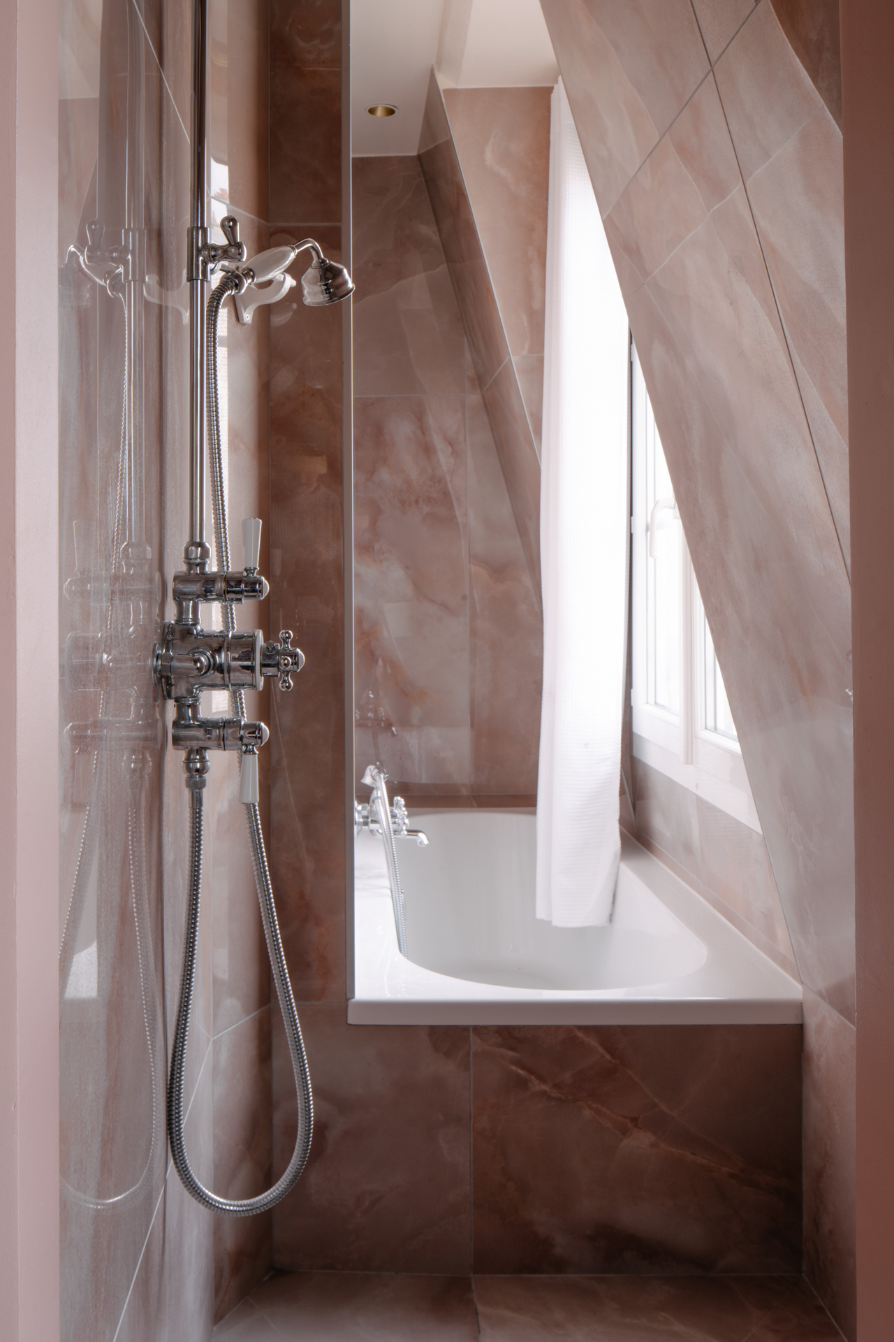 L’aménagement, pensé dans ses moindres détails, optimise chaque centimètre pour créer un lieu de vie complet et fonctionnel. L’espace s’organise en zones fluides et communicantes : un coin café invite à la contemplation des toits parisiens, une kitchenette discrète permet de préparer de petits repas, tandis qu’une mini penderie astucieusement intégrée résout la question du rangement. Point d’orgue de cette réalisation, la salle d’eau avec sa baignoire-douche offre une vue imprenable sur le paysage des toits, transformant un moment quotidien en expérience unique.