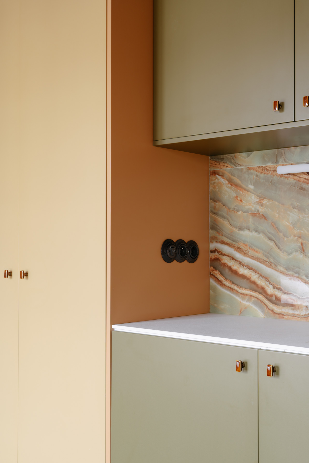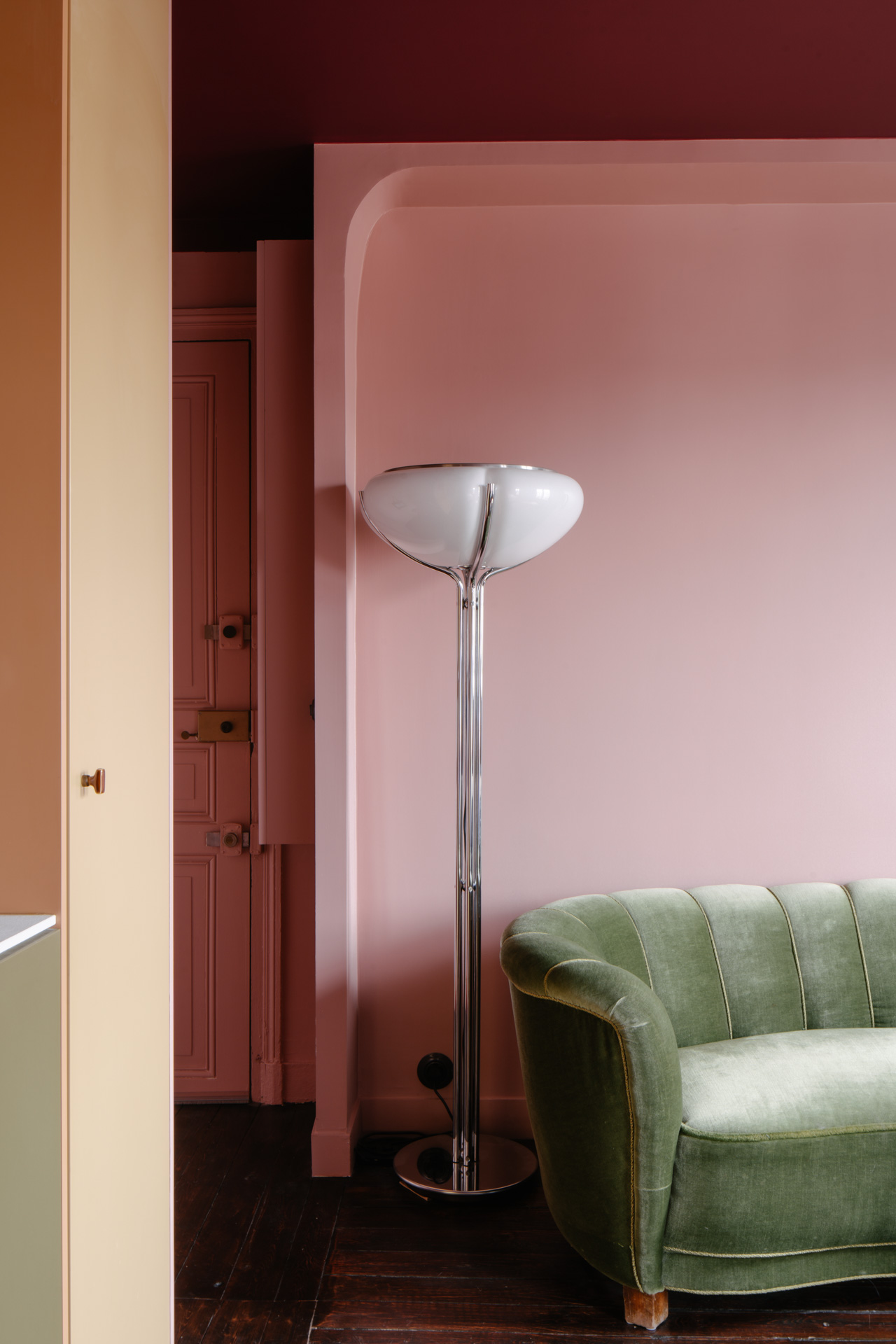 L’ambiance chromatique audacieuse et chaleureuse renforce le caractère cocooning de ce refuge urbain. Les couleurs, soigneusement sélectionnées, dynamisent l’espace tout en créant une atmosphère enveloppante propice à la détente. Cette palette vibrante dialogue avec la lumière naturelle qui baigne généreusement les lieux, amplifiant la sensation d’espace et de bien-être.