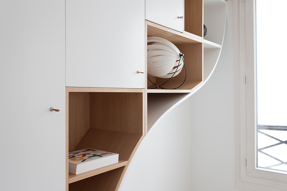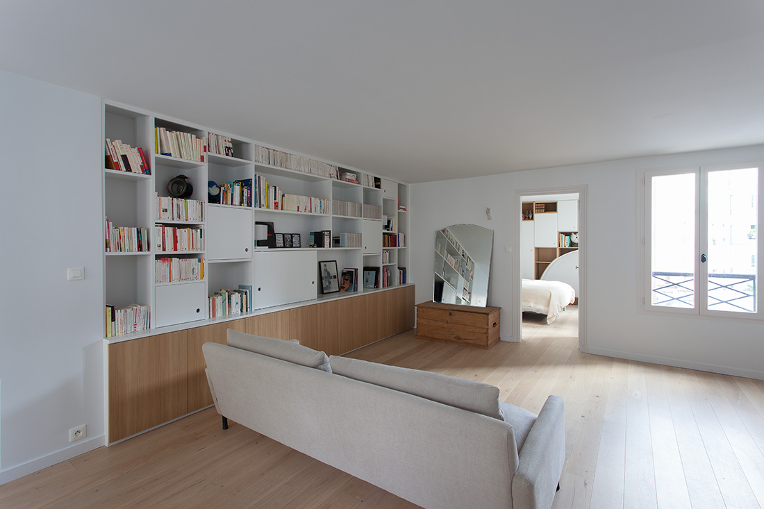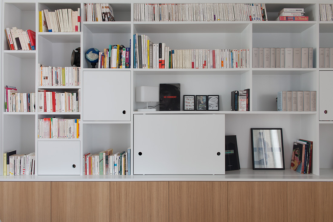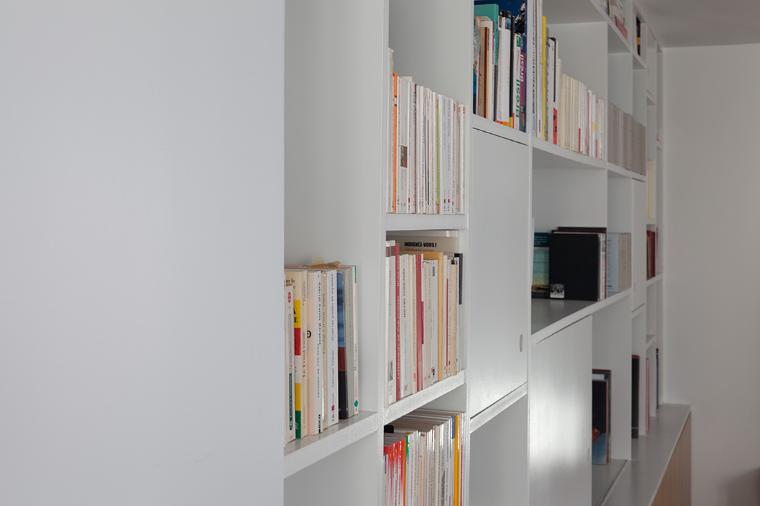 L’espace de vie et la chambre se distinguent par leurs rangements intégrés aux lignes épurées. Les bibliothèques, placards et dressings jouent sur l’alternance du visible et du caché, créant un rythme visuel tout en répondant aux besoins pratiques du quotidien.