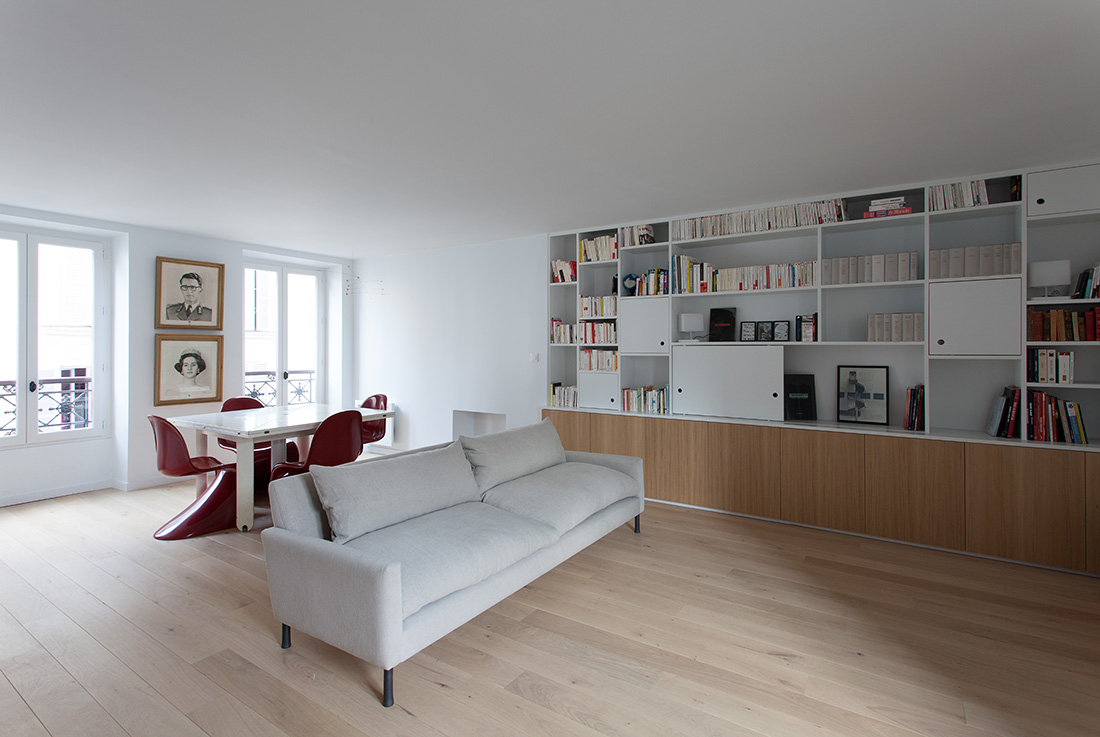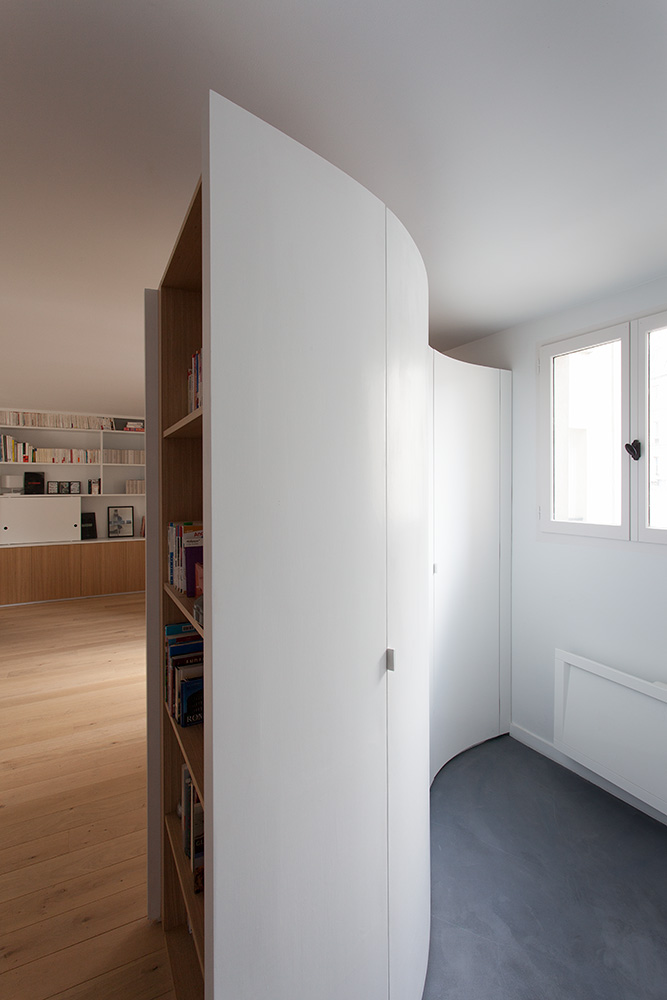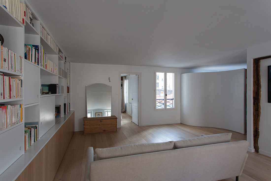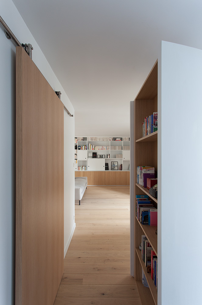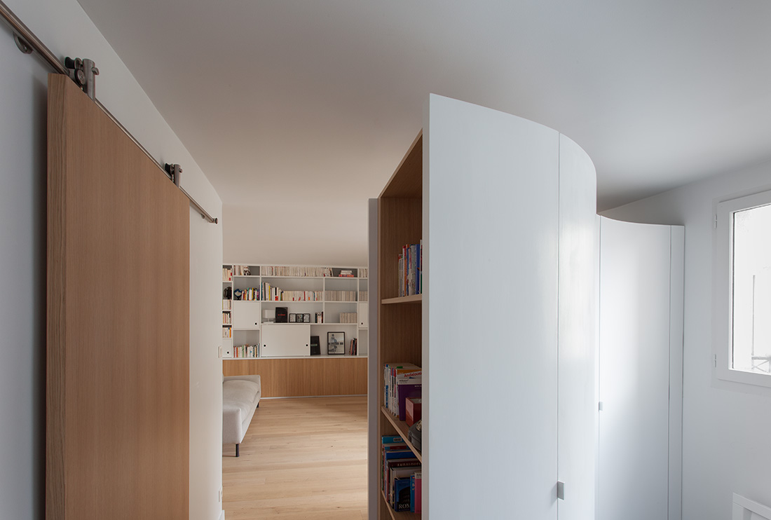 L’espace de vie et la chambre se distinguent par leurs rangements intégrés aux lignes épurées. Les bibliothèques, placards et dressings jouent sur l’alternance du visible et du caché, créant un rythme visuel tout en répondant aux besoins pratiques du quotidien.