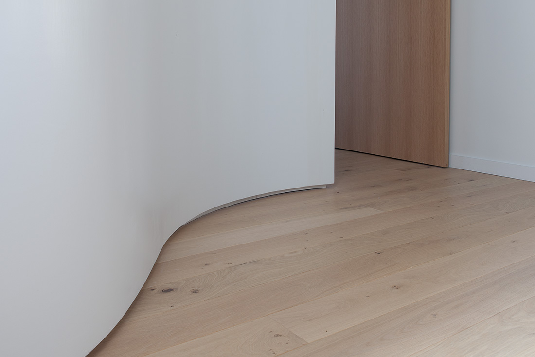 Dès l’entrée, une vague sculpturale en bois cintré redéfinit l’espace : à la fois œuvre d’art fonctionnelle et solution de rangement, elle crée une transition élégante entre l’extérieur et l’intérieur. Cette pièce signature donne immédiatement le ton d’un intérieur où chaque élément est pensé pour être aussi beau qu’utile.
