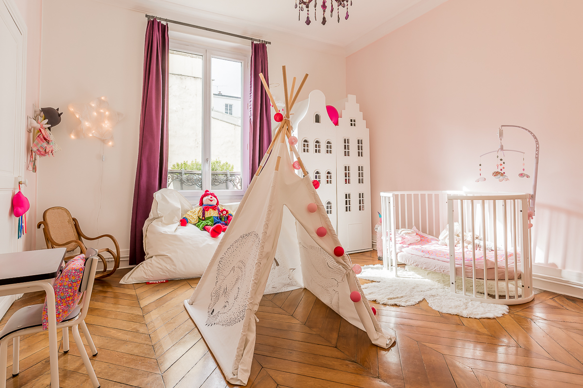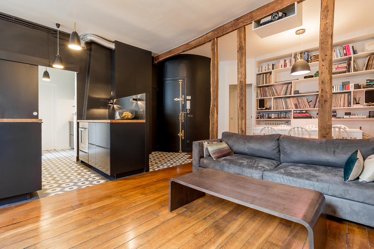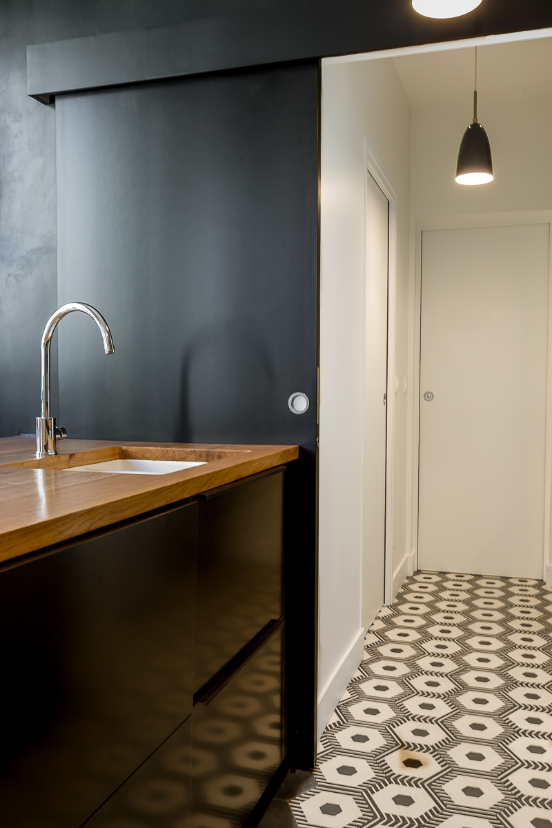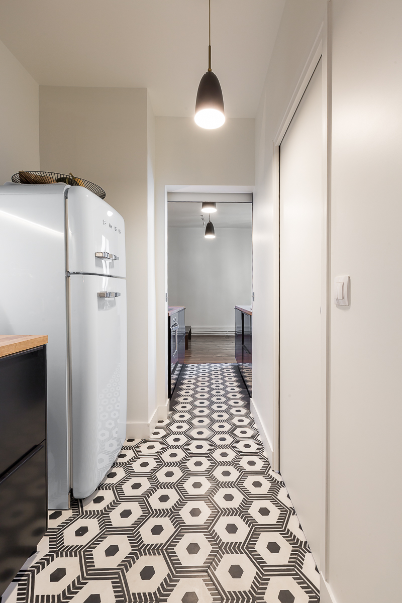 Dans un immeuble caractéristique des Batignolles, nous avons orchestré la fusion d’un T2 et d’un studio pour créer un appartement familial de 80m², où chaque mètre carré est pensé pour optimiser la vie quotidienne d’un couple et leur enfant.
