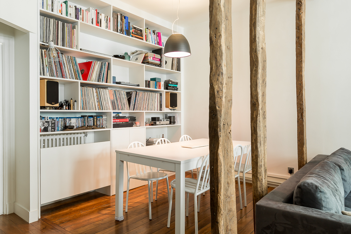 Pour renforcer l’unicité de ce lieu et mettre en valeur la passion de nos clients, nous avons dessiné une imposante bibliothèque à vinyles. Cette création sur mesure dissimule astucieusement l’espace enfant tout en affirmant le caractère culturel du lieu.