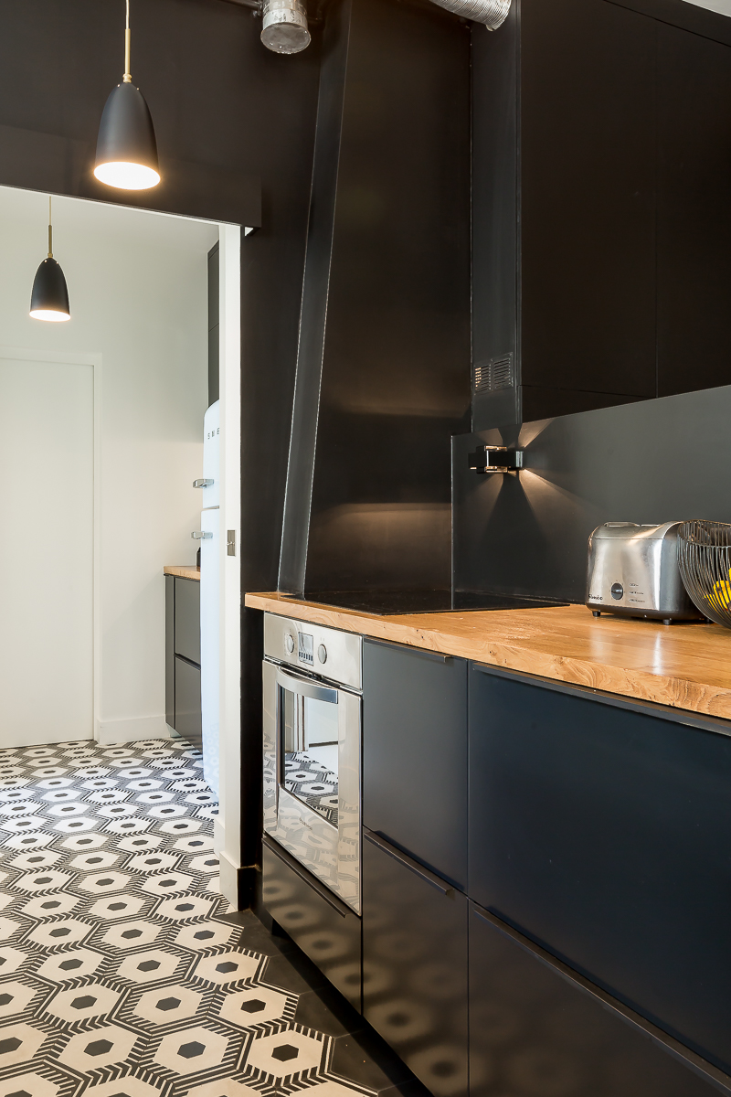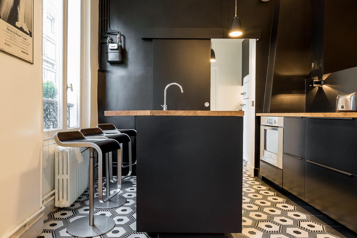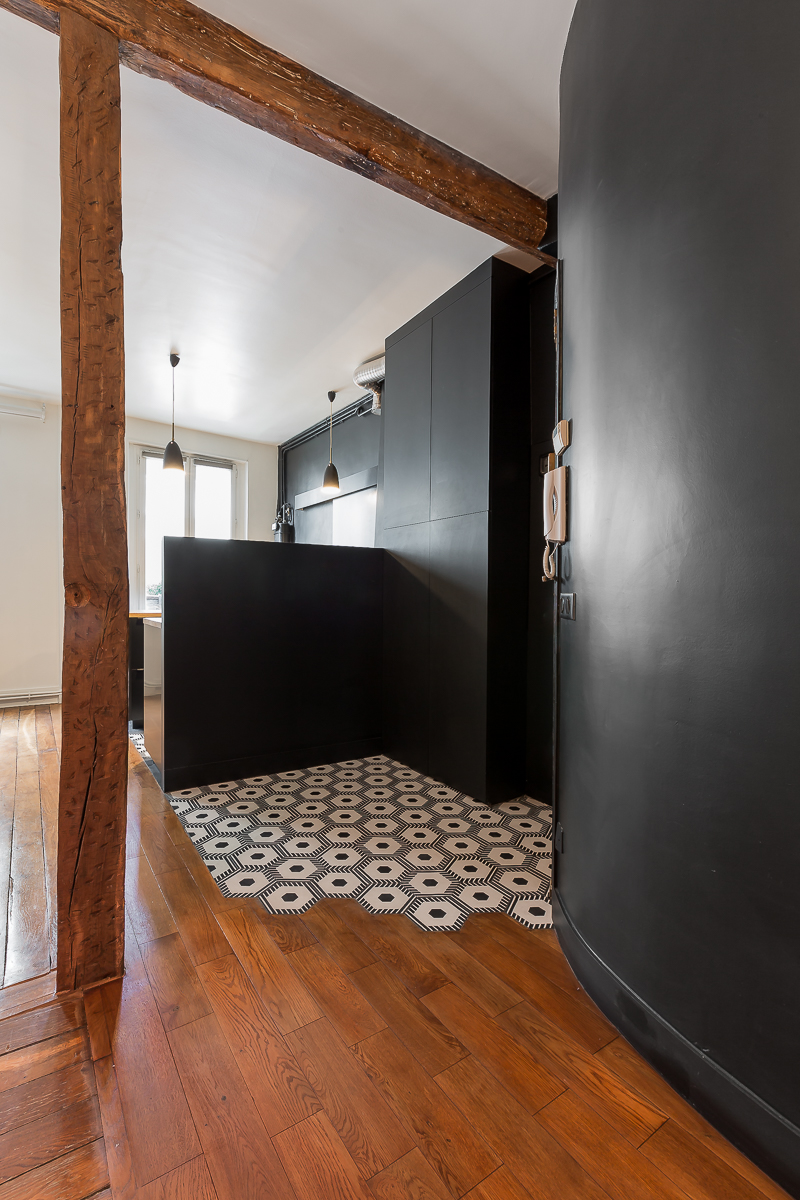 L’identité visuelle de l’appartement s’exprime à travers un parti pris graphique assumé : un dialogue en noir et blanc rythmé par des jeux de textures qui confère au lieu une élégance contemporaine.