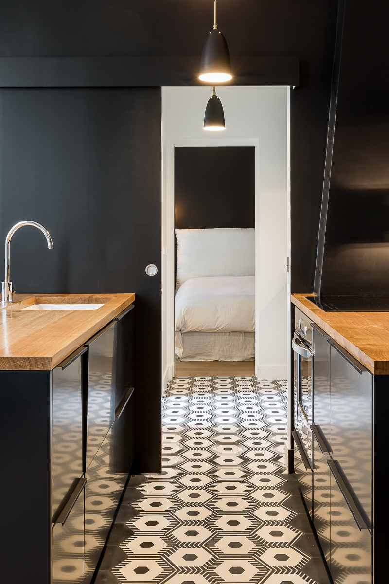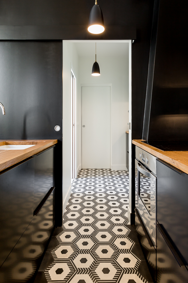 La cuisine, véritable pivot social de l’appartement, s’articule autour d’un plan-bar invitant aux échanges informels. Elle fait également la transition vers l’espace parental, une suite composée d’une chambre et d’une salle de bain.