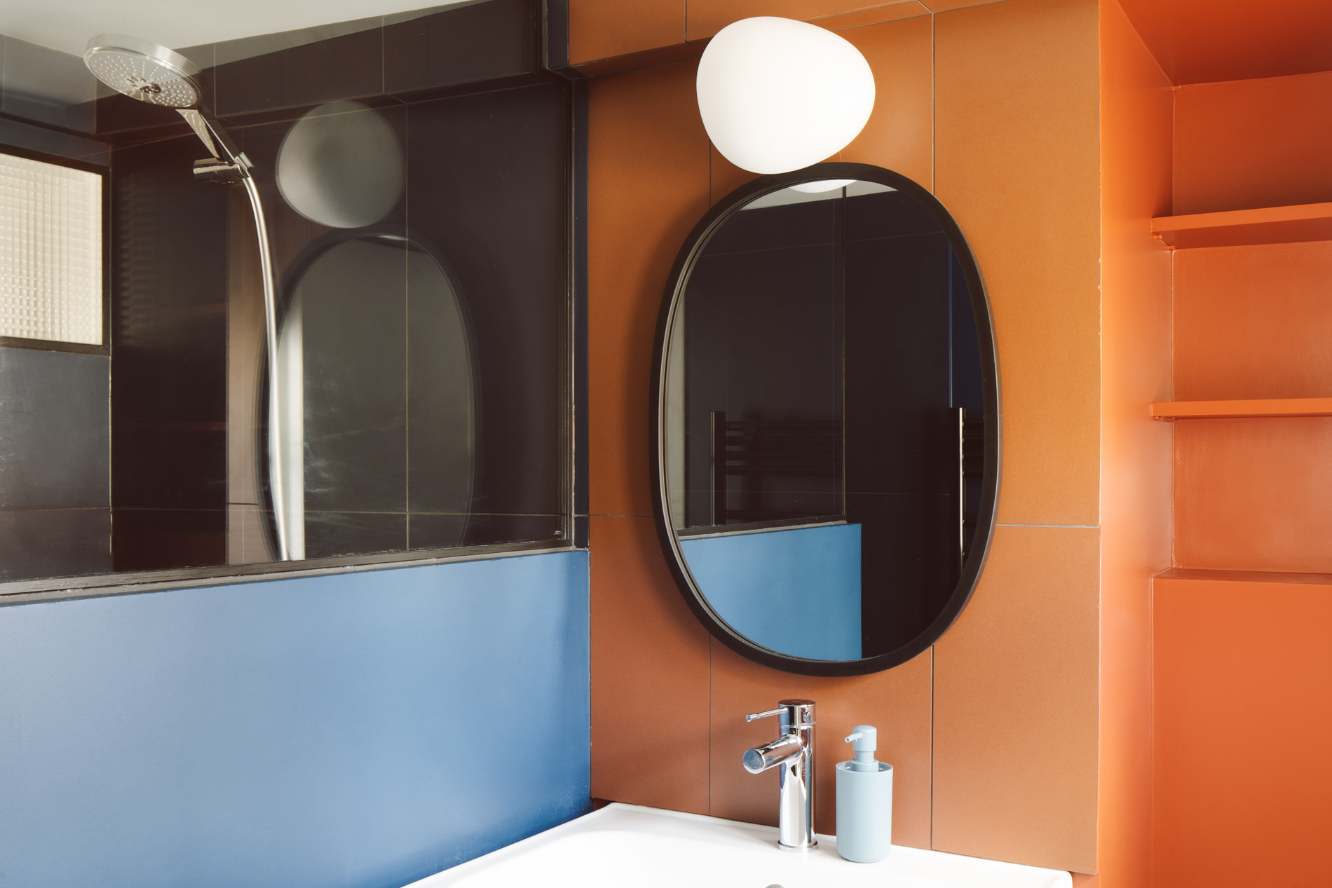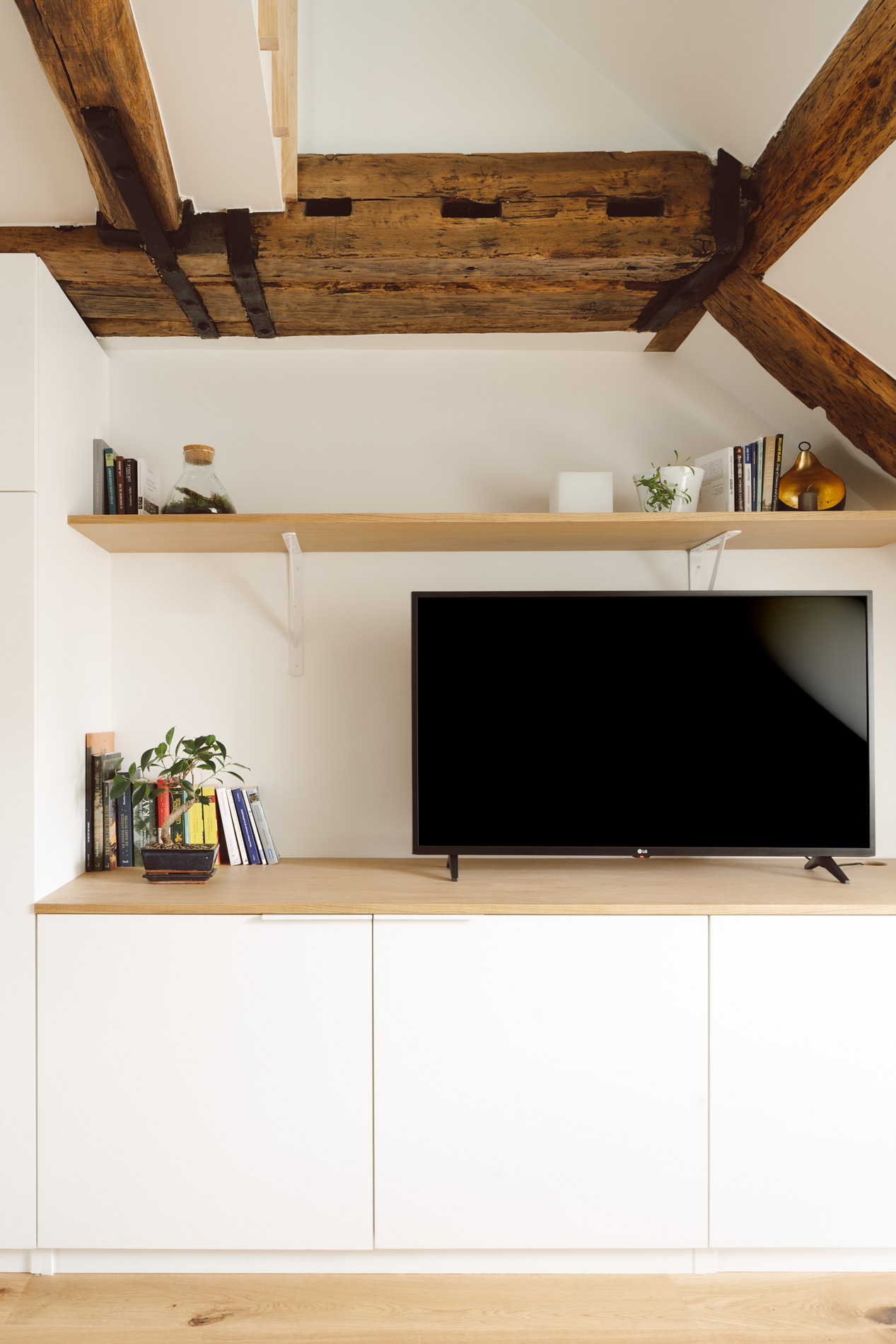 L’aménagement conjugue astucieusement convivialité et intimité : un bureau baigné de lumière se métamorphose en table de réception, un canapé-lit accueille amis et famille, tandis qu’une chambre en mezzanine crée un espace nuit préservé. Cette organisation permet au lieu de s’adapter aux différents moments de la vie dans un espace contraint. Les matériaux naturels choisis pour leur sobriété et leur chaleur créent une atmosphère apaisante. L’intégration de rangements sur-mesure libère les espaces de circulation et de vie.