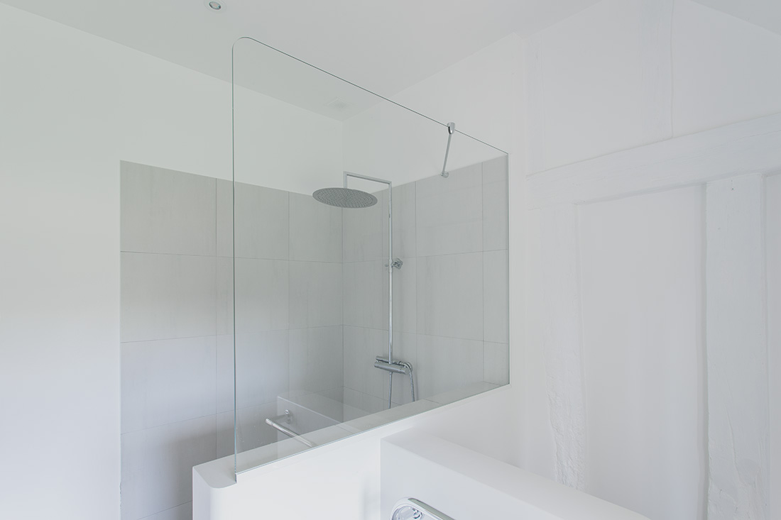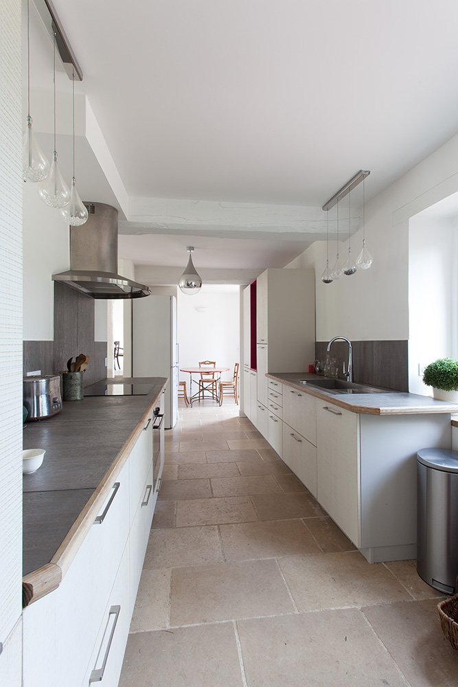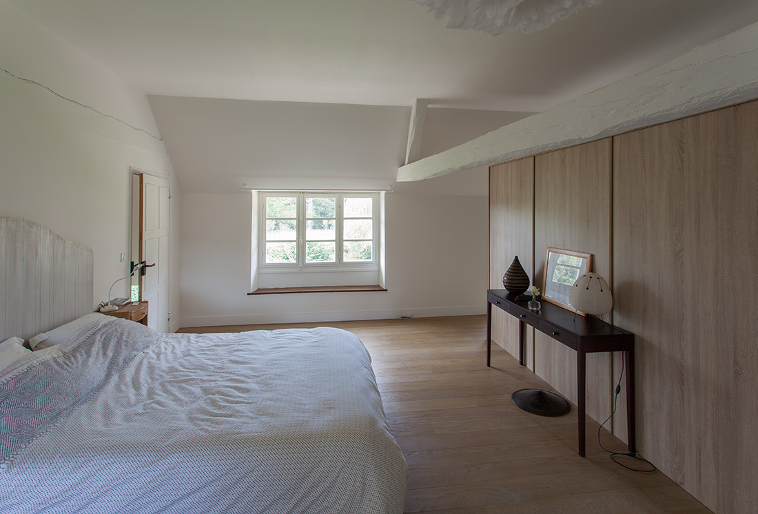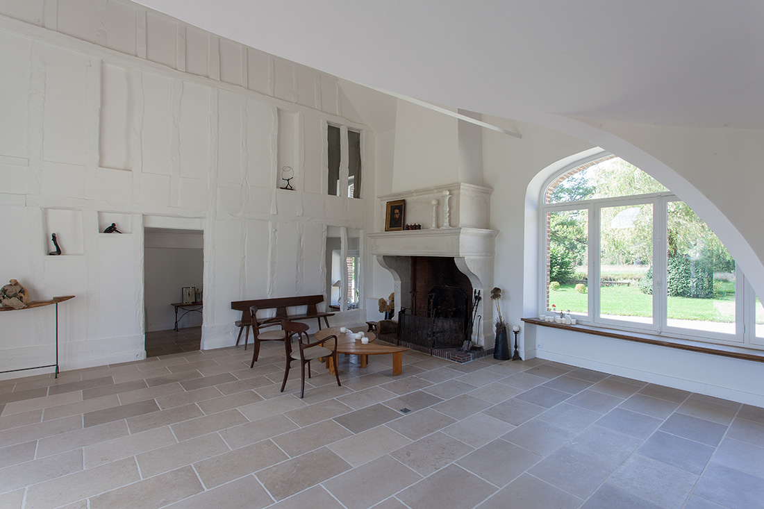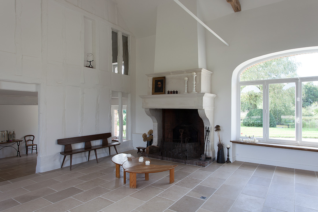 La renaissance du lieu s’appuie sur un dialogue subtil entre tradition et innovation. La noble pierre de Bourgogne au sol dissimule un système de chauffage moderne alimenté par une chaudière à bois écologique. Les murs à colombages, témoins de l’architecture locale, trouvent une nouvelle vie sous une peinture monochrome contemporaine. La toiture, entièrement repensée, marie tuiles plates de réemploi et isolation performante.