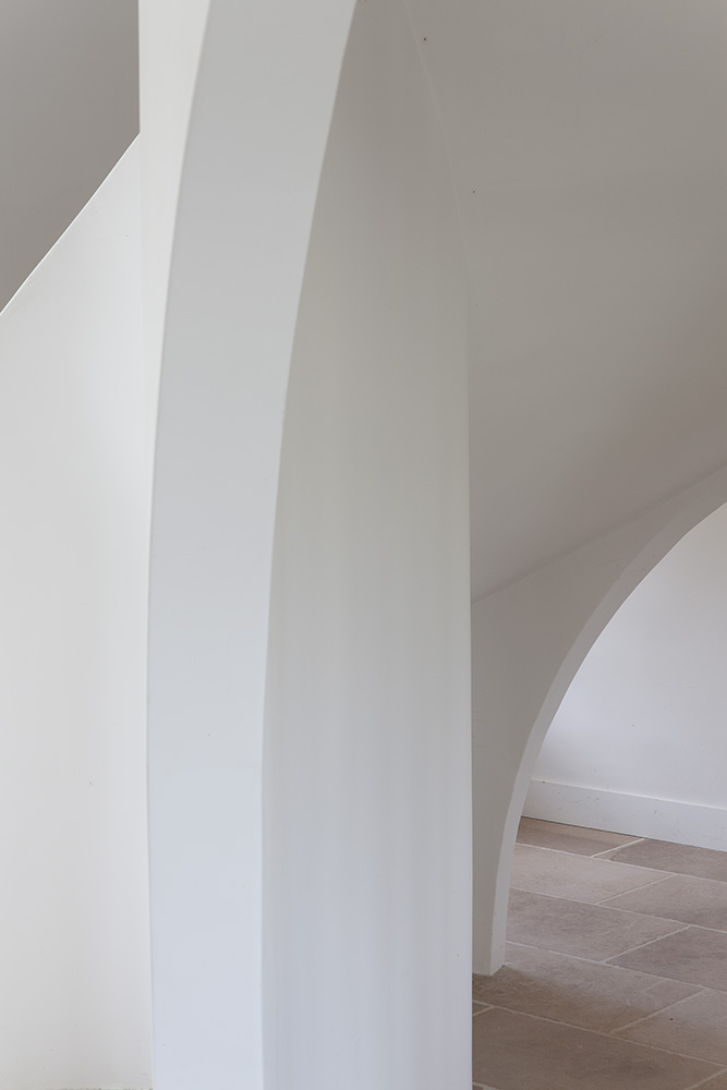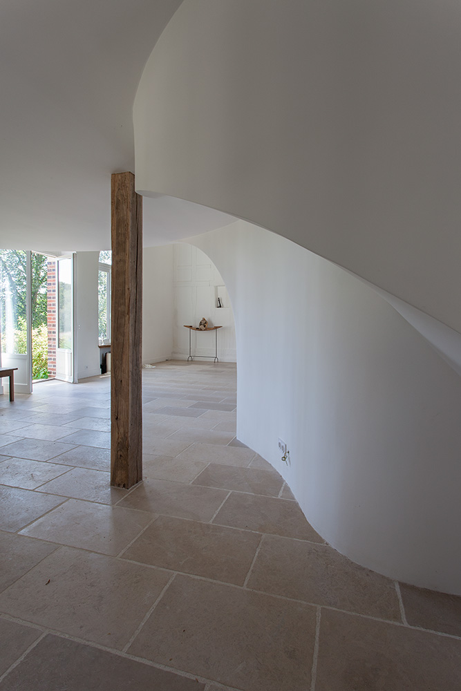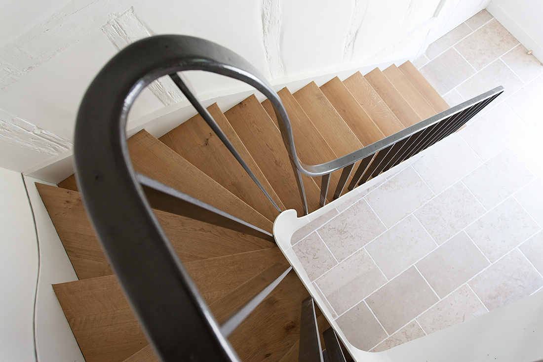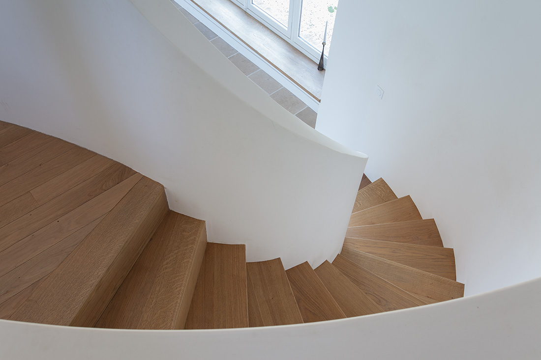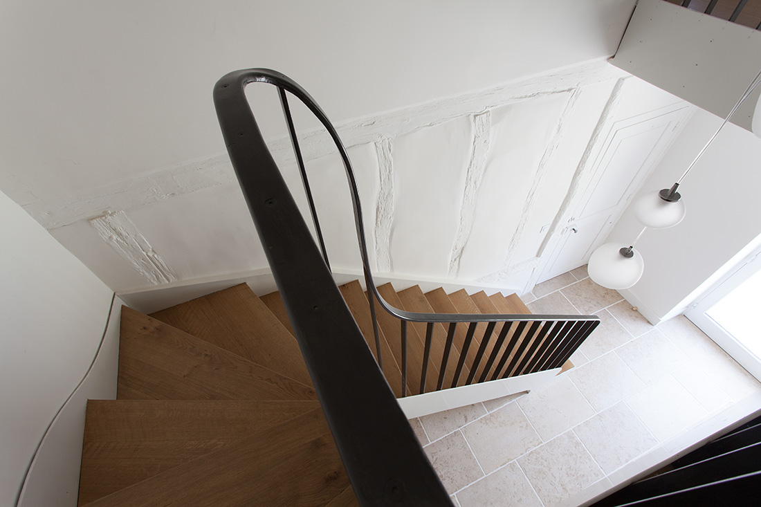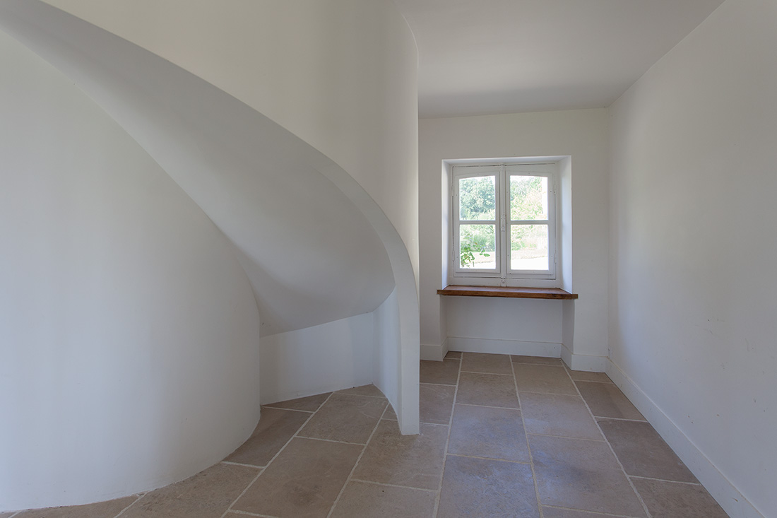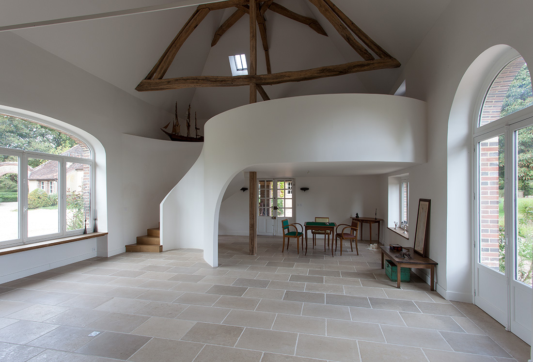 L’introduction d’éléments architecturaux contemporains – comme la mezzanine sculpturale du salon et l’escalier principal au dessin affirmé – apporte une touche de modernité maîtrisée. Ces interventions contemporaines s’intègrent harmonieusement à l’ensemble, créant des espaces de vie où le confort moderne sublime l’authenticité historique.