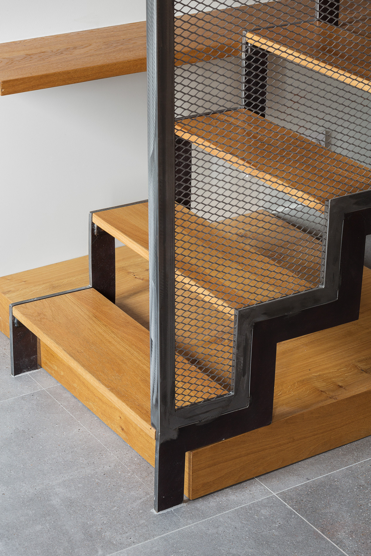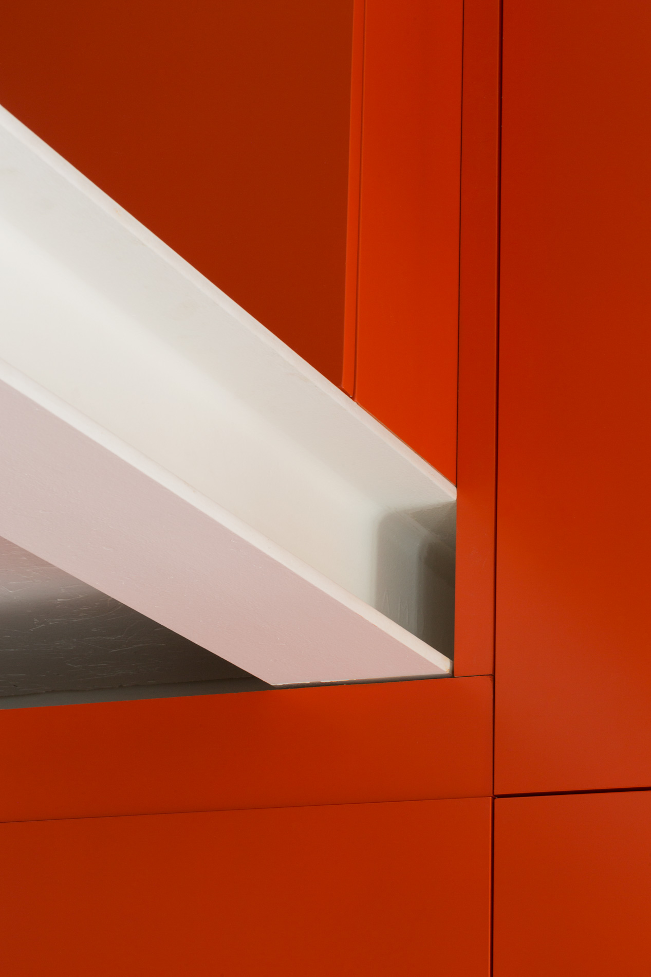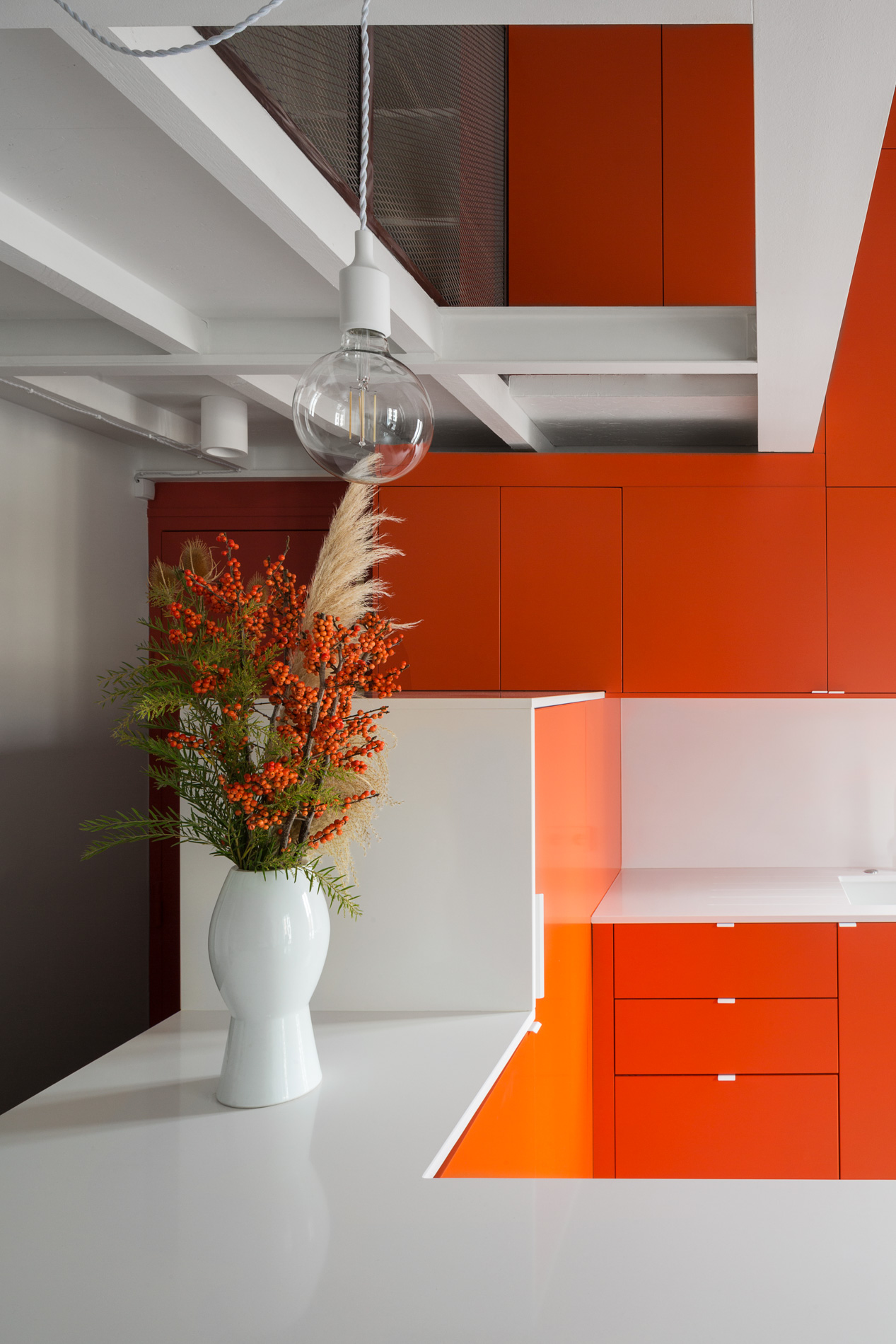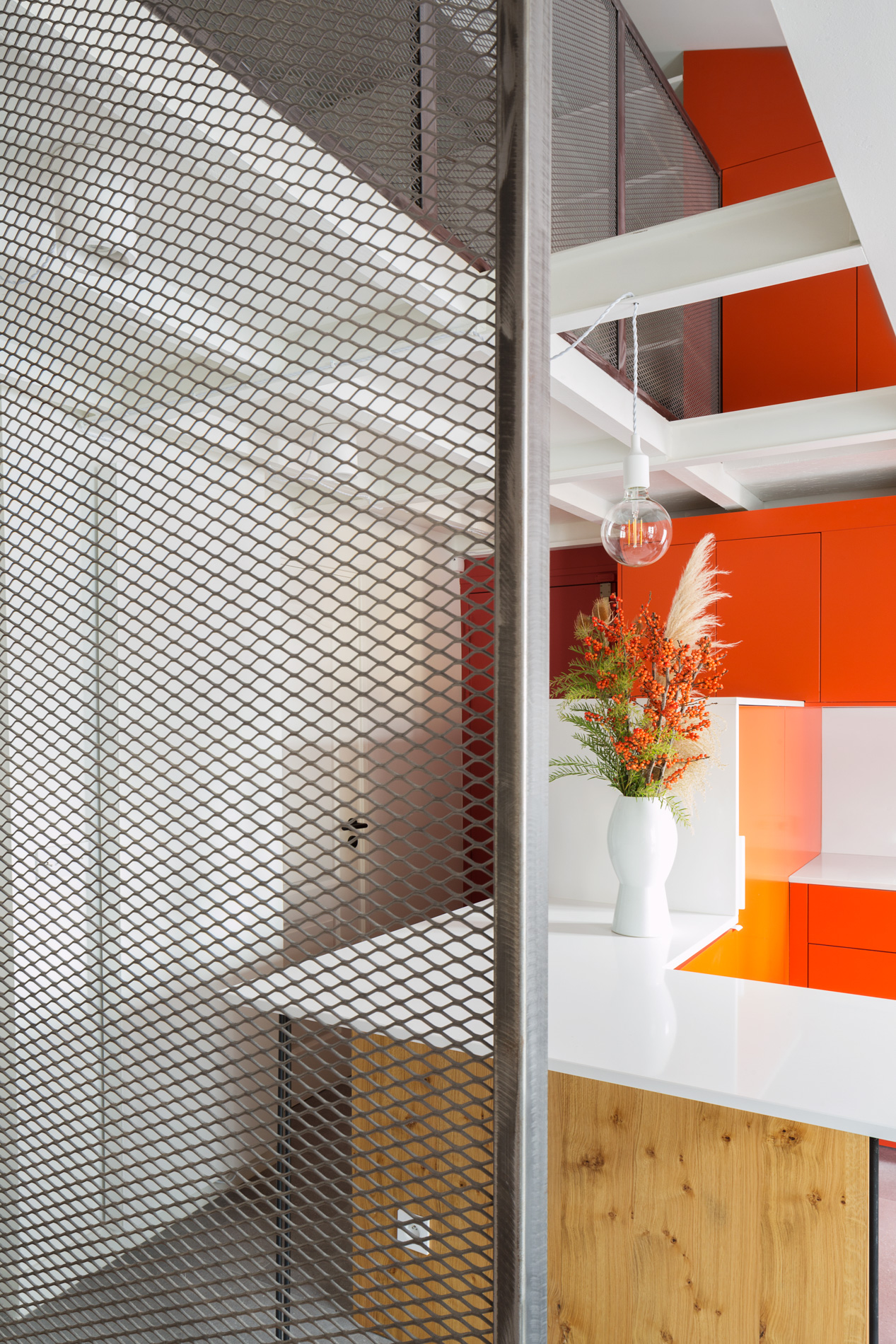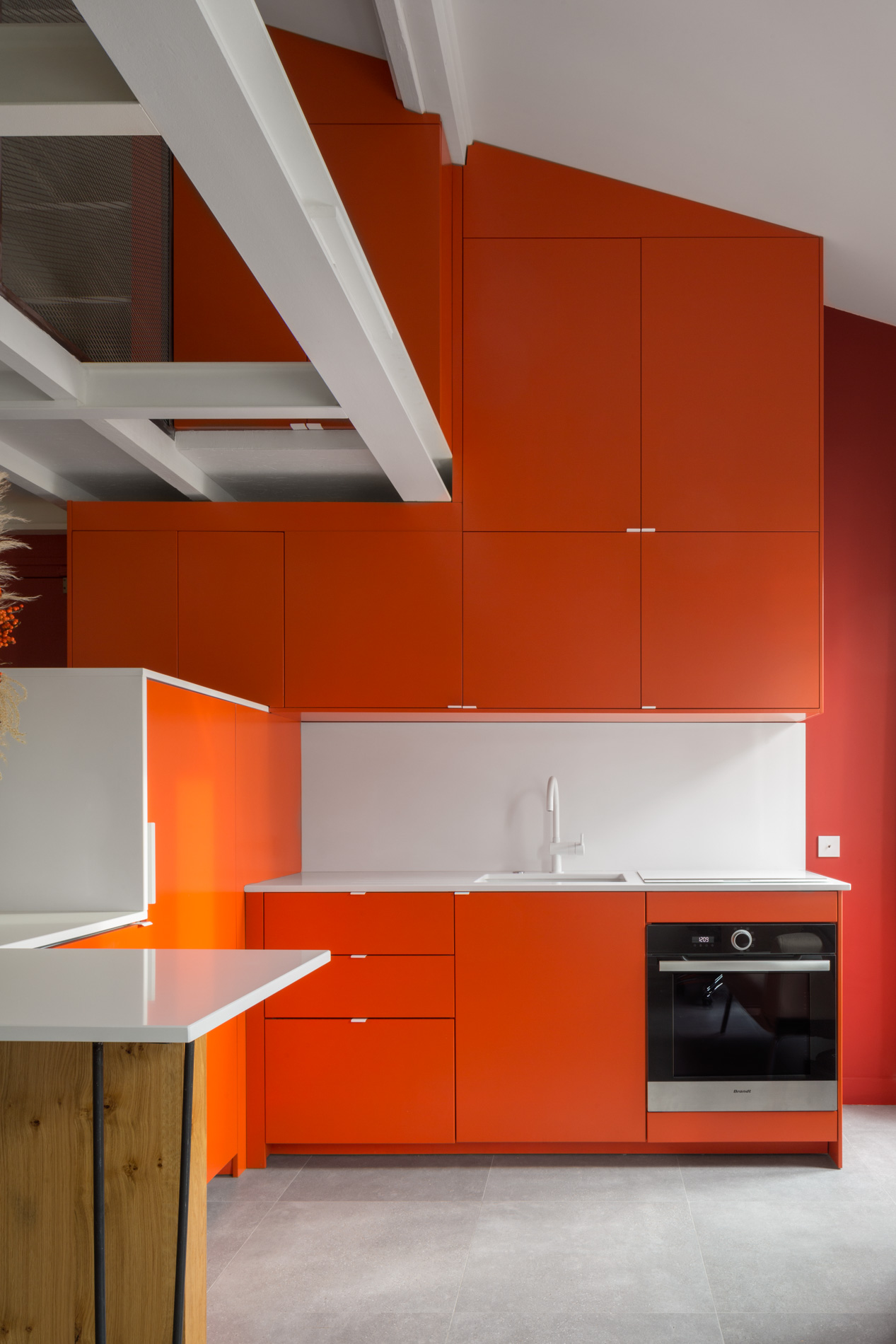 Notre client souhaitait une ambiance très pop. Nous avons fait le choix d’un dialogue audacieux entre l’acier et des touches d’orange vif. Cette palette chromatique combinée à la générosité de la lumière naturelle, crée une atmosphère résolument contemporaine et accueillante.