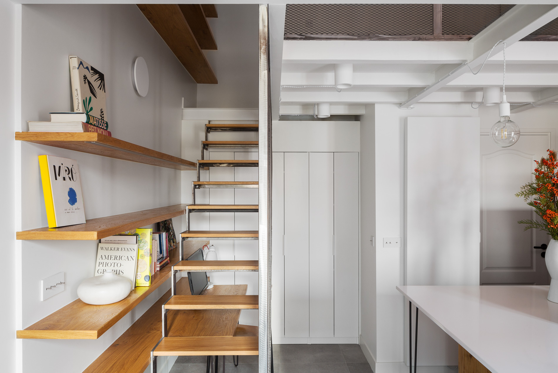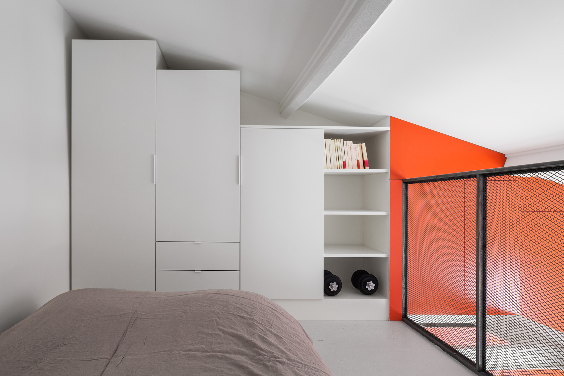 Ce studio de 30m² illustre comment la conquête de la verticalité peut transformer un petit espace en un lieu de vie généreux et dynamique. La récupération des combles a permis de créer une double hauteur, offrant non seulement une mezzanine mais aussi une multitude de solutions de rangement ingénieuses.