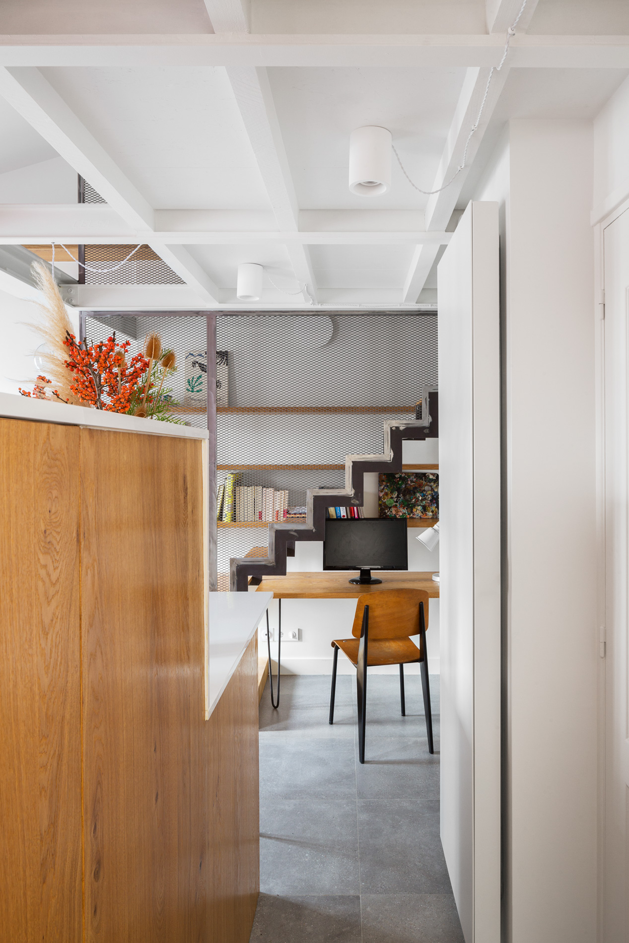 L’aménagement est un exercice d’optimisation où chaque centimètre est exploité avec intelligence : un bureau se glisse sous l’escalier, des étagères grimpent jusqu’au plafond, un dressing trouve sa place sous les rampants, tandis qu’un placard s’intègre naturellement sous la mezzanine. Cette stratégie d’aménagement libère l’espace central, préservant ainsi une sensation de volume et de fluidité.