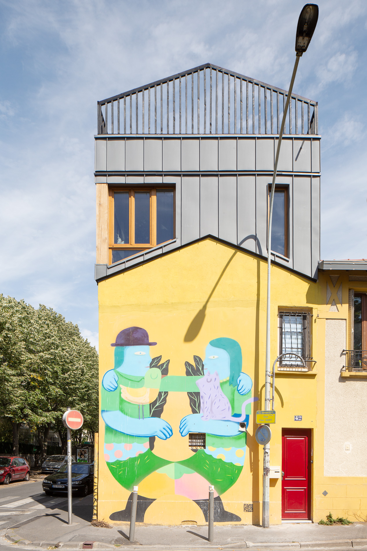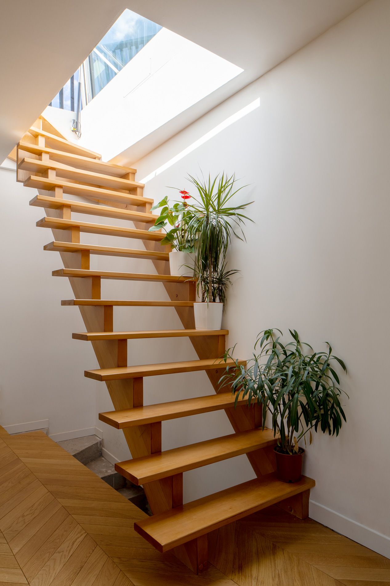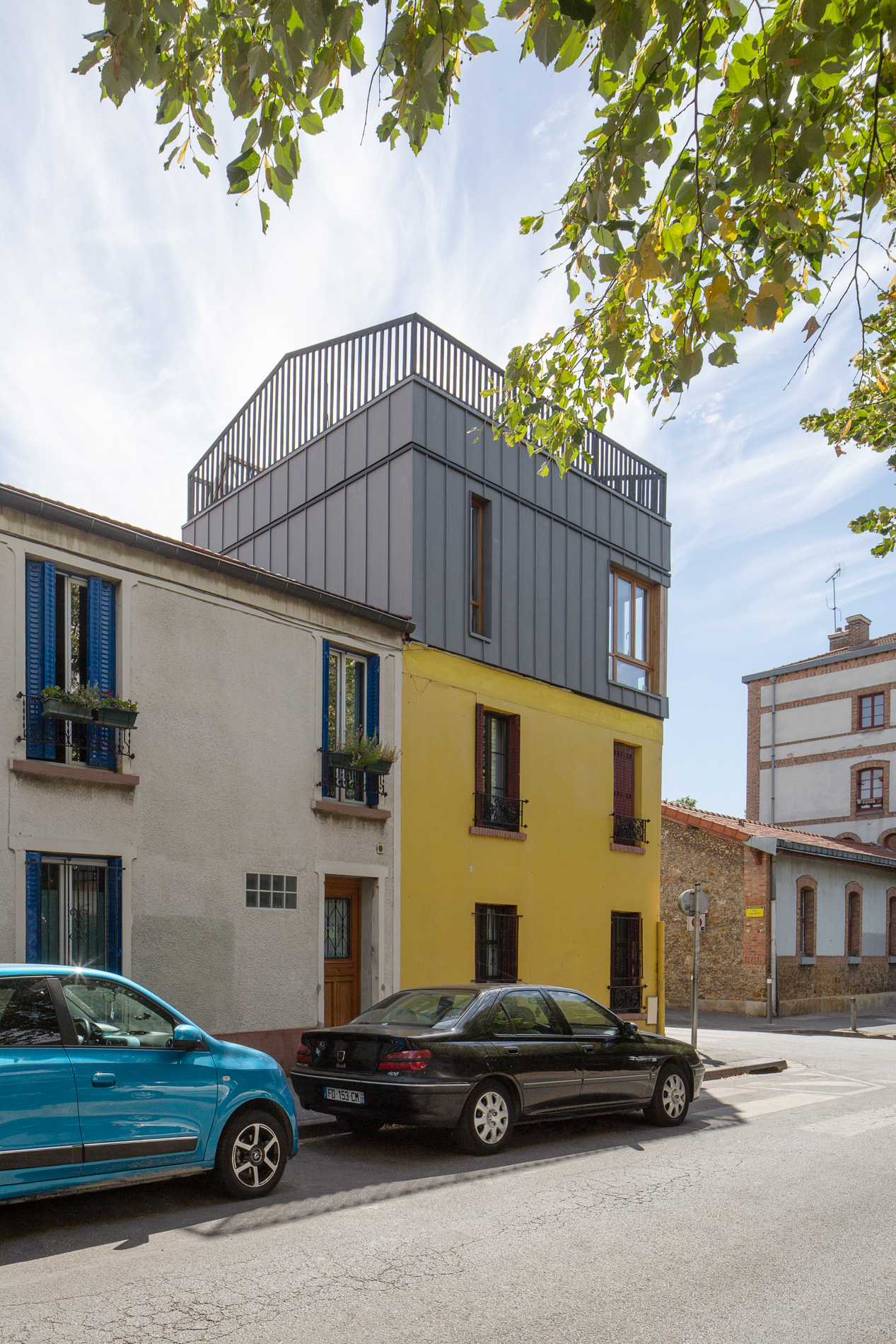 Cette surélévation contemporaine réinvente l’art de vivre en inversant les codes traditionnels : le séjour, placé en hauteur, devient un espace baigné de lumière naturelle s’ouvrant sur un toit-terrasse panoramique. Le nouveau volume dialogue harmonieusement avec la maison existante, préservant l’identité architecturale du quartier tout en y ajoutant une touche de modernité.