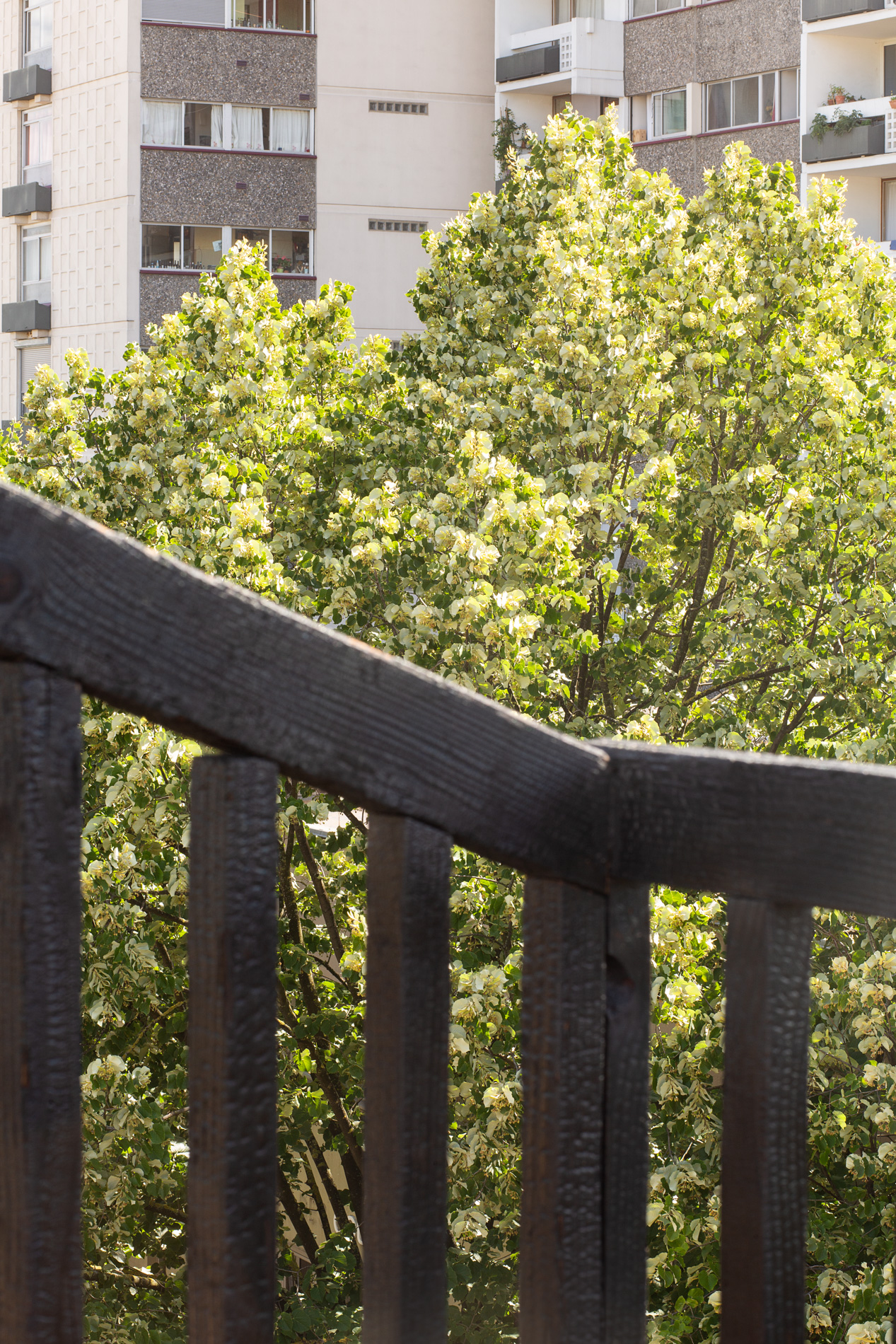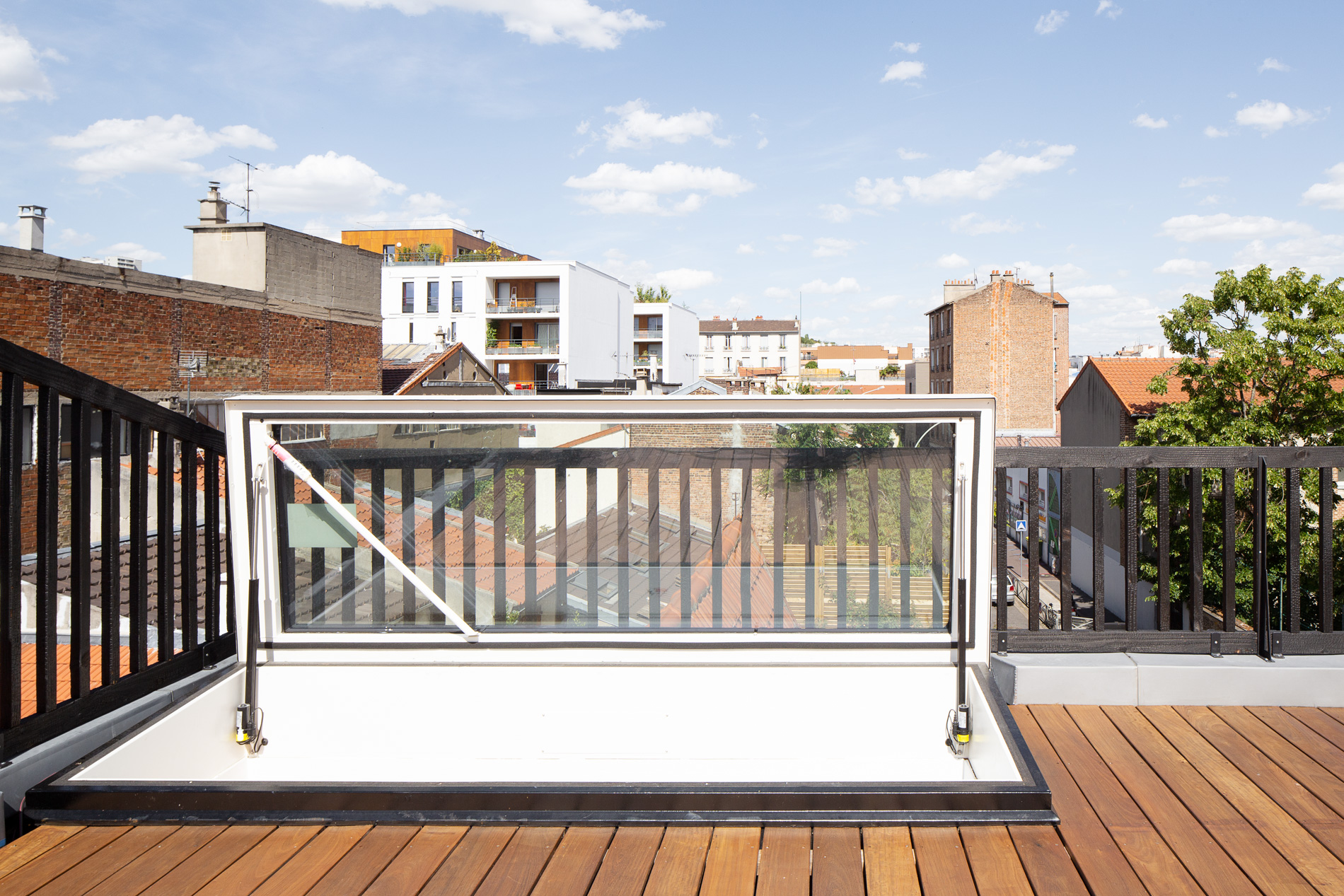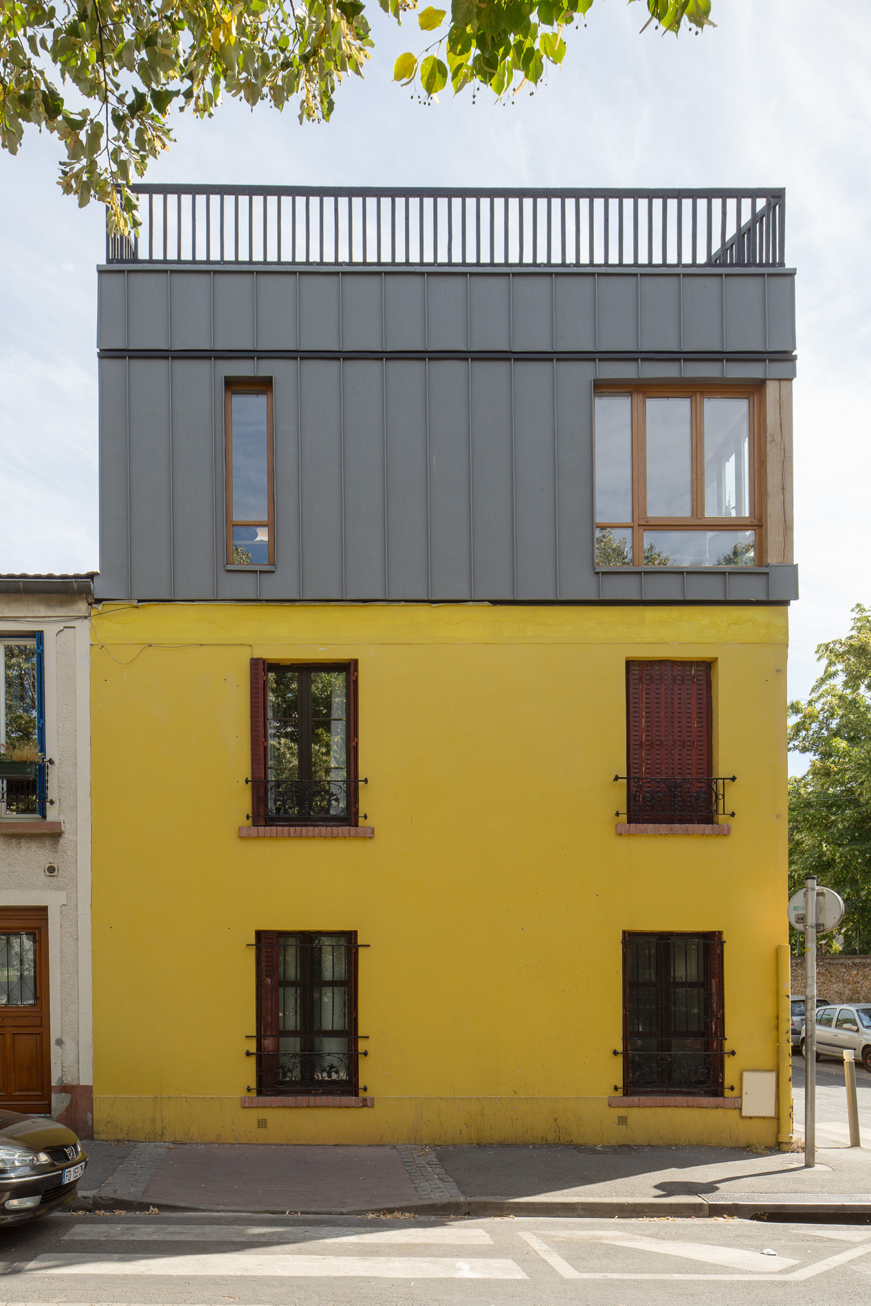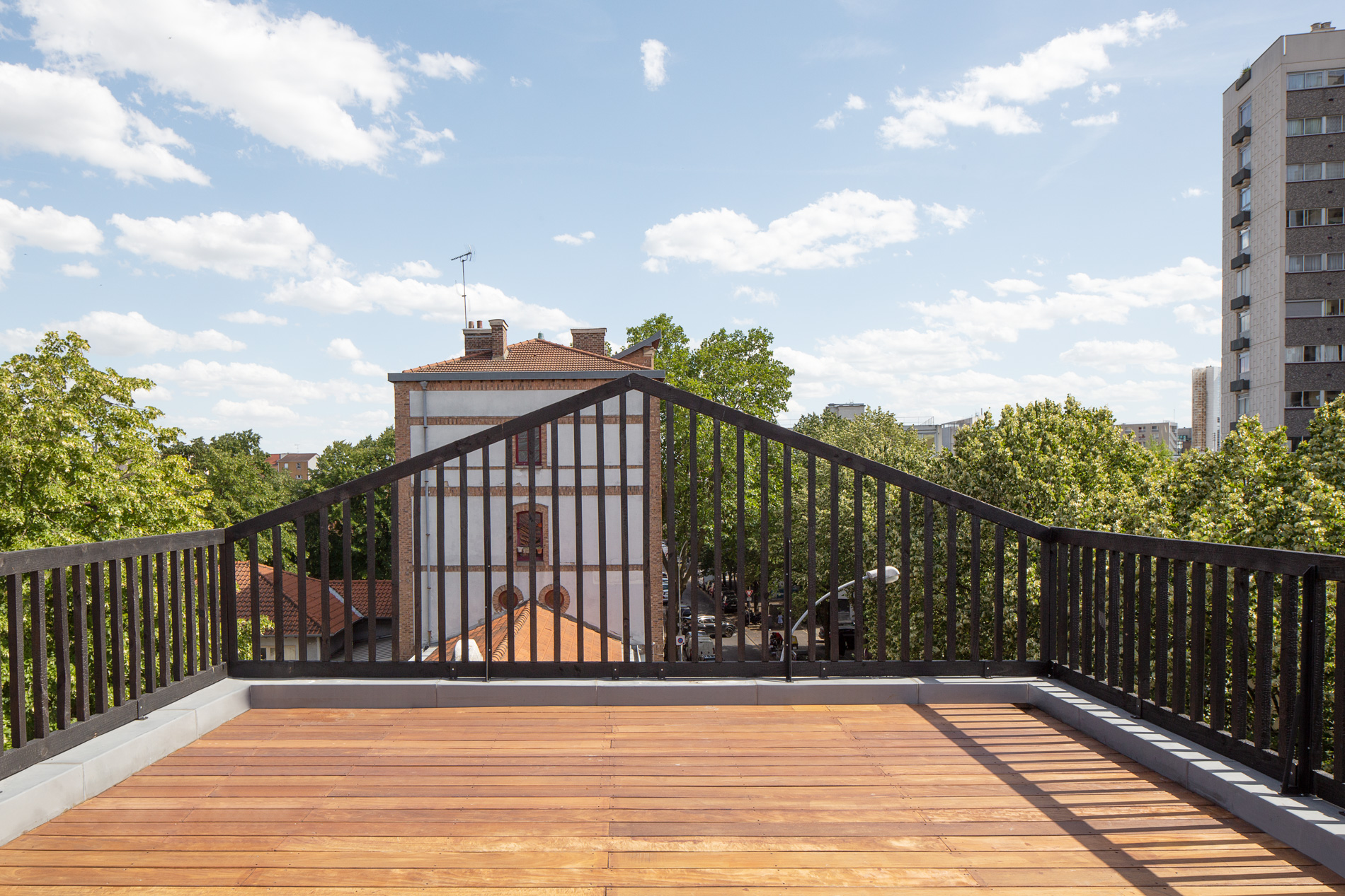 L’engagement environnemental se manifeste dans chaque choix de matériaux : ossature et isolation en bois pour un confort thermique optimal, menuiseries en chêne local, et gardes-corps en bois brulé traité selon l’ancestrale technique japonaise du Shou Sugi Ban. Les façades, habillées d’un bardage en zinc, s’inscrivent dans la tradition architecturale francilienne tout en affirmant leur contemporanéité.