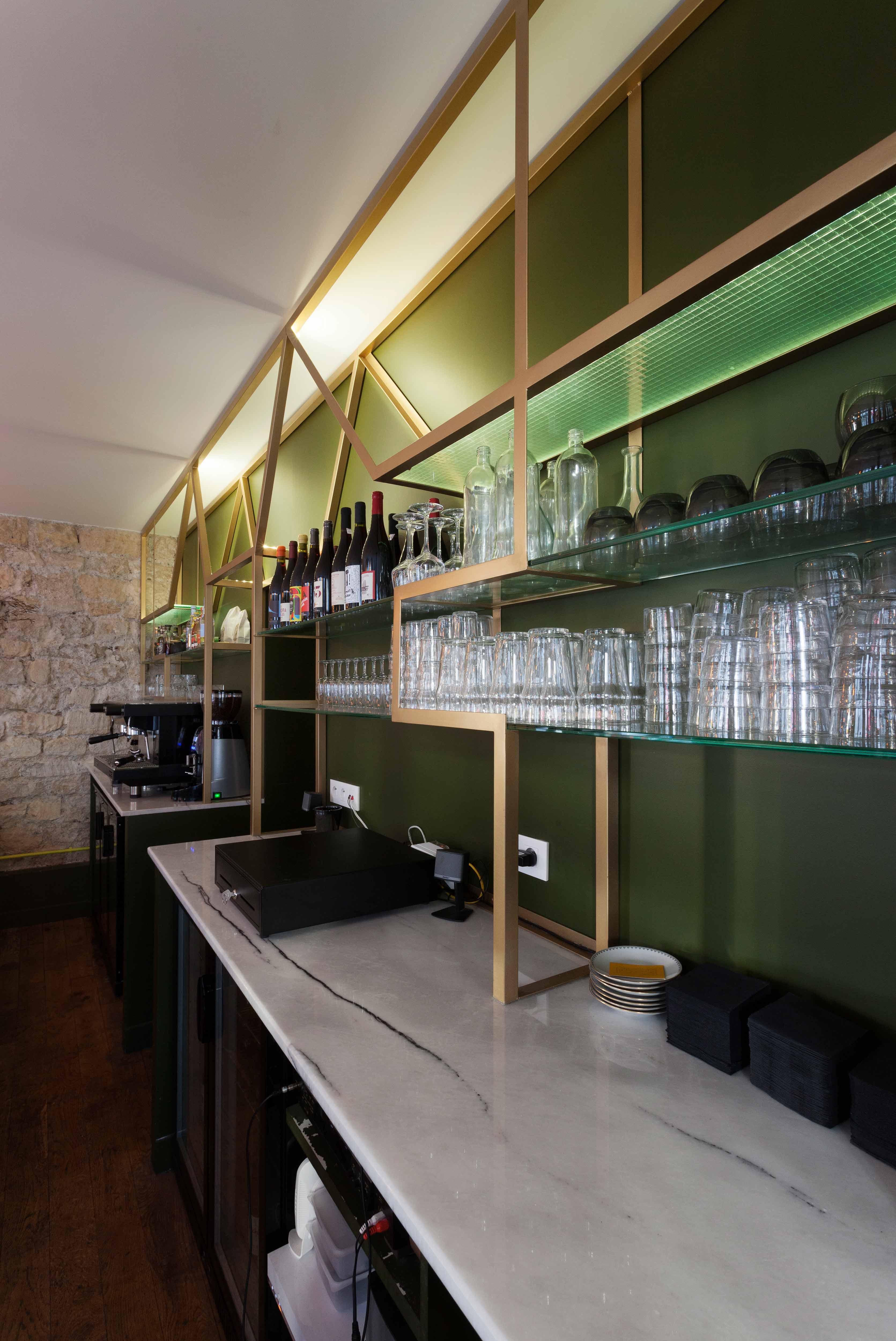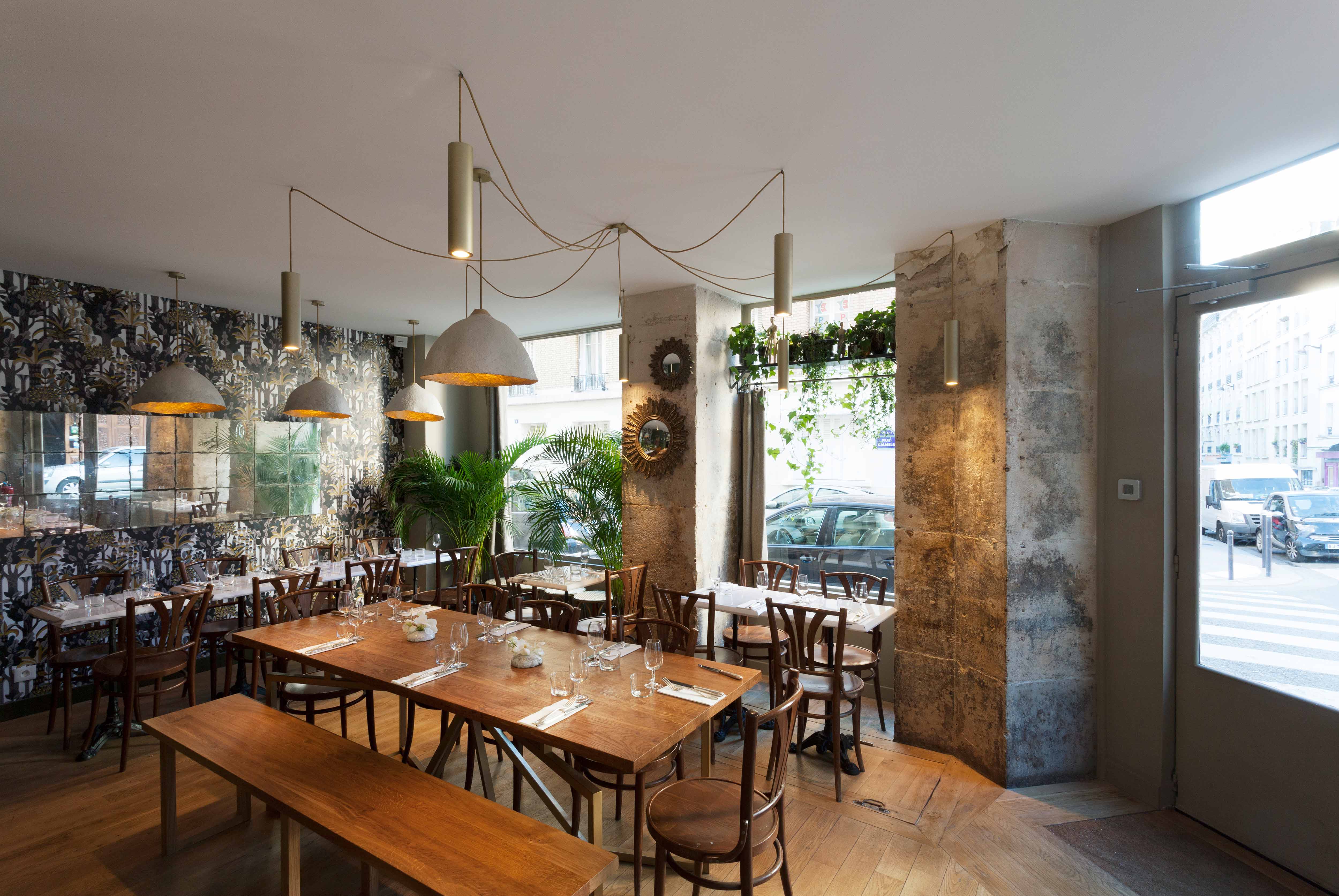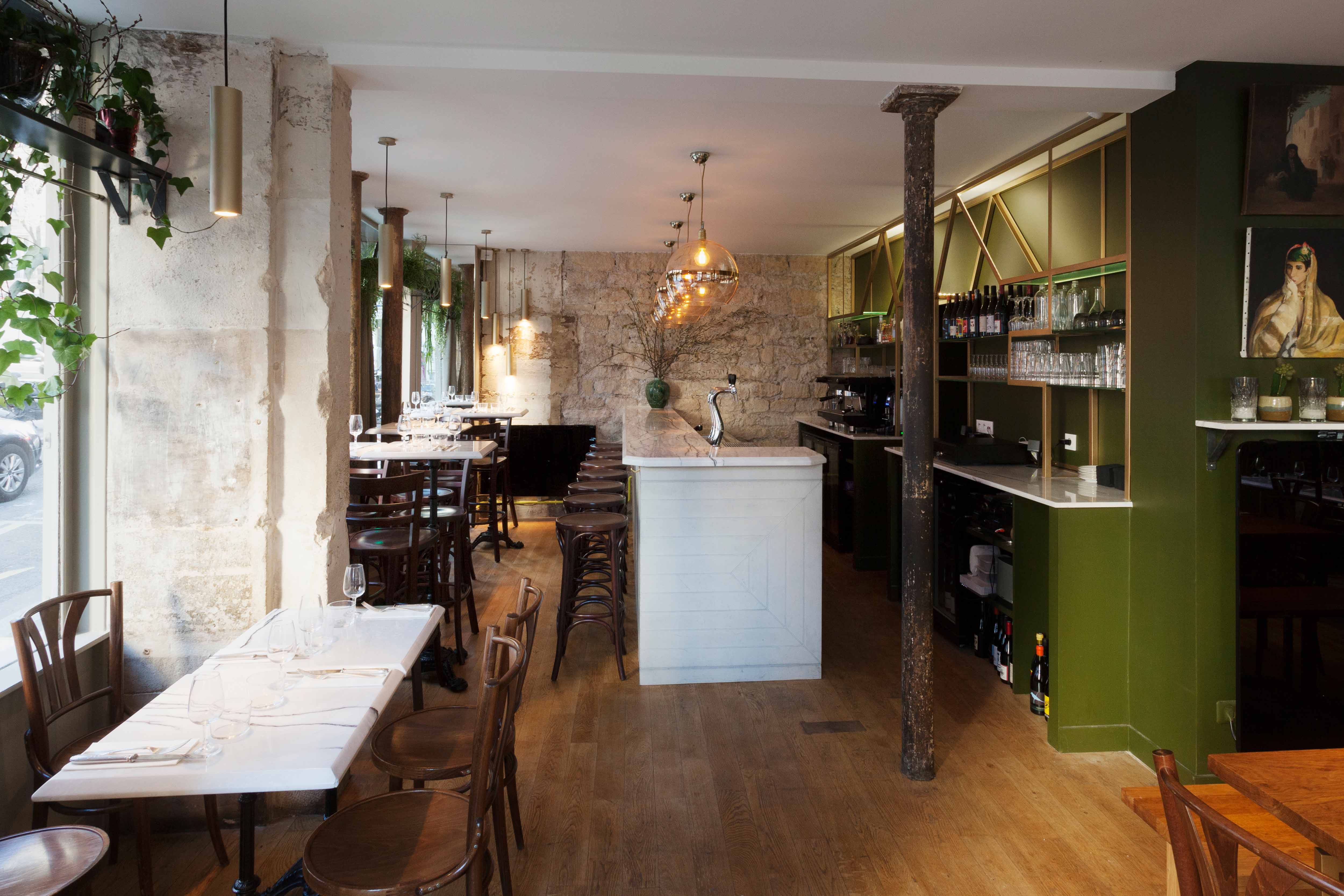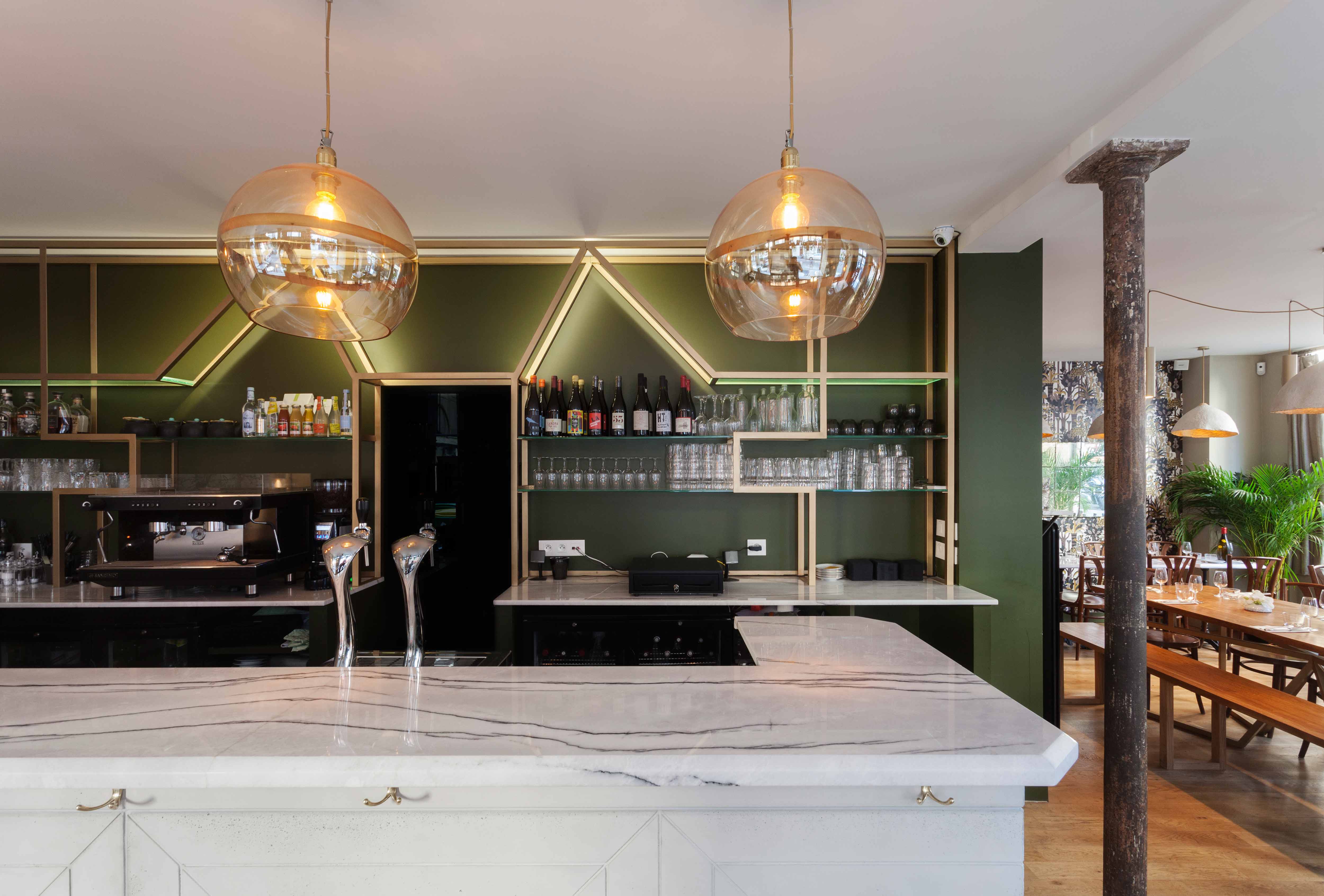 Une grande table d’hôte fait le lien entre ces deux univers, son piètement doré reprenant les motifs géométriques de l’arrière-bar. Une scénographie végétale court le long des vitrines, visible depuis la rue, unifiant l’ensemble tout en créant un filtre naturel.