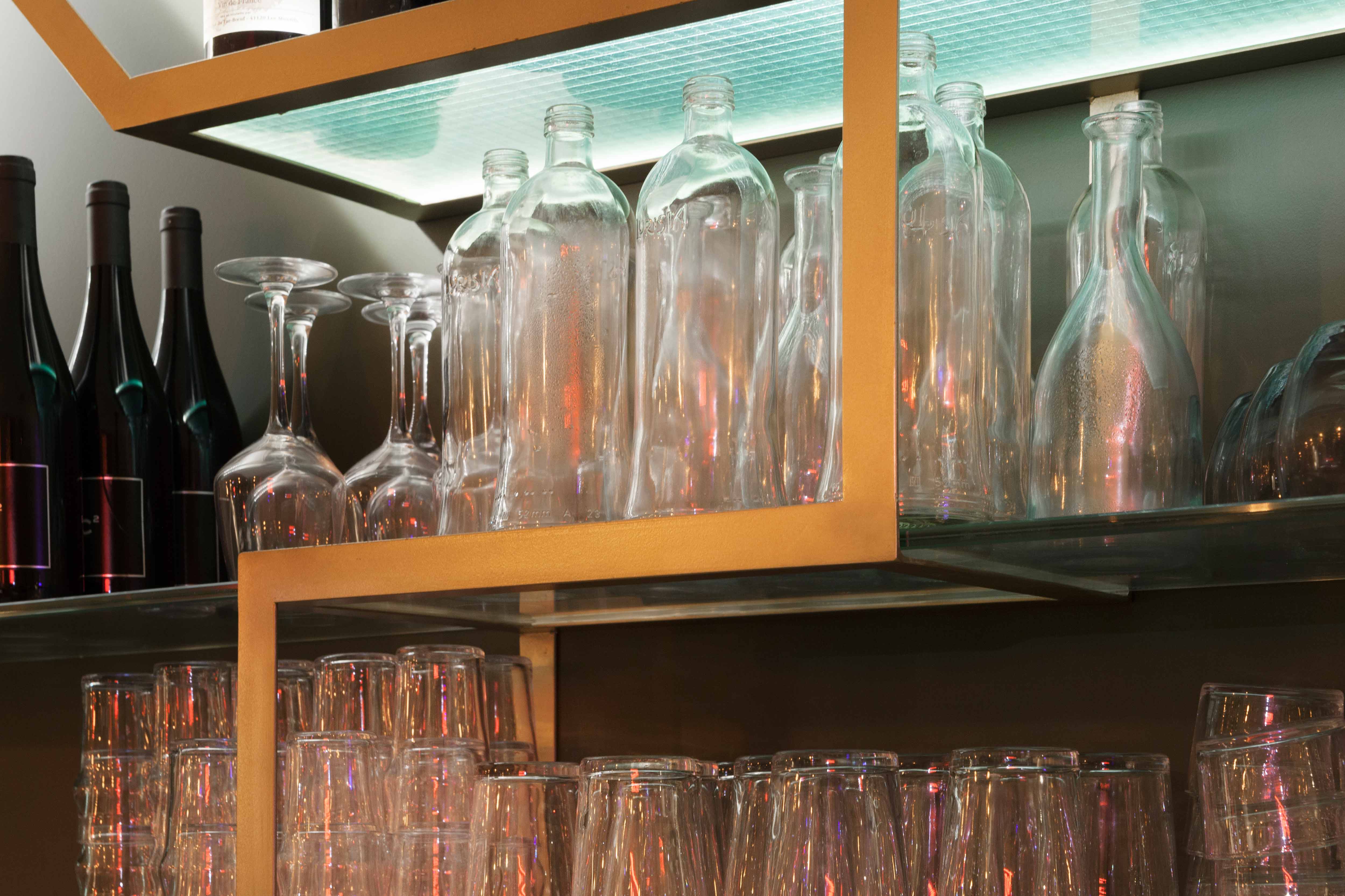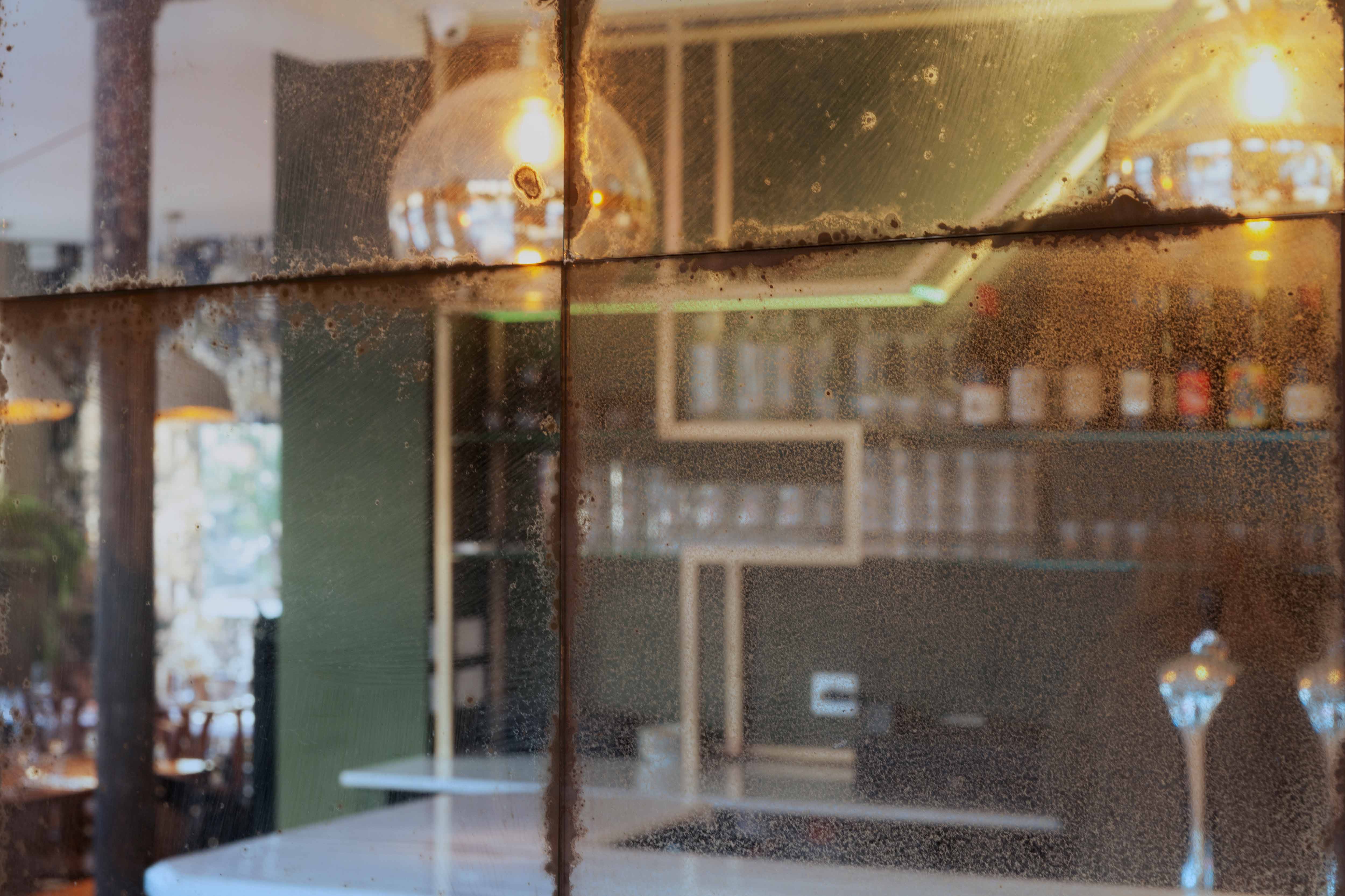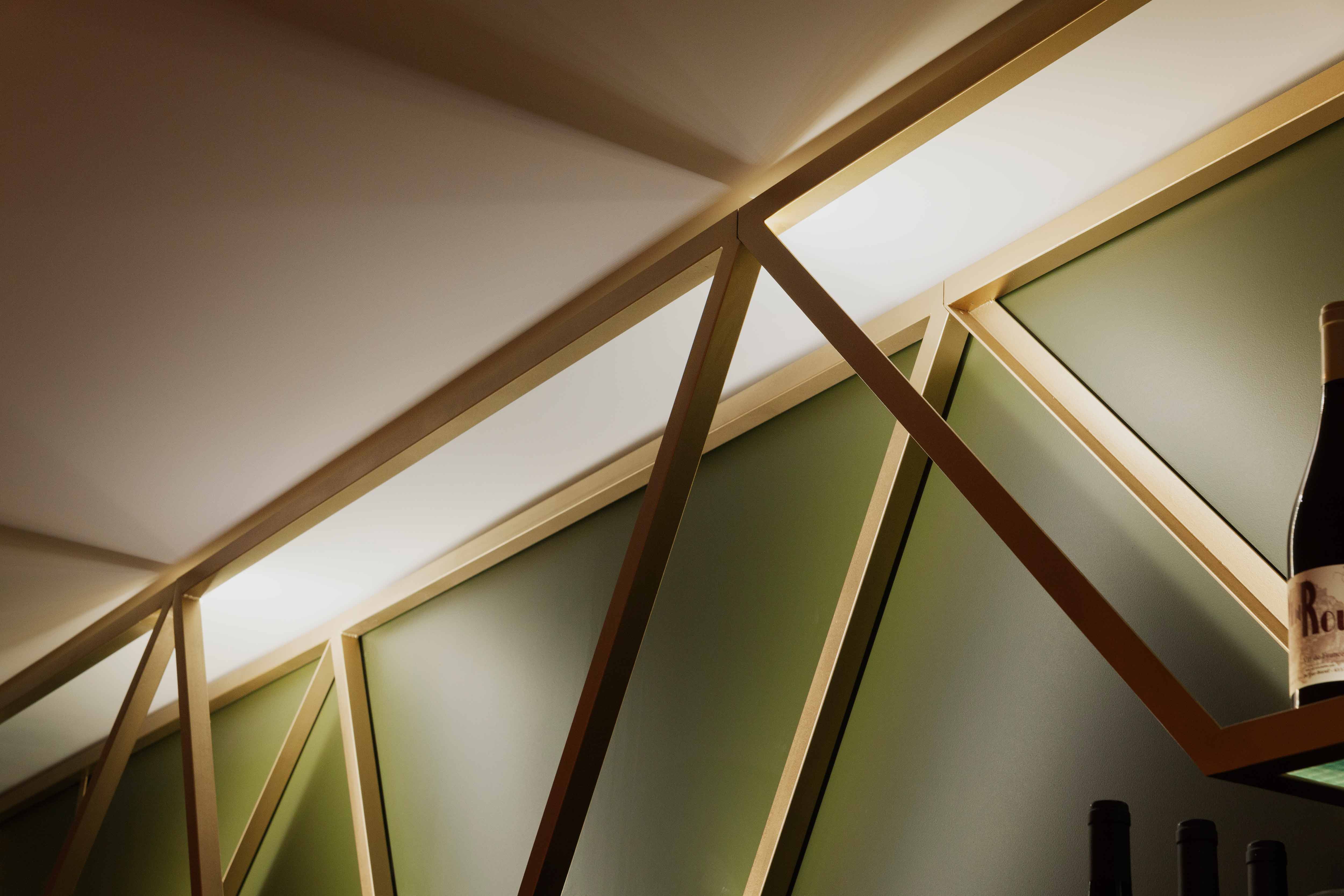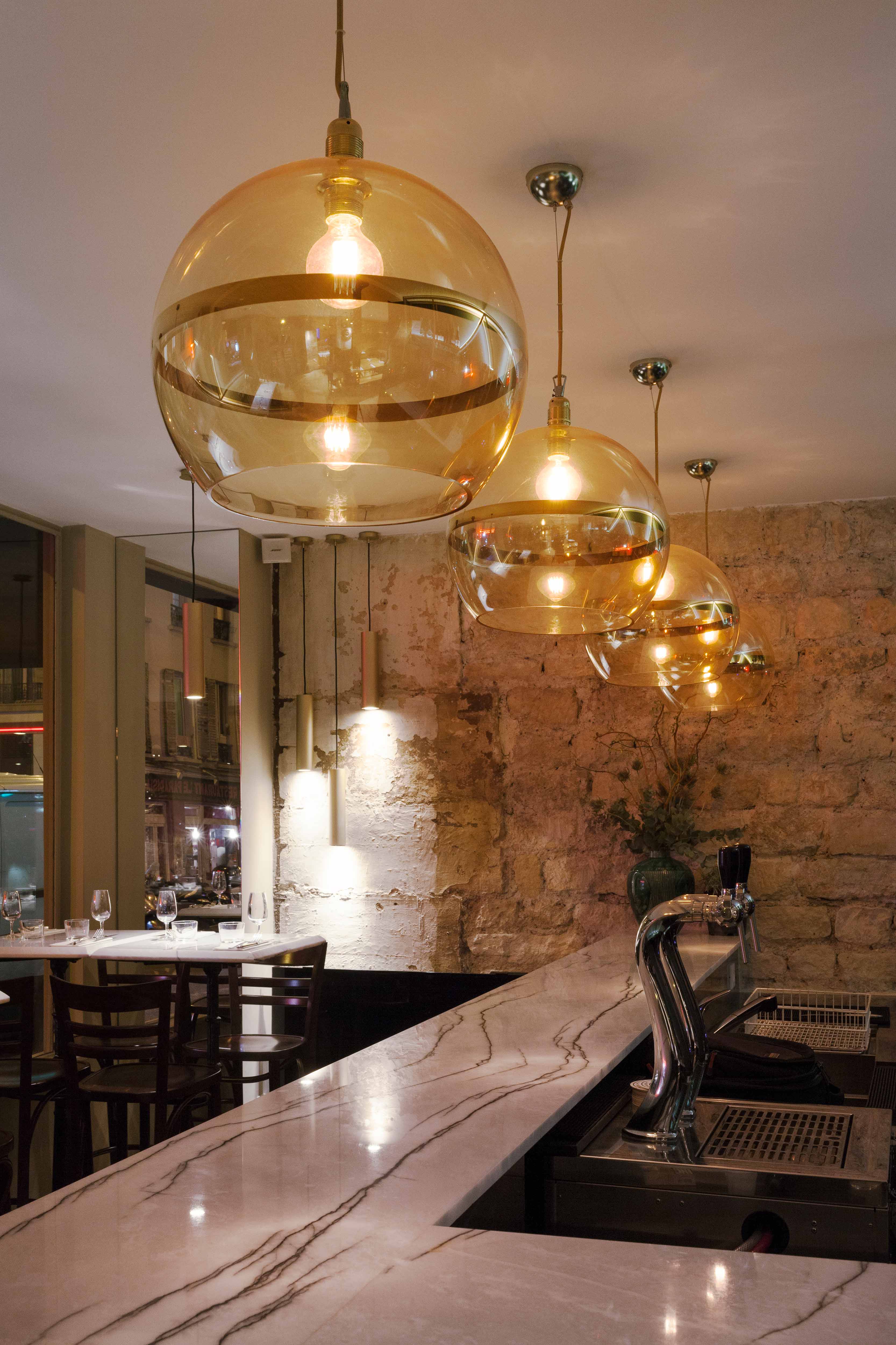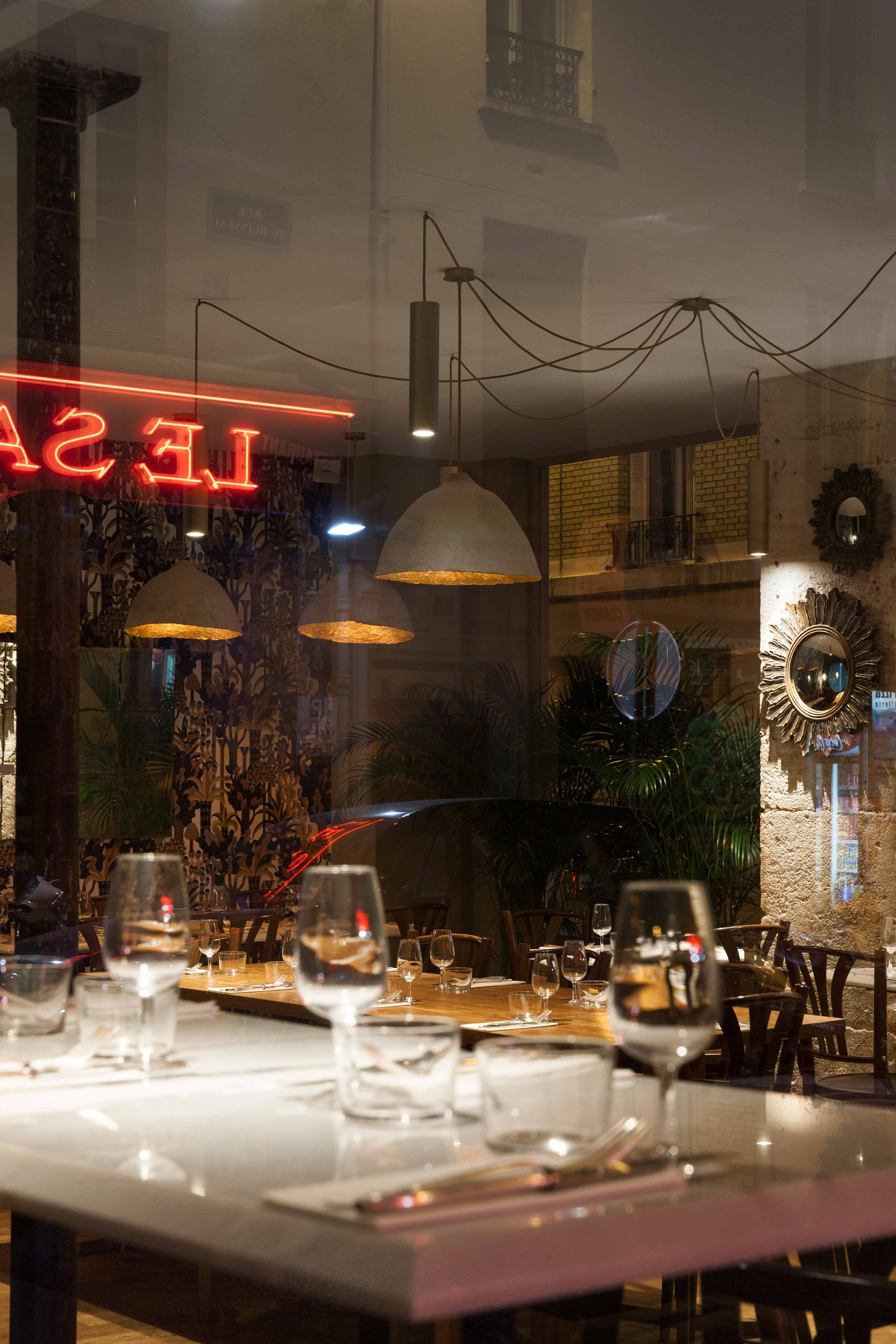 Une grande table d’hôte fait le lien entre ces deux univers, son piètement doré reprenant les motifs géométriques de l’arrière-bar. Une scénographie végétale court le long des vitrines, visible depuis la rue, unifiant l’ensemble tout en créant un filtre naturel.