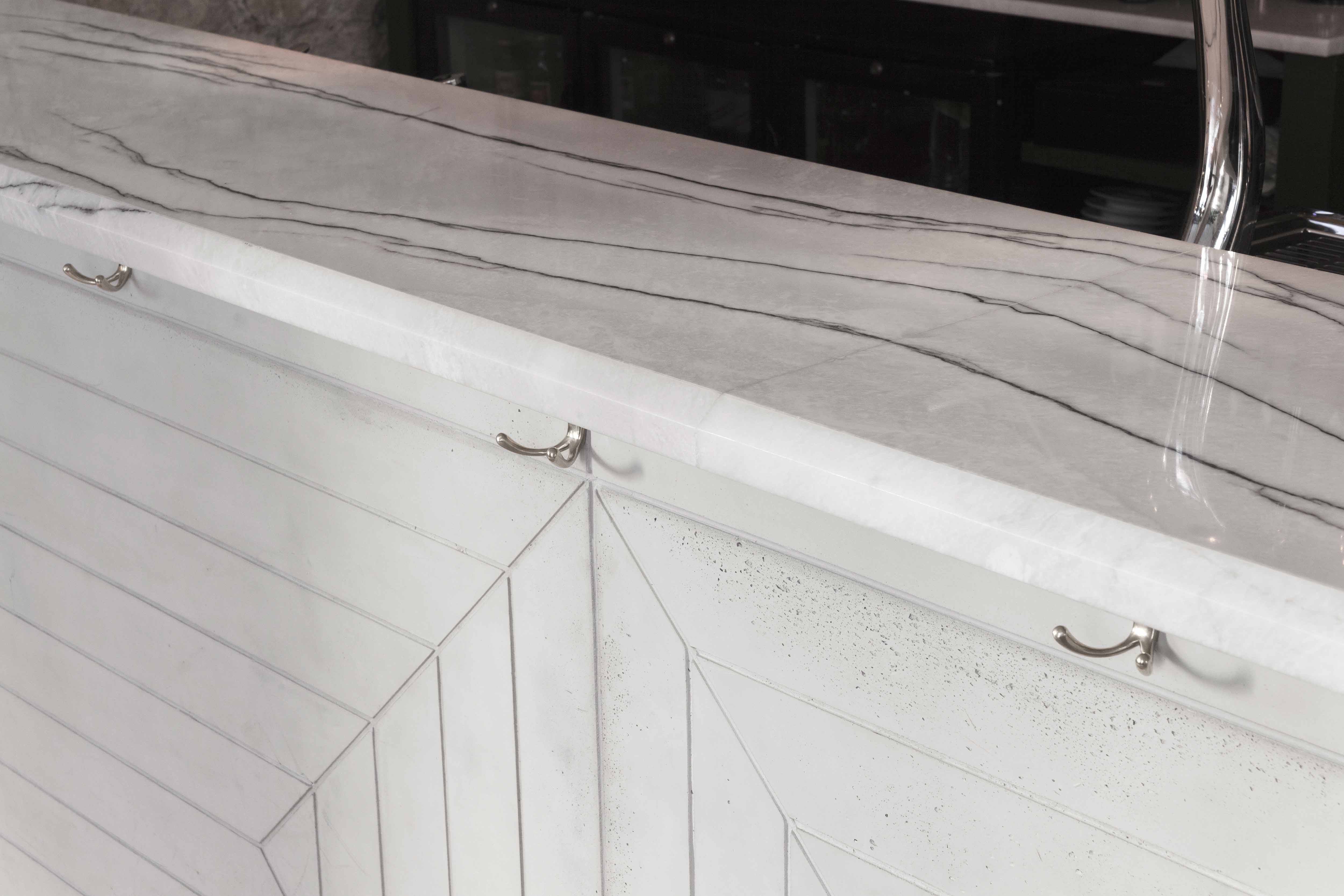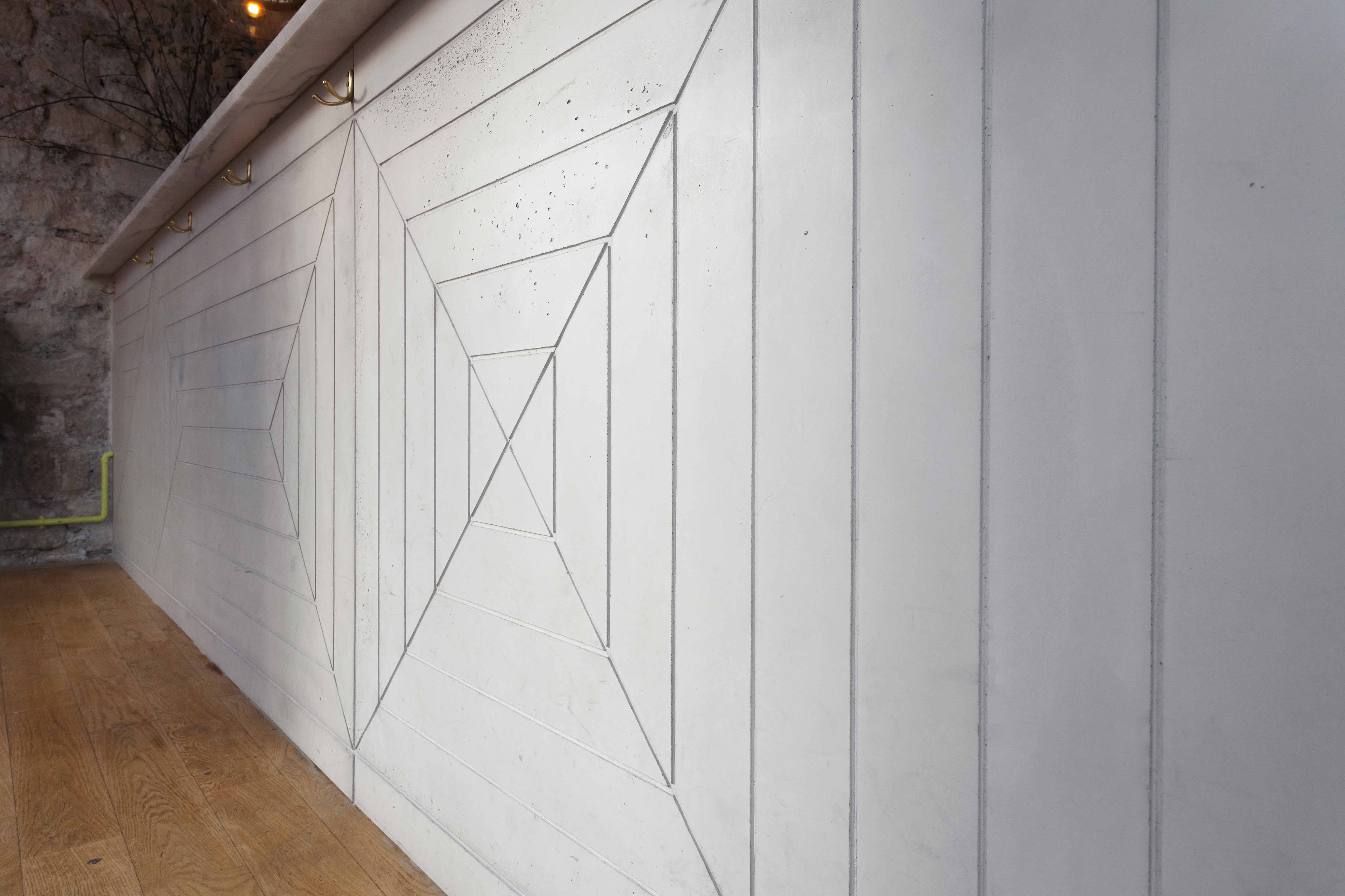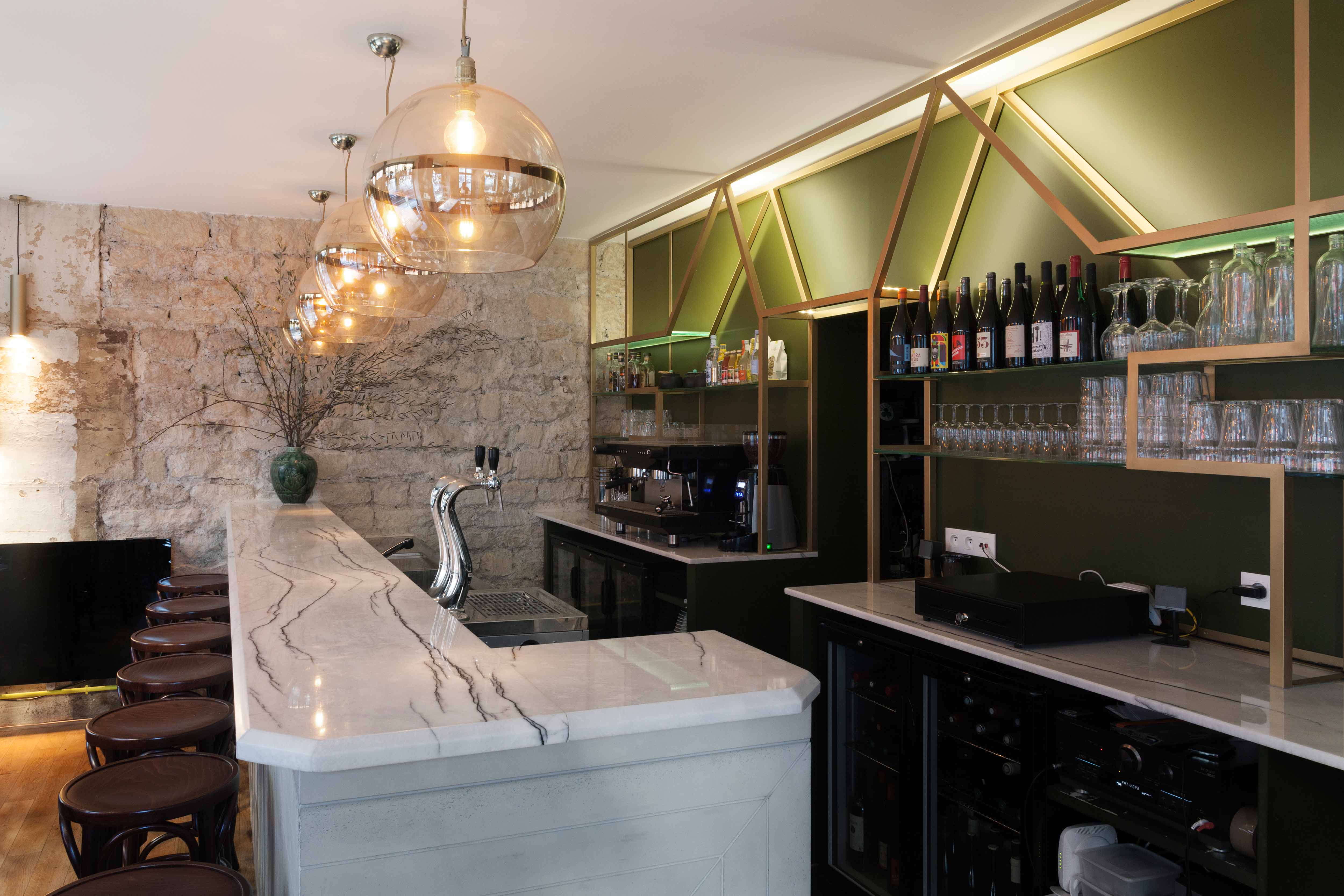 Le bar s’affirme comme une pièce maîtresse du projet avec son comptoir monumental de quatre mètres en marbre blanc veiné de noir, reposant sur un socle en béton banché brut. En toile de fond, un mur-étagère en laiton déploie ses motifs géométriques, servant à la fois d’enseigne lumineuse et de présentoir. L’espace est rythmé par des tables hautes qui invitent à une convivialité décontractée.