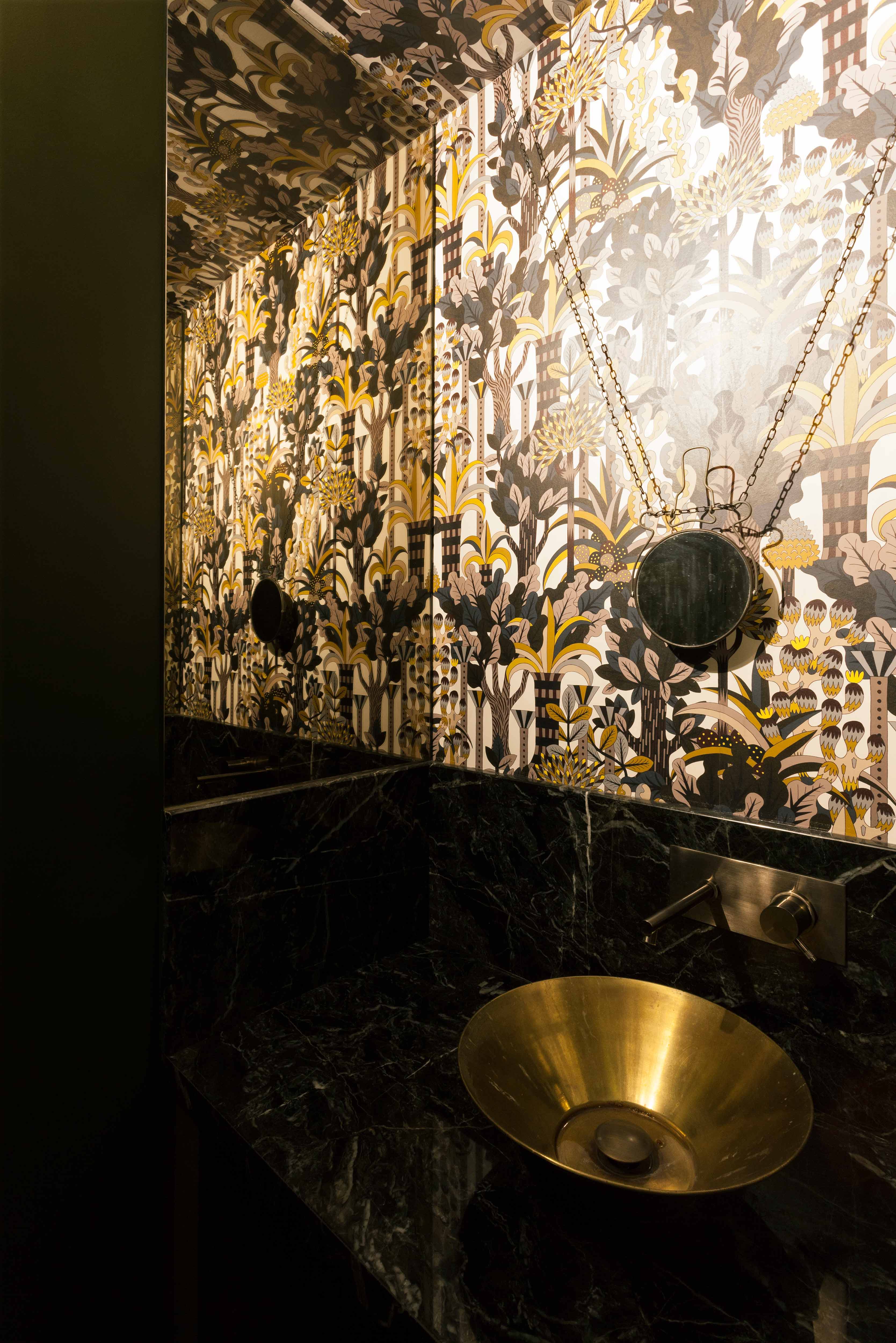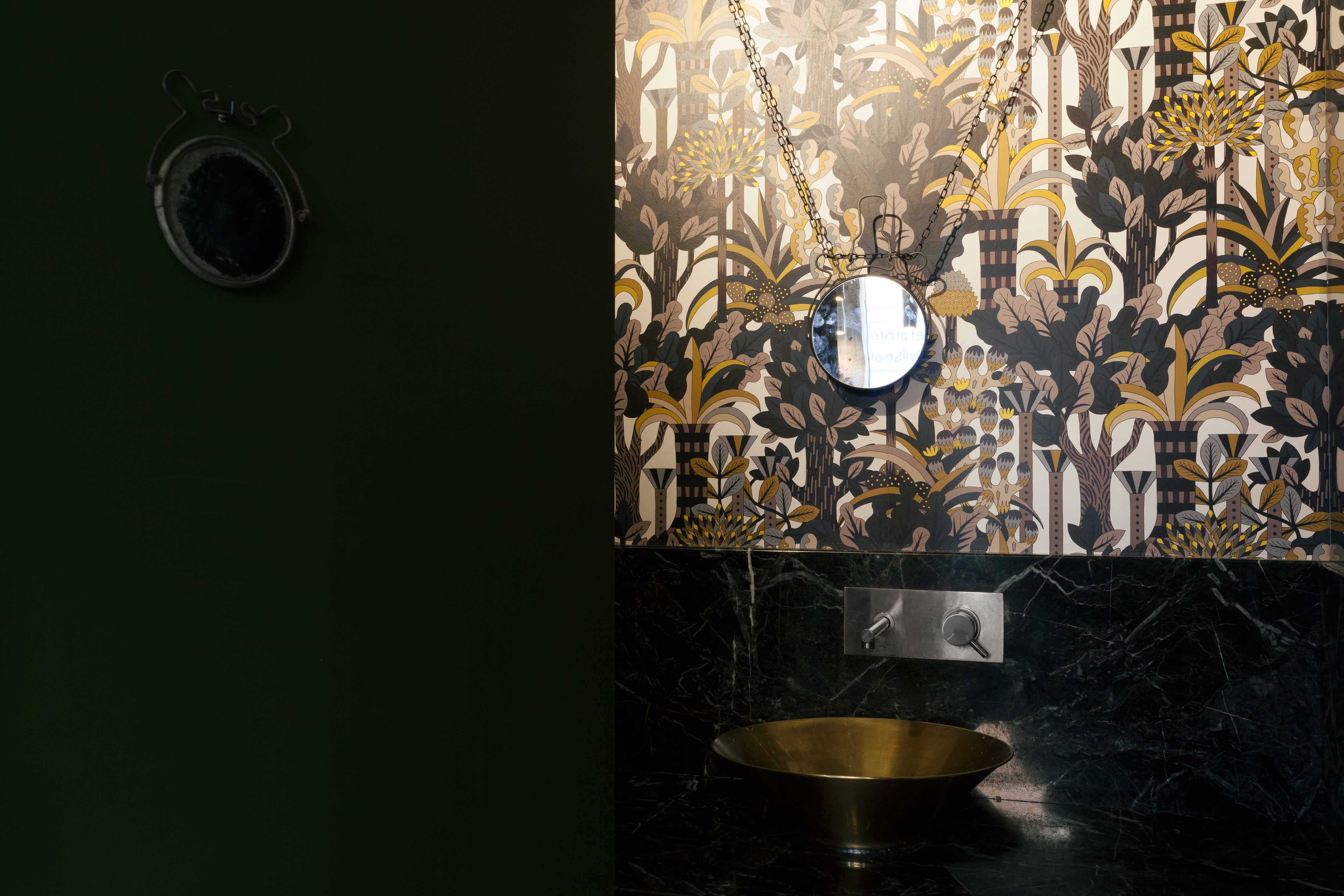 L’espace restauration cultive quant à lui une atmosphère plus intime. Un papier peint aux motifs végétaux luxuriants dialogue avec du mobilier chiné et des miroirs soigneusement disposés. Les tables bistrot, réalisées dans le même marbre que le comptoir, créent une continuité subtile entre les espaces.